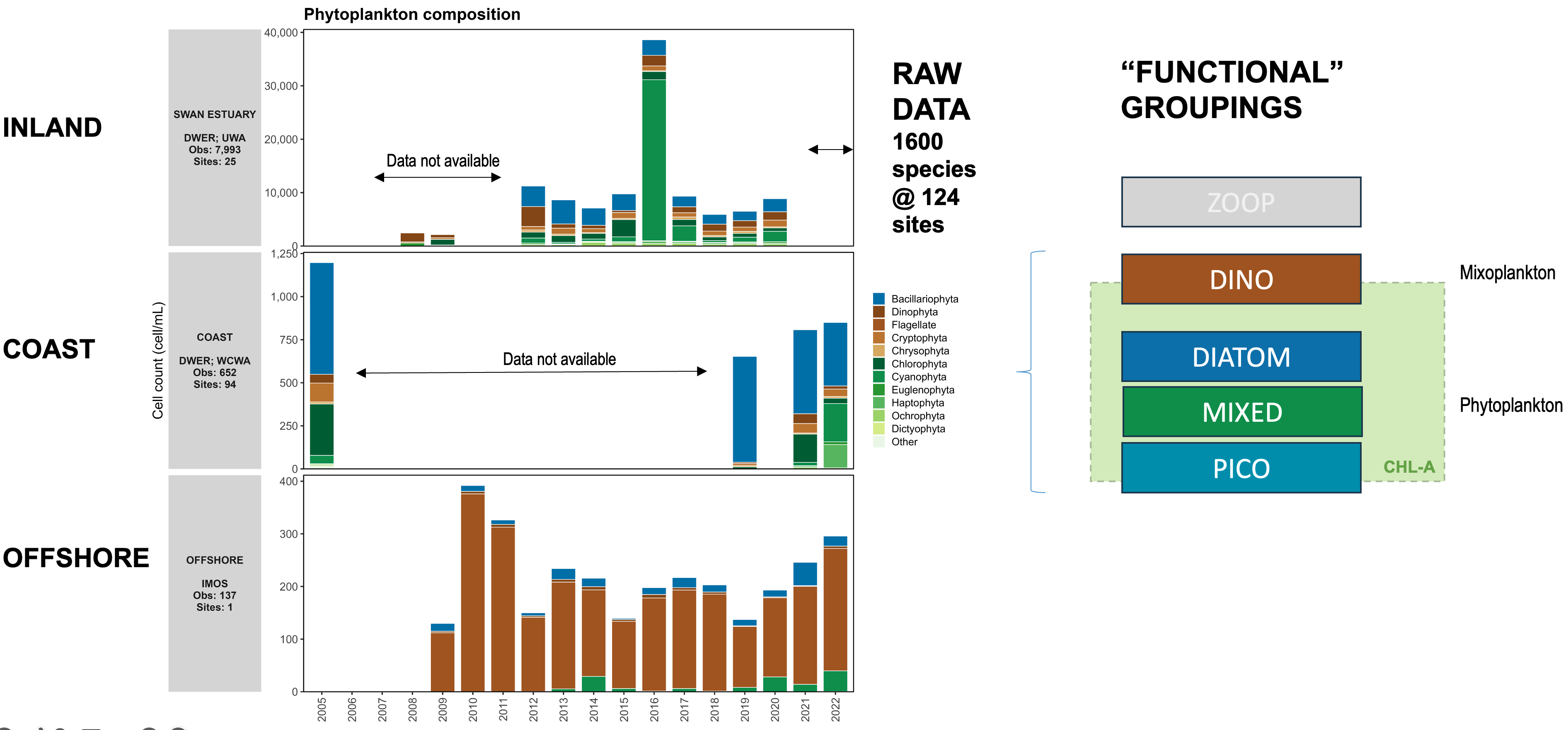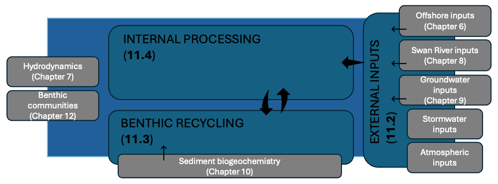 Developing such a model relies on a firm understanding of the broader physical environment (Chapter 7) and the many sources of nutrients entering the system (Chapters 8, 9 and 10). Previous studies have shown that nitrogen, in particular, plays a central role in controlling productivity in the region. Even small inputs can drive substantial ecological responses in this naturally low-nutrient coastal setting. Although overall nitrogen concentrations have decreased due to improved management, phytoplankton biomass has remained elevated at several locations, and seagrass extent has not increased, reinforcing the need for an integrated model able to quantify both external inputs and internal ecosystem processes.