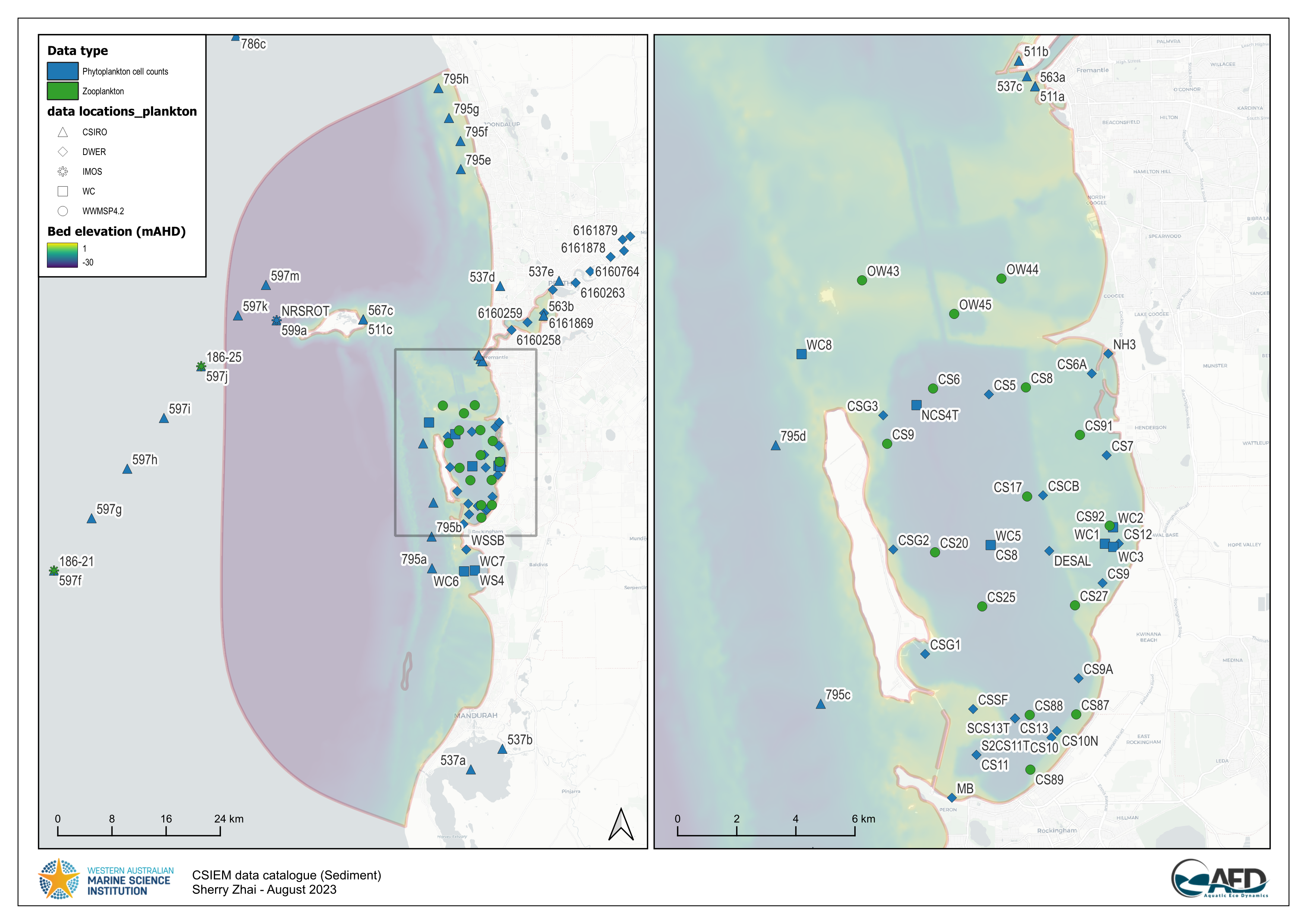 Catchment surface water inputs to the CSIEM modelling region include nutrient loads transported from the Swan-Avon catchment via the Swan-Canning Estuary and from the Peel-Harvey catchment through the Peel-Harvey Estuary. The Swan-Canning contributions are can be significant in high flow years, and to a lesser extent outflows from the Peel-Harvey system can also be a minor ocntributor. The dgree to which either source enters the Cockburn Sound region depsneds on the prevailing currents at the time, for example if there is a predomiantly southward or northward flow tednancy (see Chapter 7). For both these inuts, flow rate and water quality data were sourced from the Department of Water and Environmental Regulation (DWER)Water Information Reporting (WIR) portal, and these data were interpolated into daily intervals to facilitate continuous model simulations between 1990 and 2024.