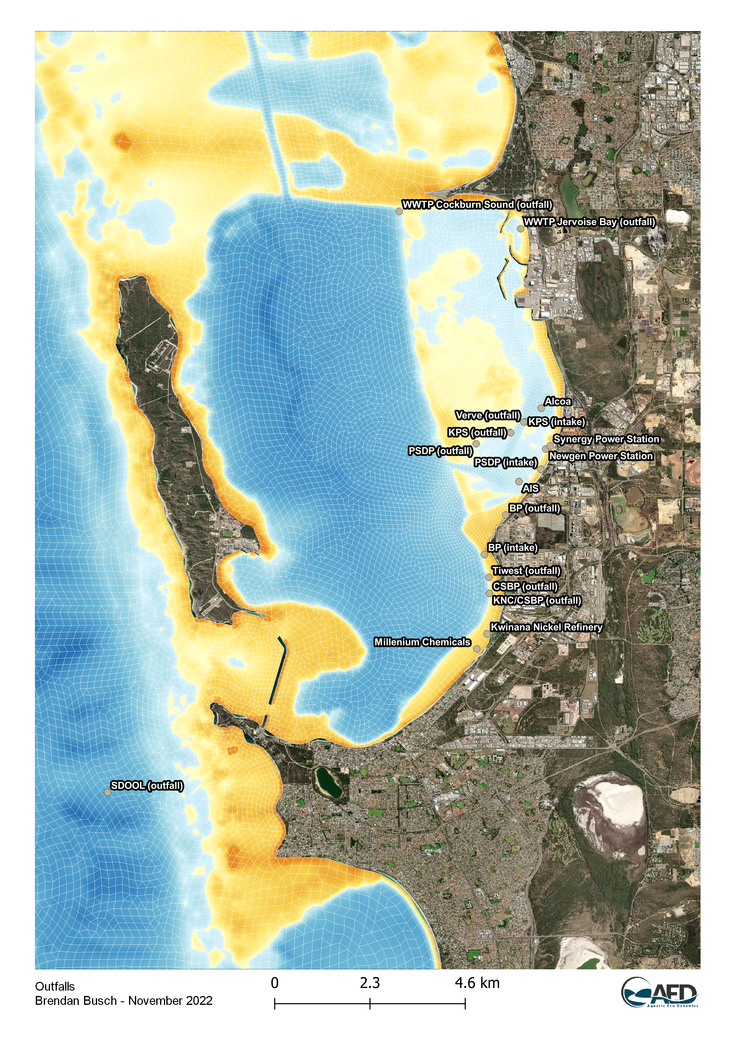The CSIEM model domain includes multiple WWTP outfalls, such as those from Alkimos, Beenyup, Subiaco, Woodman Point, Point Peron, and East Rockingham. Since 1984, treated wastewater from Woodman Point and Point Peron WWTPs has been redirected offshore through the Sepia Depression Ocean Outlet Landline (SDOOL), located 4.1 kilometers offshore west-southwest of Point Peron. This offshore discharge through a diffuser that aids in enhancing dilution to minimize nearshore nutrient impacts (BMT, 2014).