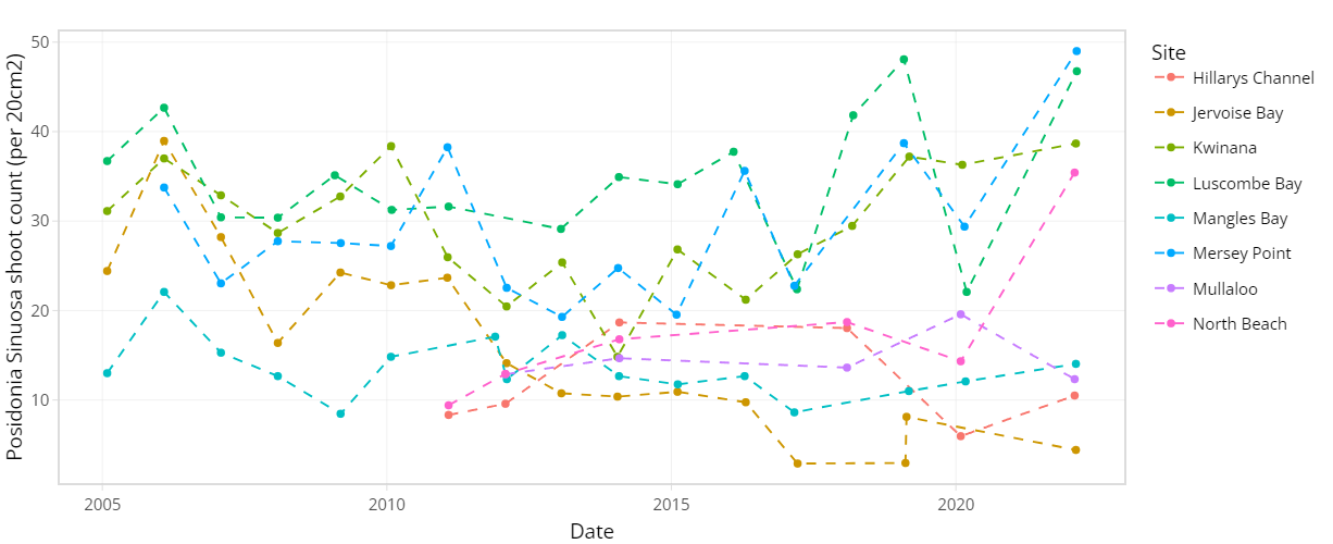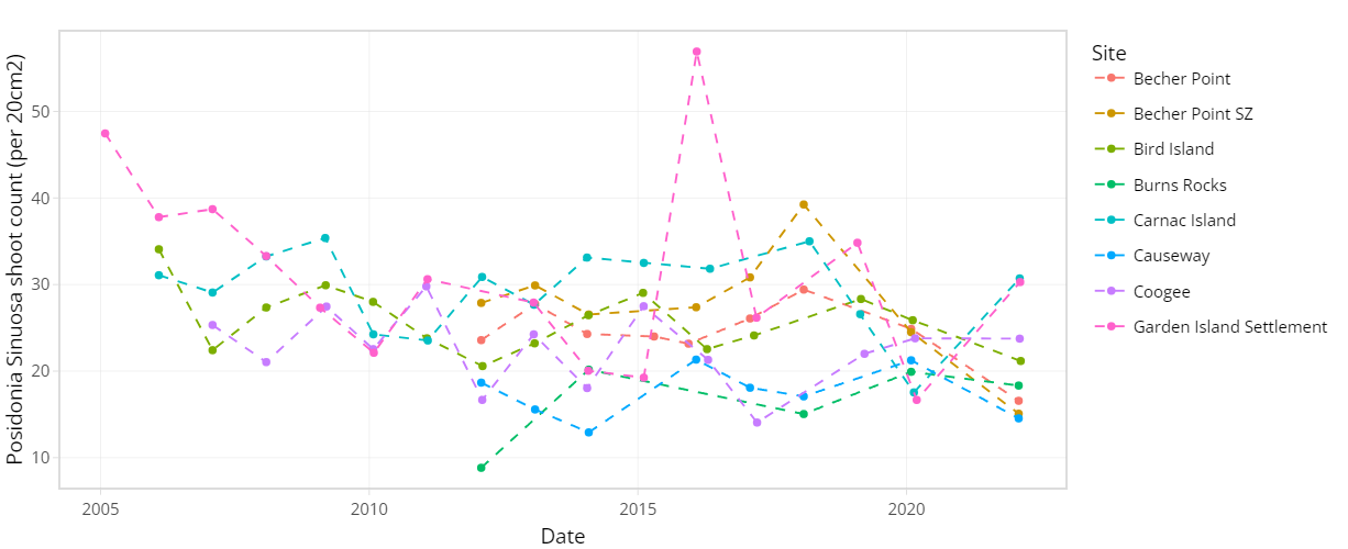 The condition of seagrass communities in Cockburn Sound, Warnbro Sound and Marmion at various sites were monitored annually between 2003 – 2022 by Cockburn Sound Management Council (Figure 7.1). Sampling has mostly conducted during summer months but has varied from year to year. Survey records generally include shoot count, lower depth limit, seagrass height, dominant epiphyte type and cover (Table 7.1), but also varied over time. Monitoring primarily focused on the historically dominant species Posidonia sinuosa, though in some years, presence/absence or shoot count data are also available for other species such as Posidonia australis, Posidonia coriacea, Amphibolis griffithii, and Amphibolis antarctica. Average shoot count of P. sinuosa between 2003 - 2022 at all monitoring sites within the model domain are summarized in Figure 7.2 and 7.3. Additionally, several case studies that recorded P. sinuosa biomass in CS are particularly relevant to the dynamic seagrass model and are listed in Table 7.1.