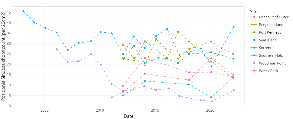 Figure 7.2. Average Posidonia sinuosa shoot count per 20 cm2 between 2003 – 2022 at CSMC monitoring sites (showing sites within model domain only).