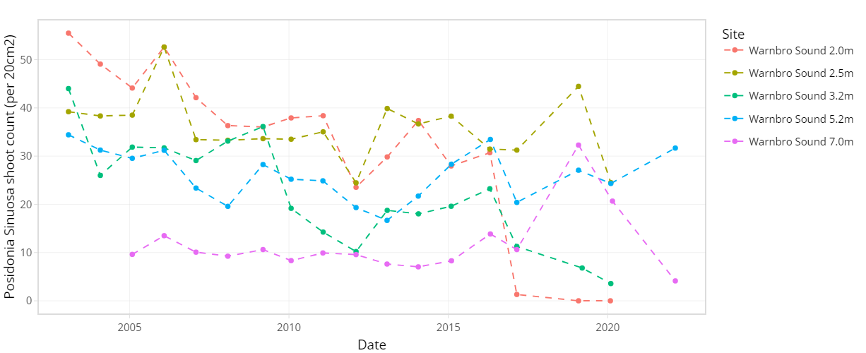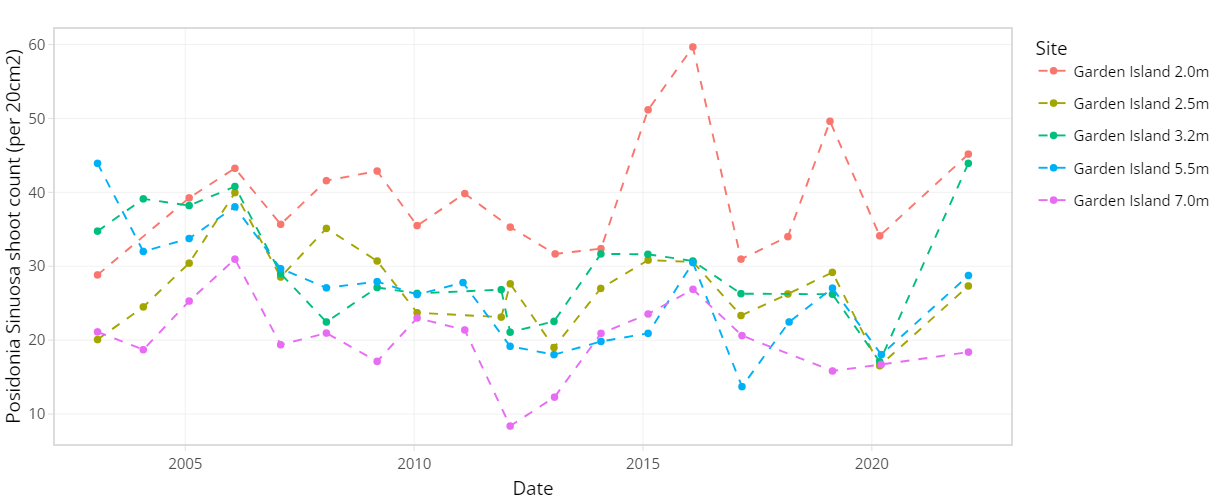 Figure 7.3. Average Posidonia sinuosa shoot count per 20 cm2 between 2003 – 2022 at CSMC monitoring sites Garden Island and Warnbro Sound at multiple depths.