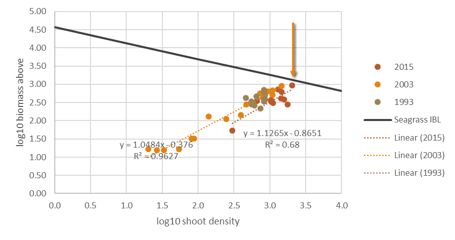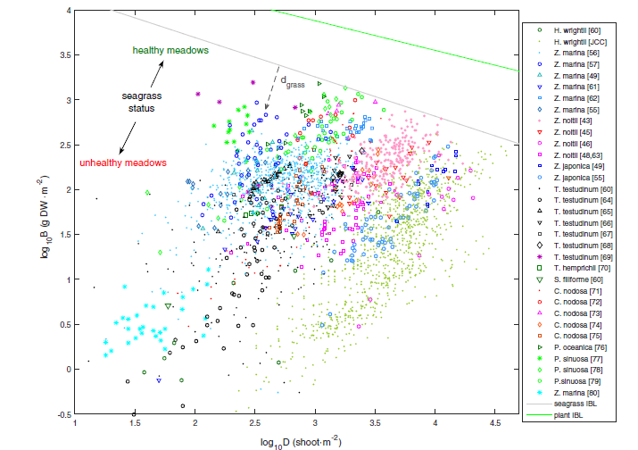 As observed in Figure 10, data from a broad range of species and across many locations show the trend following the perpendicular line, and the relative distance (\(d_{grass}\)) from the seagrass IBL. The perpendicular line represents the species specific biomass-shoot density relationship, and can be presented mathematically using a log function such as:
