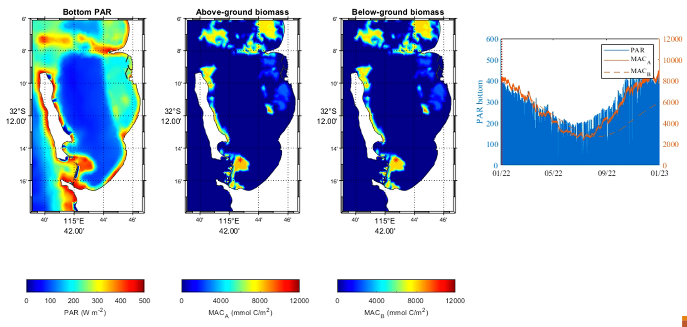 To understand seagrass dynamics and their response to various scenarios it is also necessary to consider the variability in seagrass biomass dynamics and the ecophysiological controls on seagrass productivity. Further, seagrass presence can also generate physical and biogeochemical feedbacks on the broader system, that can be taken into account.