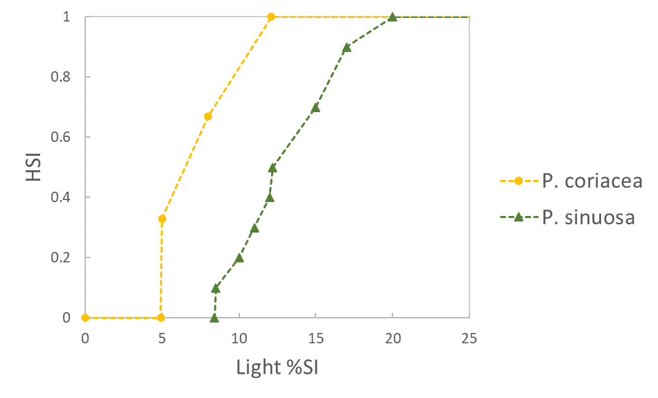 P. sinuosa: Erftemeijer et al. 2023, with minimum threshold adjusted based on data from Perth populations assuming light epiphyte cover (Collier et al. 2007) P. coriacea: Erftemeijer et al. 2023 |
