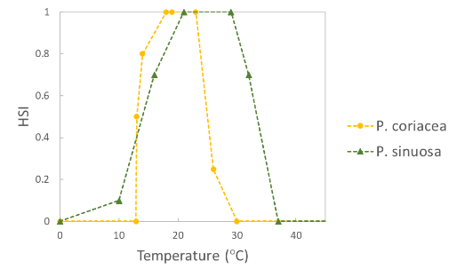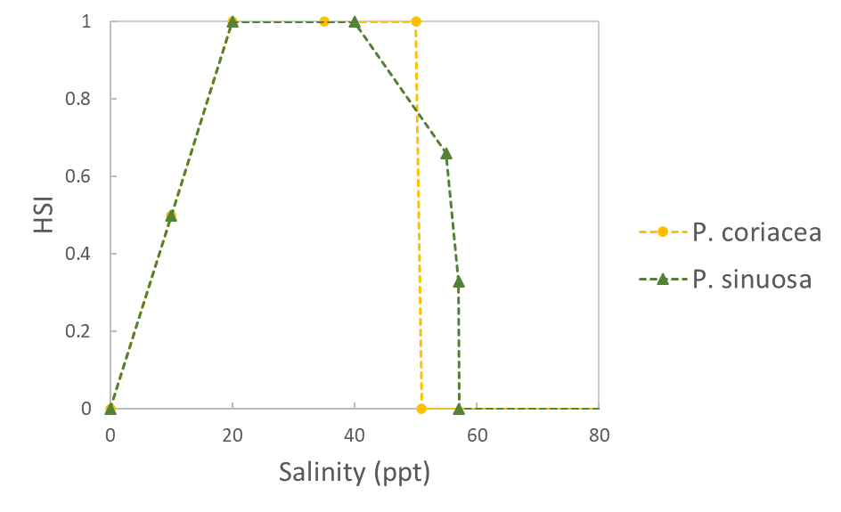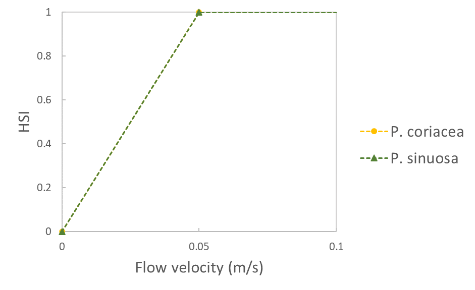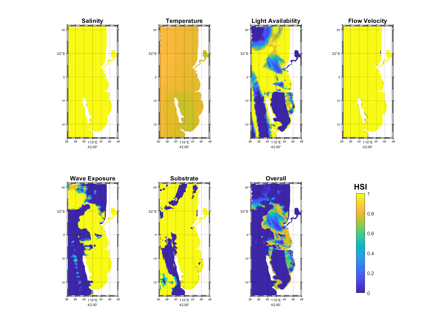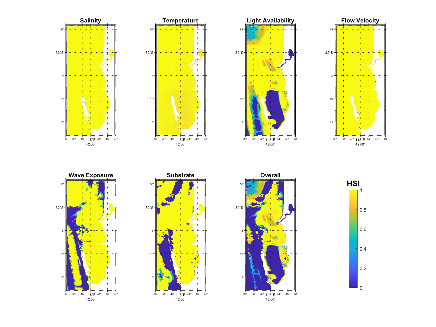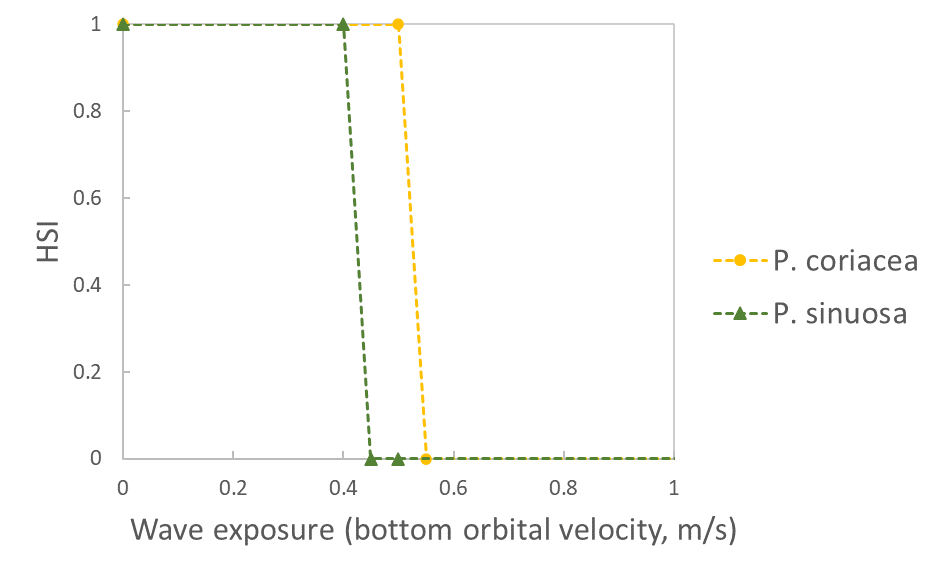 The first approach adopted in this study was to simulate “habitat suitability” based on an assessment of modelled environmental conditions relative to the known requirements of P. sinuosa, which include light, wave exposure, temperature, salinity, flow velocity and substrate type. This approach was then used to define a relative index for each computational cell by overlaying the various environmental controls/limitations that have been informed based on WWMSP Theme 2 experiments and available literature. The Habitat Suitability Index (HSI) approach empirically defines conditions that lead to successful growth, without the need for mechanistic simulation of processes such as photosynthesis and respiration.