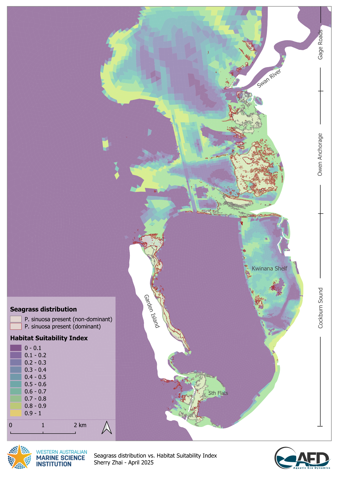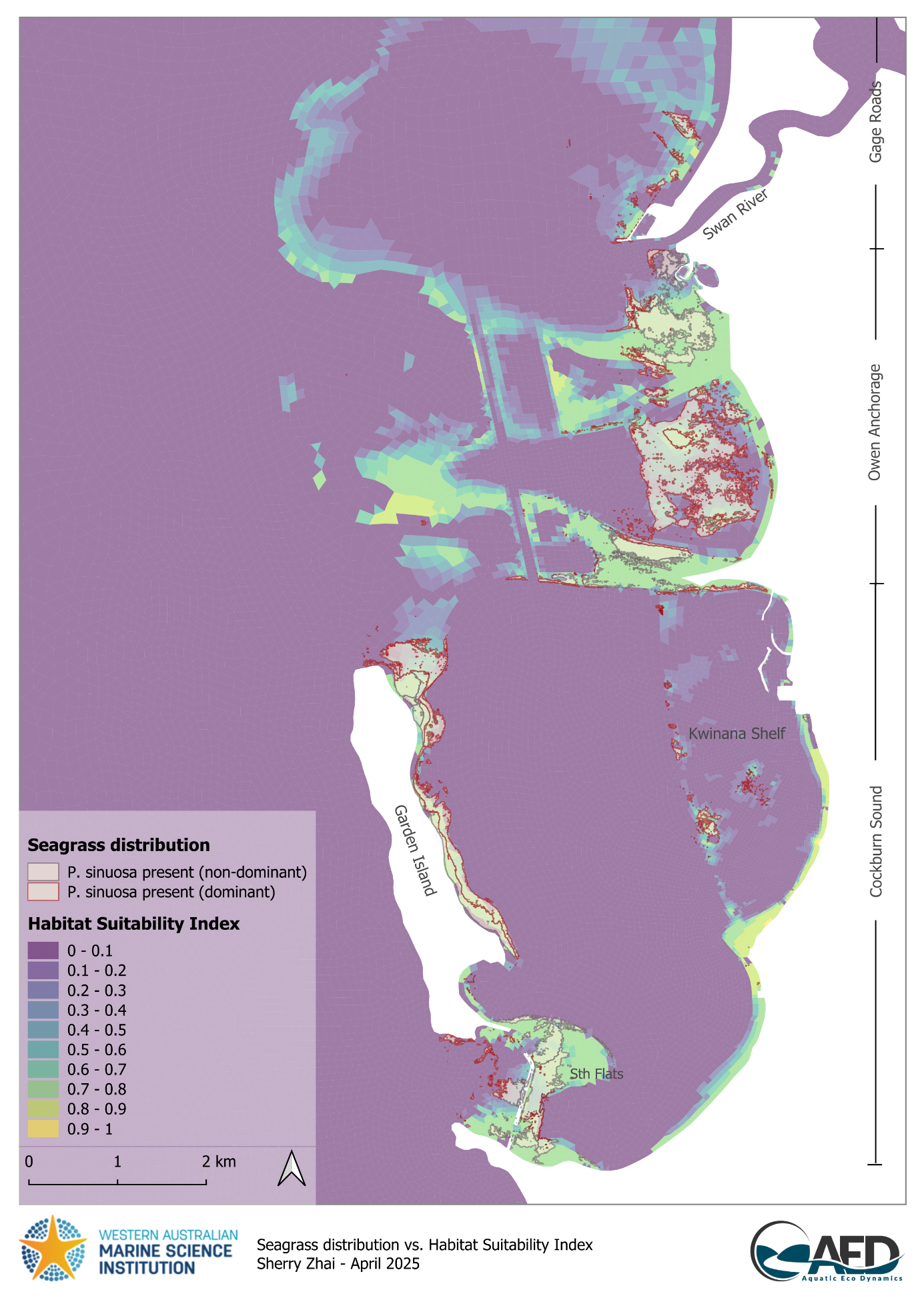 Figure 7.8. Comparison between modelled Habitat Suitability Index (HSI) and Posidonia sinuosa presence in the Cockburn Sound and Owen Anchorage region. An HSI of 0 represents unsuitable habitat conditions (dark purple), while an HSI of 1 represents optimal conditions (yellow).