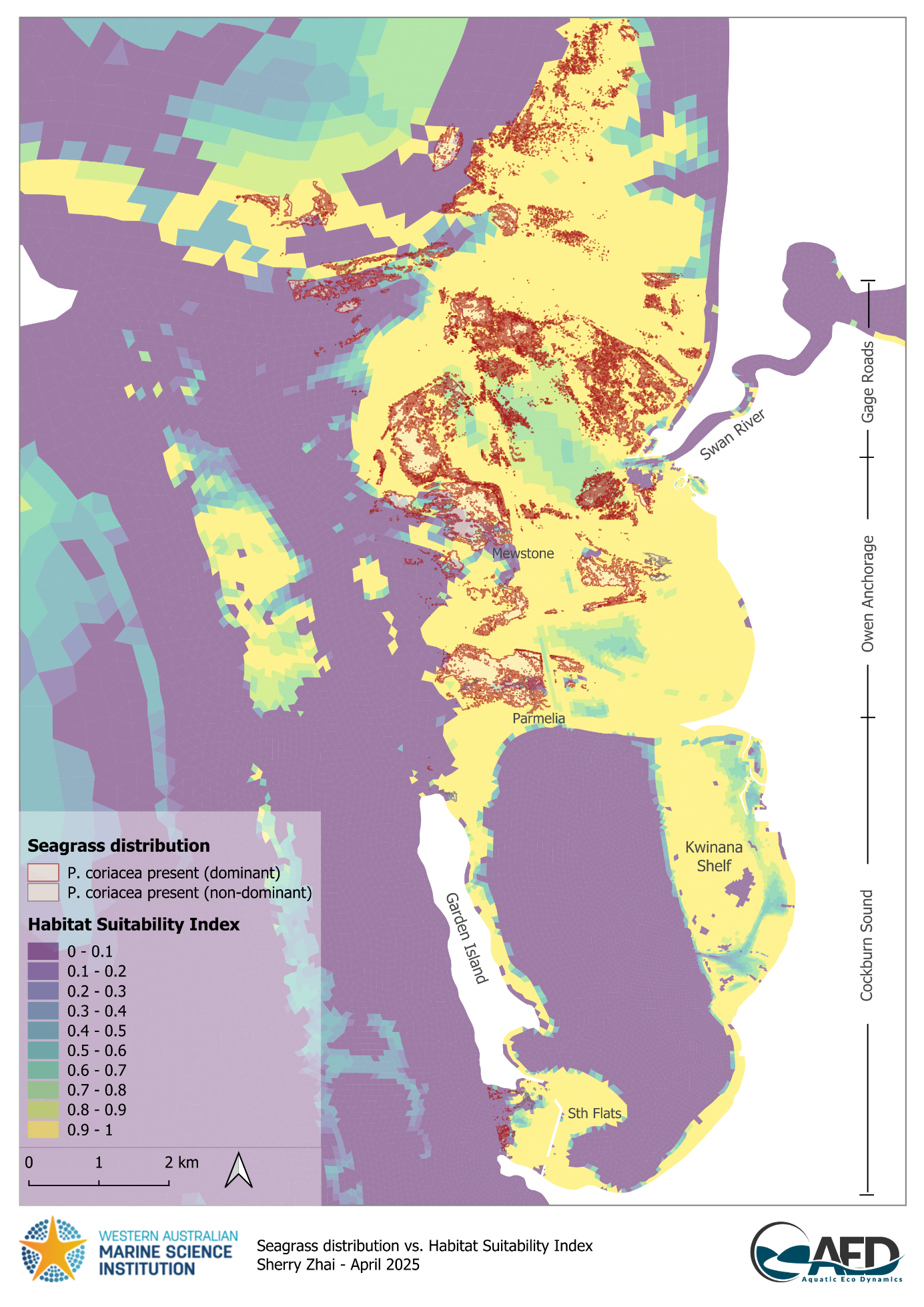 Figure 7.9. Comparison between modelled Habitat Suitability Index (HSI) and Posidonia coriacea presence in the Cockburn Sound and Owen Anchorage region. An HSI of 0 represents unsuitable habitat conditions (dark purple), while an HSI of 1 represents optimal conditions (yellow).