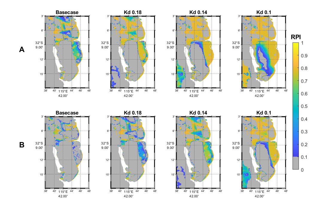 Figure 7.11. Restoration Priority Index (RPI) maps showing areas with high (yellow) to low (dark blue) restoration potential for Posidonia sinuosa under current conditions (Base case, average light attenuation coefficient Kd = 0.23 m-1 in spring - summer) and scenarios with higher water clarity (lower Kd (m-1) values, panel A). Also shown are RPI under the same conditions if epiphyte load is high reducing light availability (panel B). Grey areas are unsuitable habitat (HSI ≤ 0.1) or occupied by existing seagrass community.