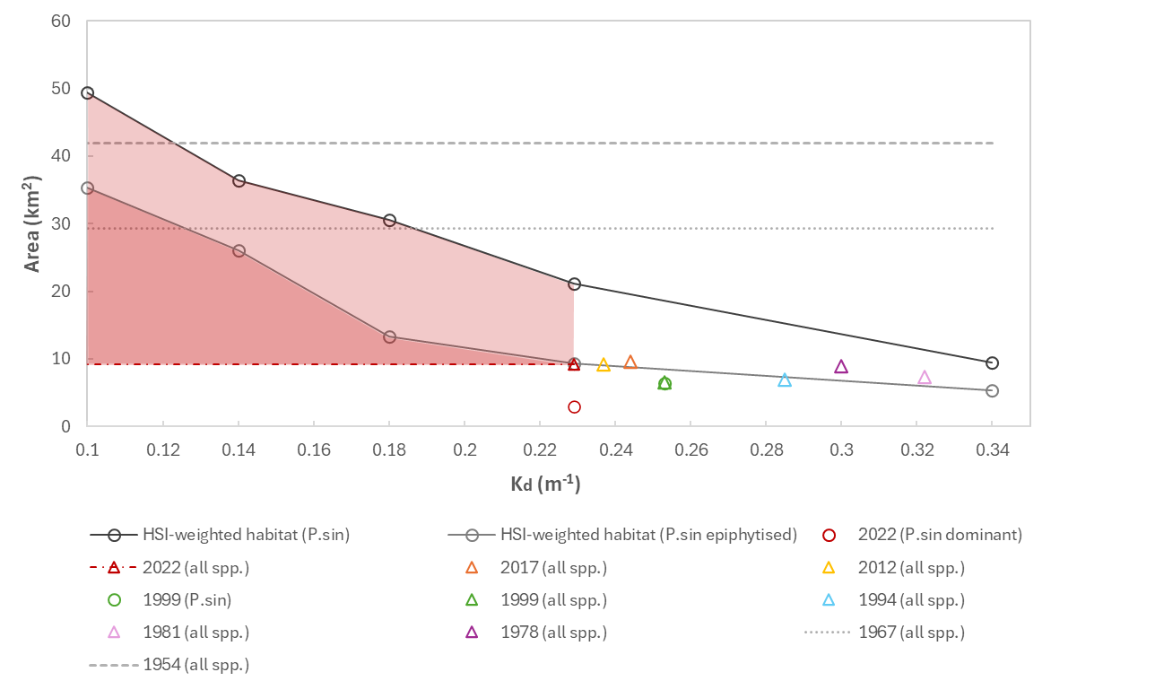 Interestingly, under the modelled scenario where seagrasses are heavily epiphytised with 45% less light reaching leaves, the trajectory of habitat area response to changing water clarity coincidently agreed with mapped seagrass extent over the last four decades, in that the slope of change is predicted to be gentle, i.e., change in suitable area in response to per unit of change in Kd, is insignificant, between Kd of 0.34 m-1 and 0.23 m-1 (Figure 7.12). Under this trajectory, suitable habitat area will only increase considerably when Kd is reduced to less than 0.18 m-1.