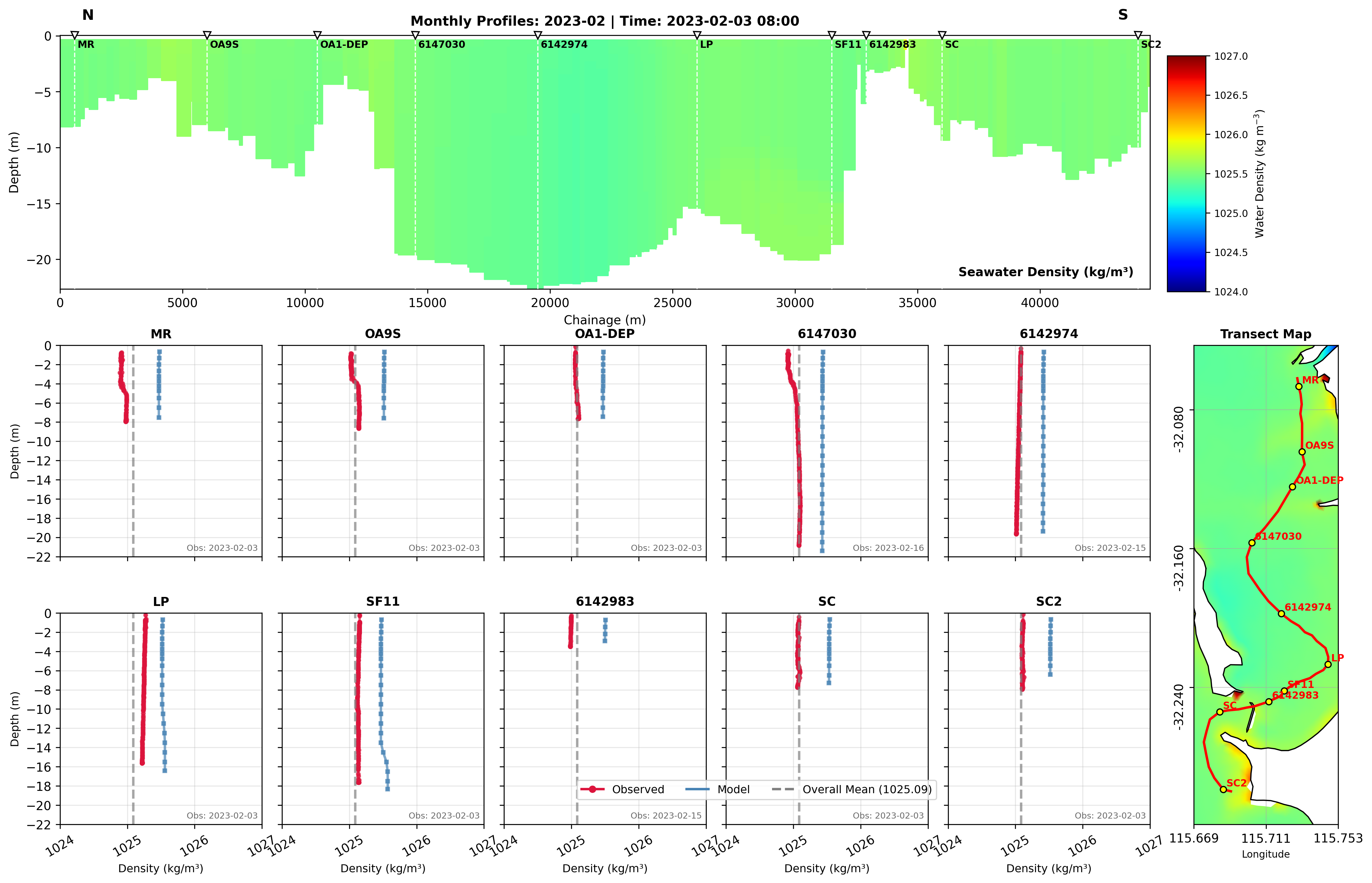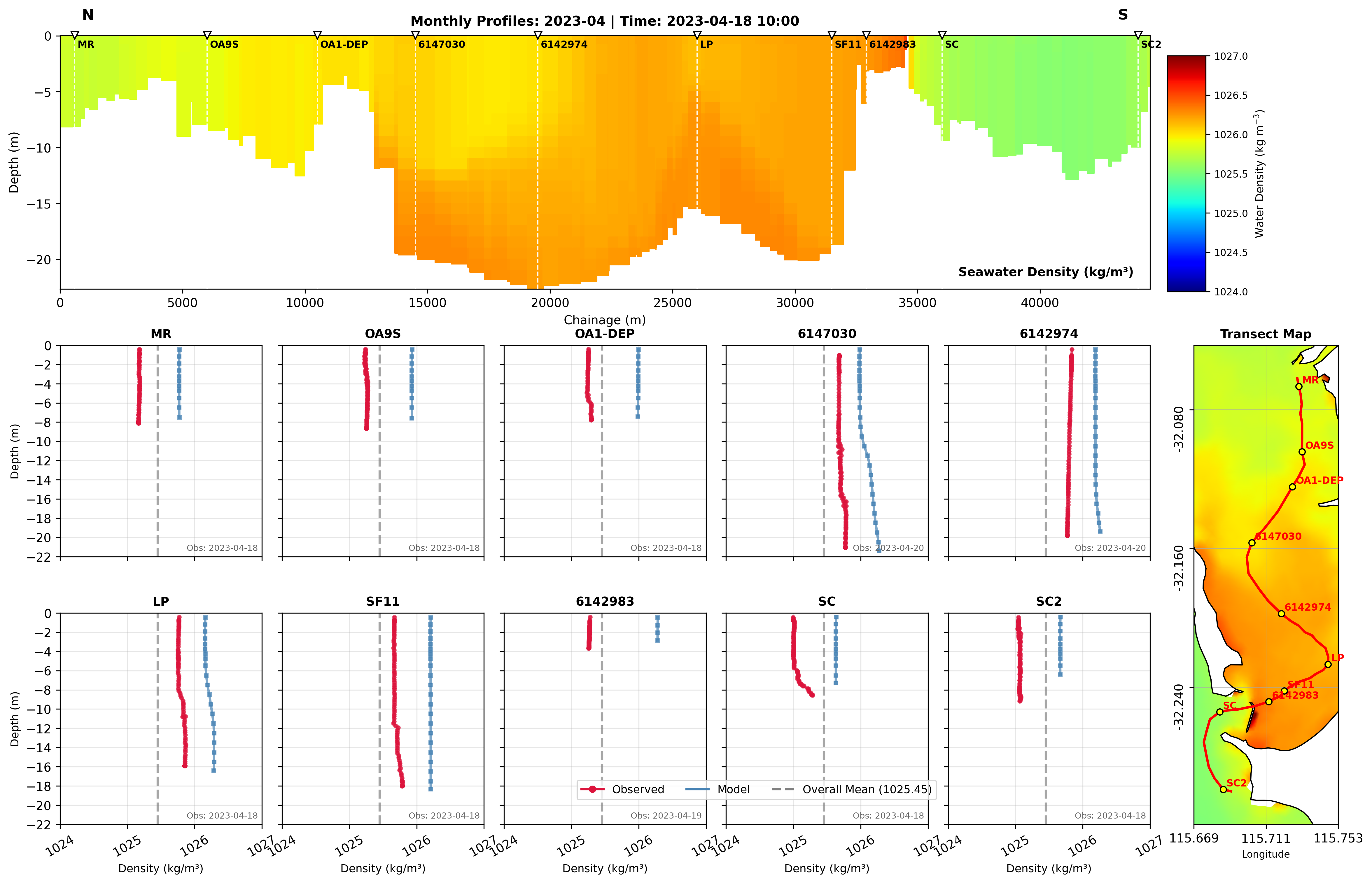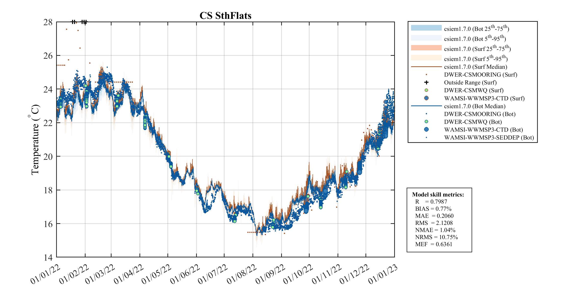 In addition to the thermistor-chain data, the DWER profiling moorings deployed at four locations across Cockburn Sound (CS4, Desal, CS13 and CS11) provide a further extensive data-set for assessing the model’s vertical structure, particularly in the deep basin. These moorings collect continuous (~ hourly) profiles of temperature, salinity, dissolved oxygen and density through the water column; a month-by-month comparison of observed vs modelled curtain plots (depth vs time) is presented for each station, ordered from north to south in the Temperature & Salinity Mooring Report Card. Note that the mooring data is subject to sensor drift and biofouling, so months where data quality was considered unreliable have been excluded from the report cards following review against DWER field notes. Nonetheless, there are many months of high quality data which compare well with the model and shows CSIEM has excellent fidelity in resolving the dynamic patterns of mixing and stratification.