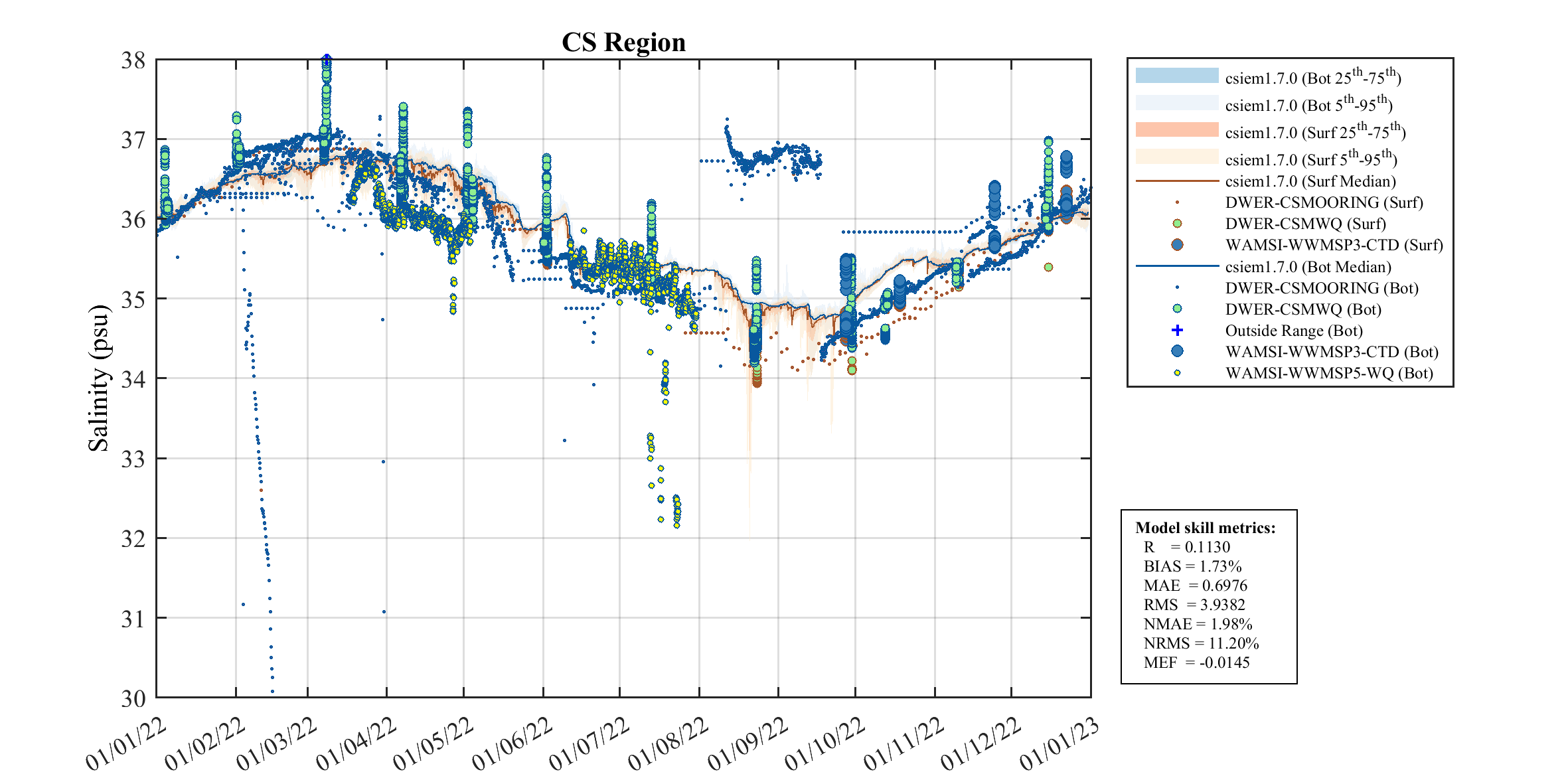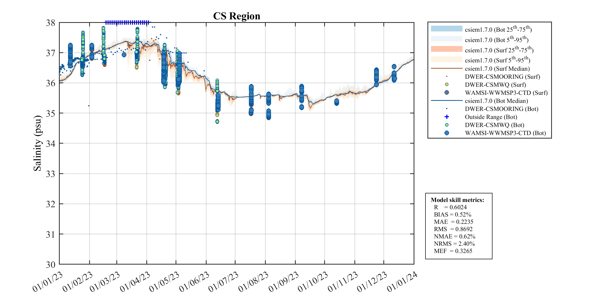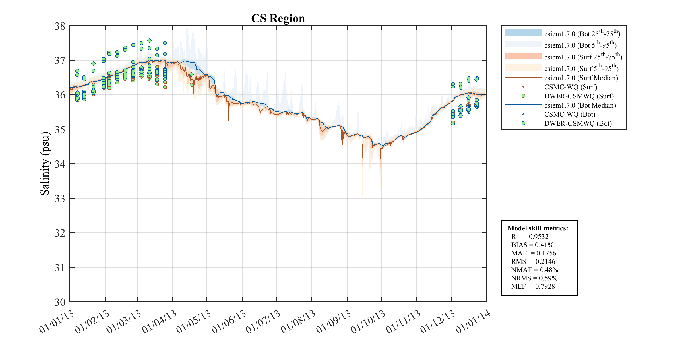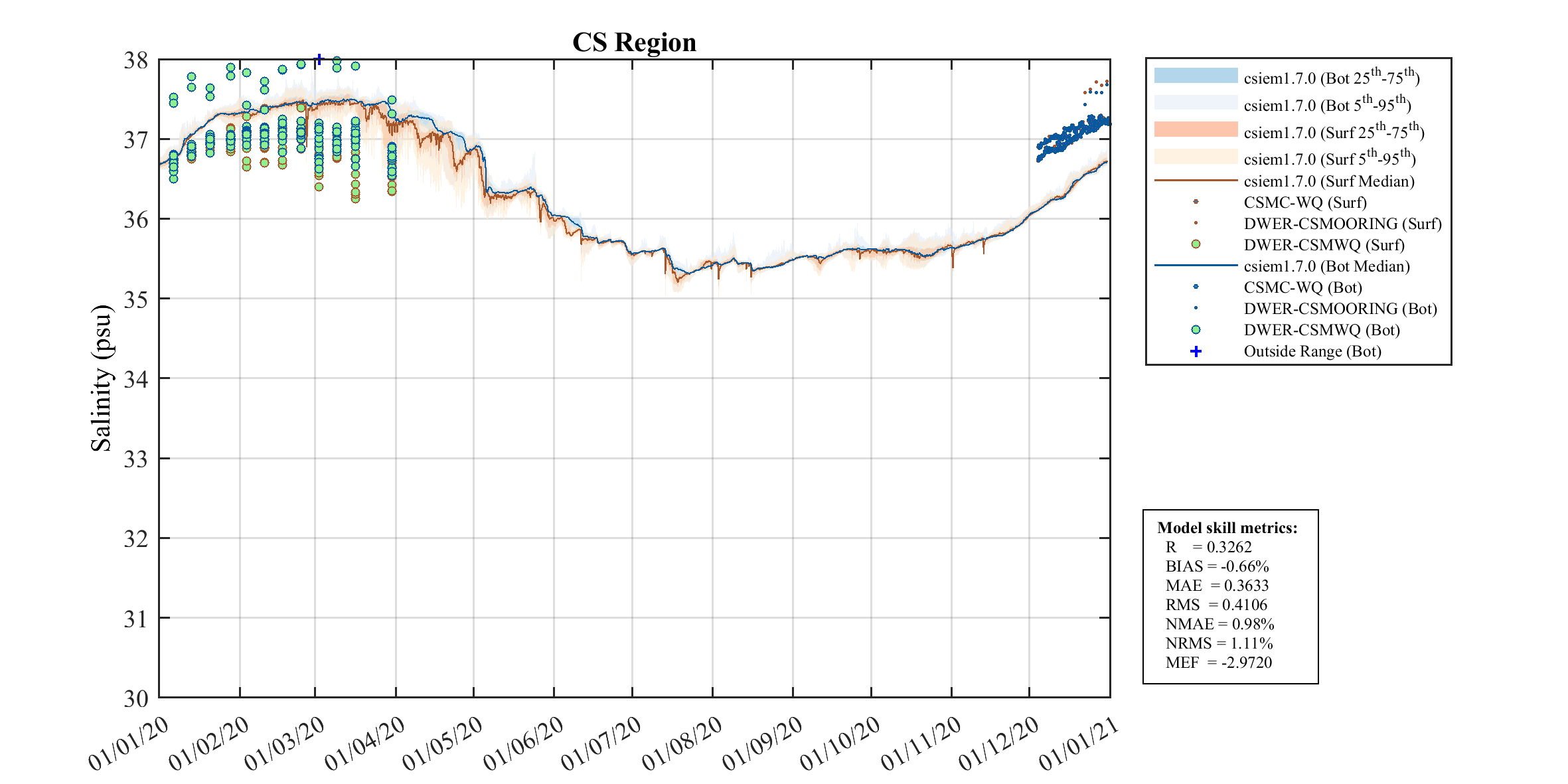 Initial experience with early versions of CSIEM highlighted issues associated with incorrect seasonal trends in salinity and biases in temperature that were refined in later versions. In addition, a wider range of years have since been considered in the model assessment process as the model has progressed. Refinements have included adjustments to the ocean boundary inputs and parameter calibration in the heat balance model.