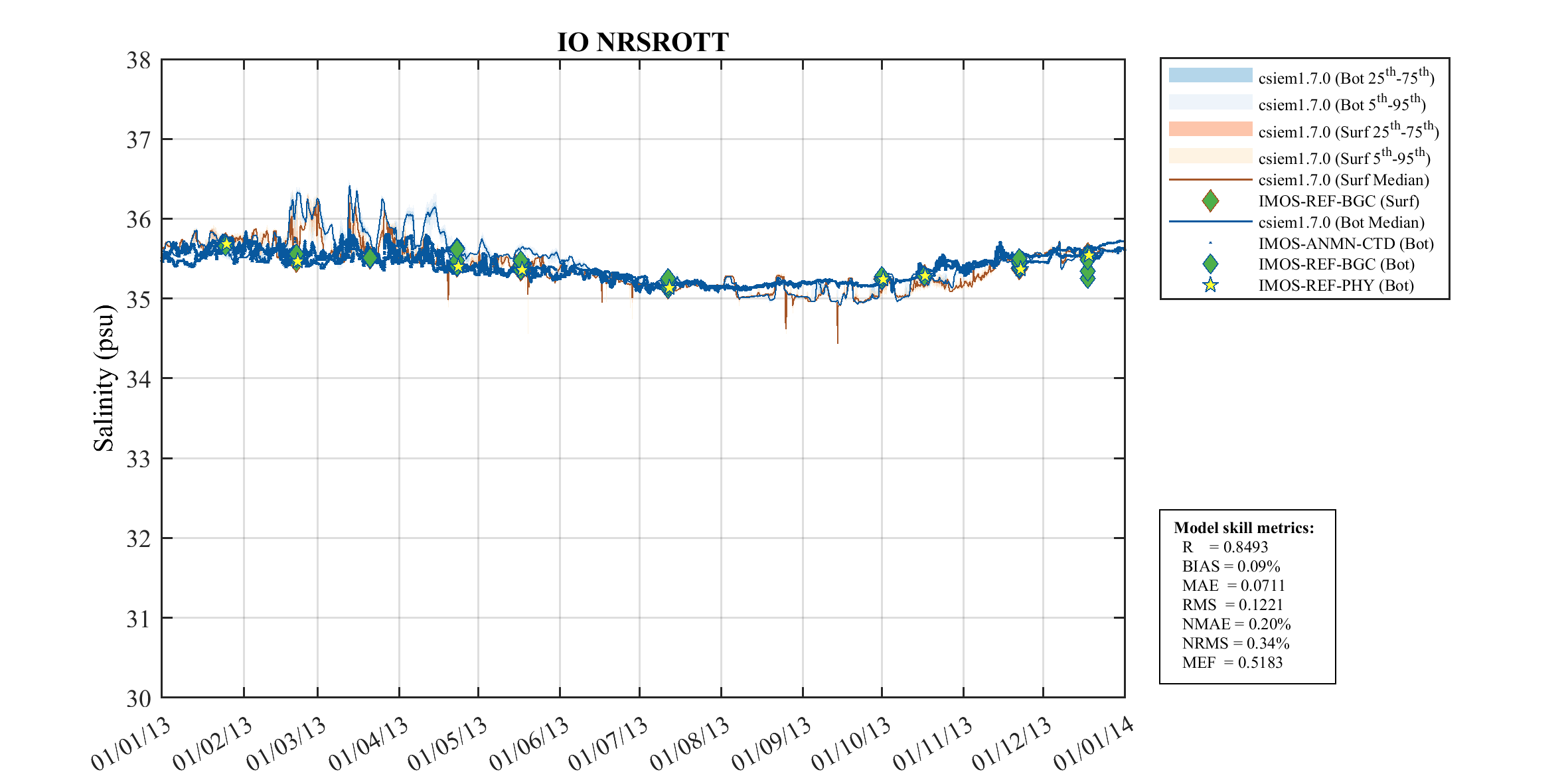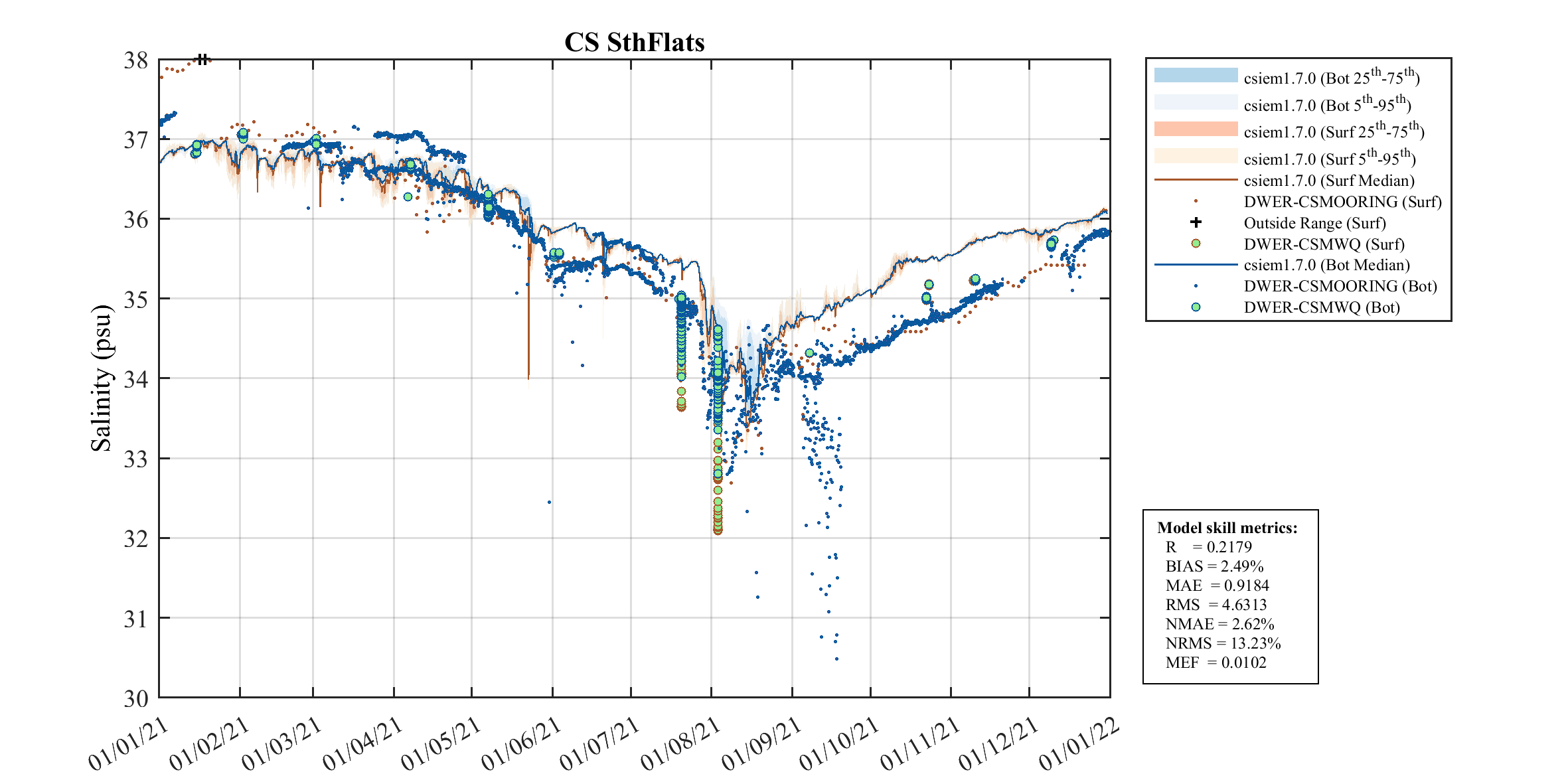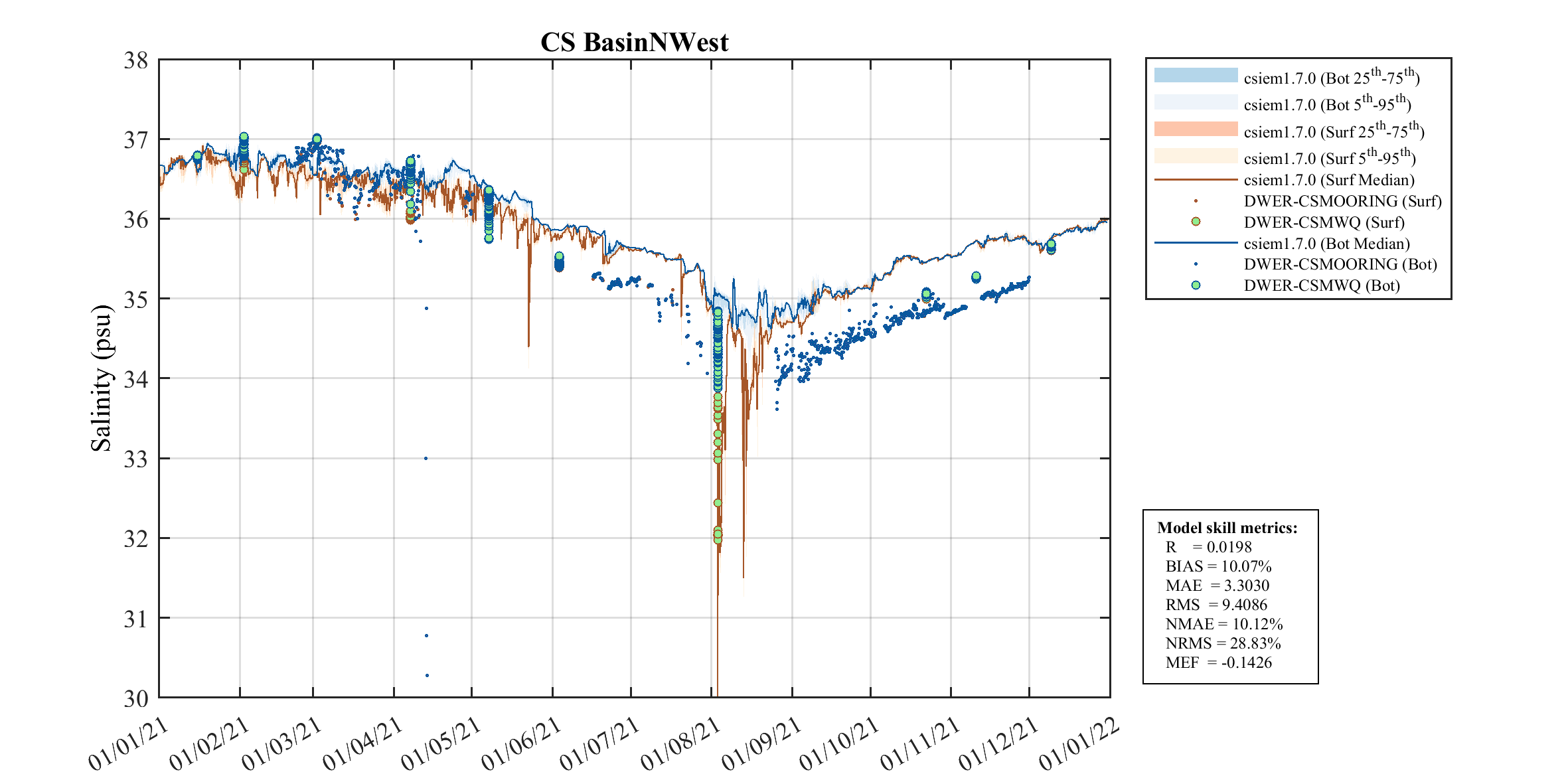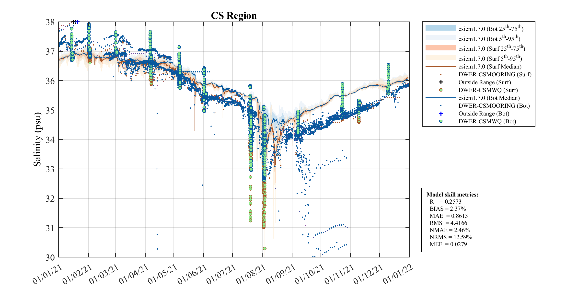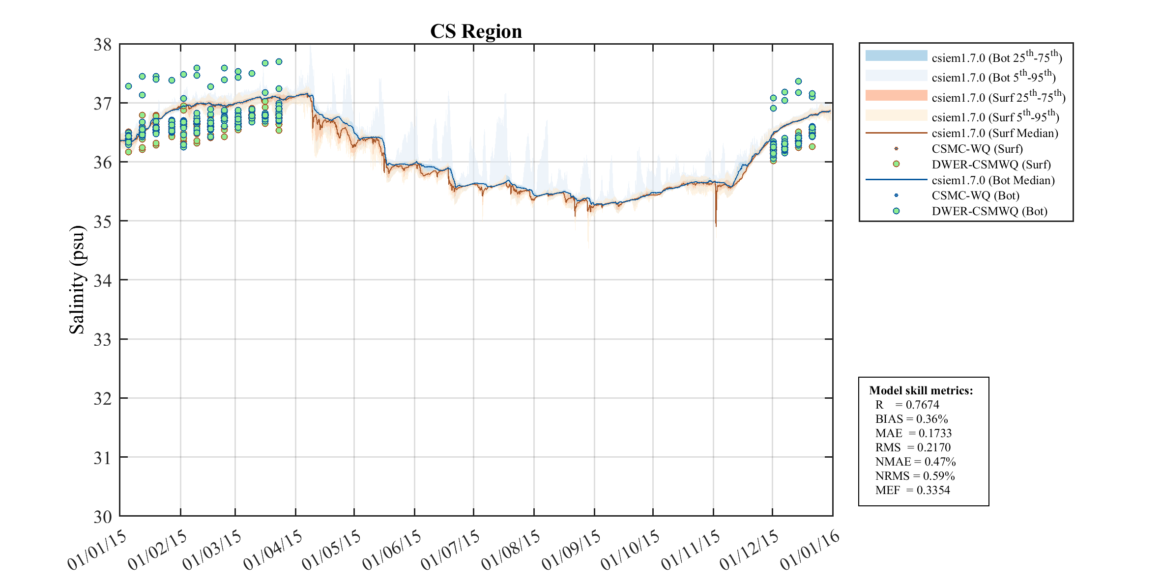 Initial experience with early versions of CSIEM highlighted issues associated with incorrect seasonal trends in salinity and biases in temperature that were refined in later versions. In addition, a wider range of years have since been considered in the model assessment process as the model has progressed. Refinements have included adjustments to the ocean boundary inputs and parameter calibration in the heat balance model.
