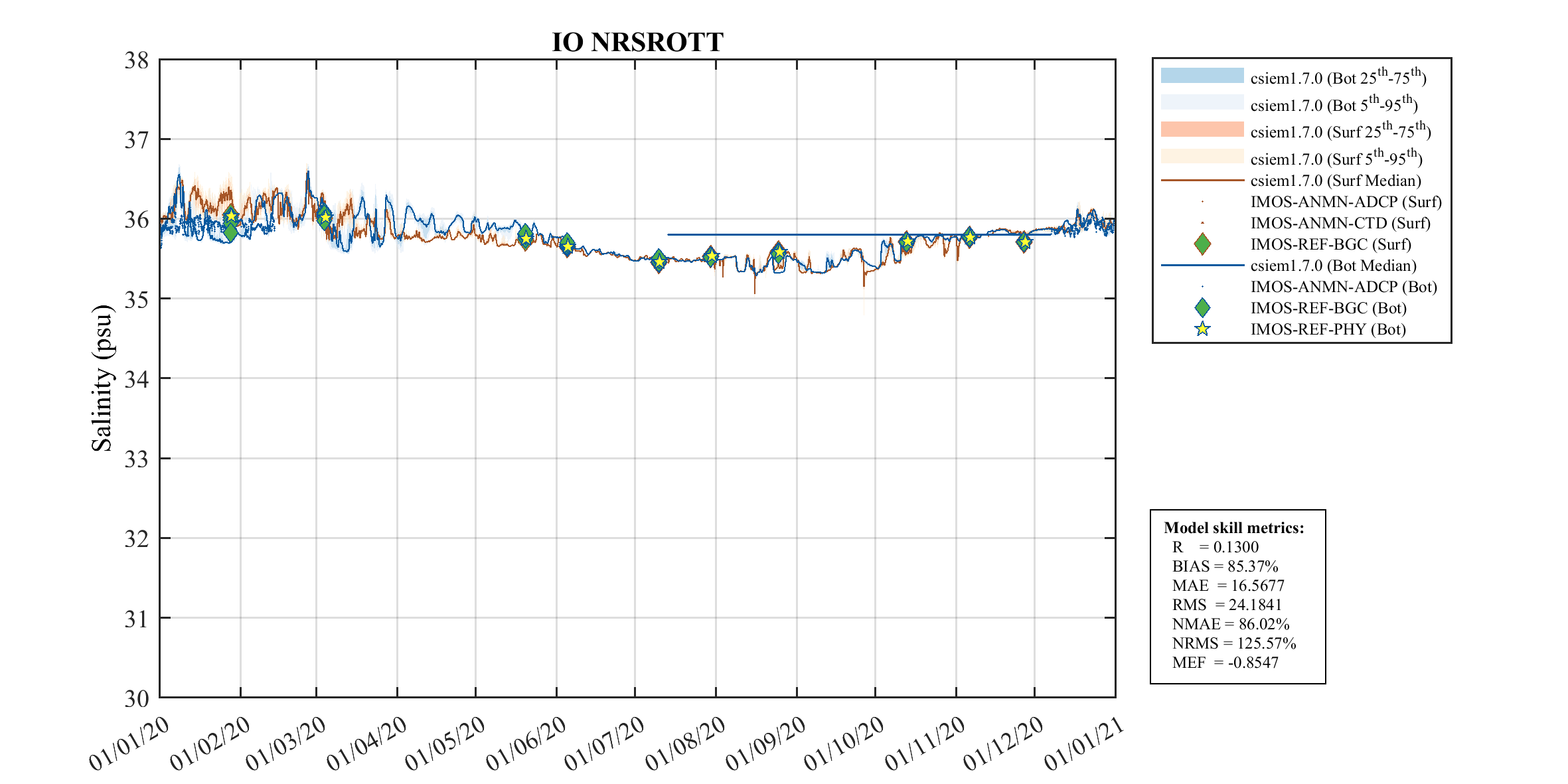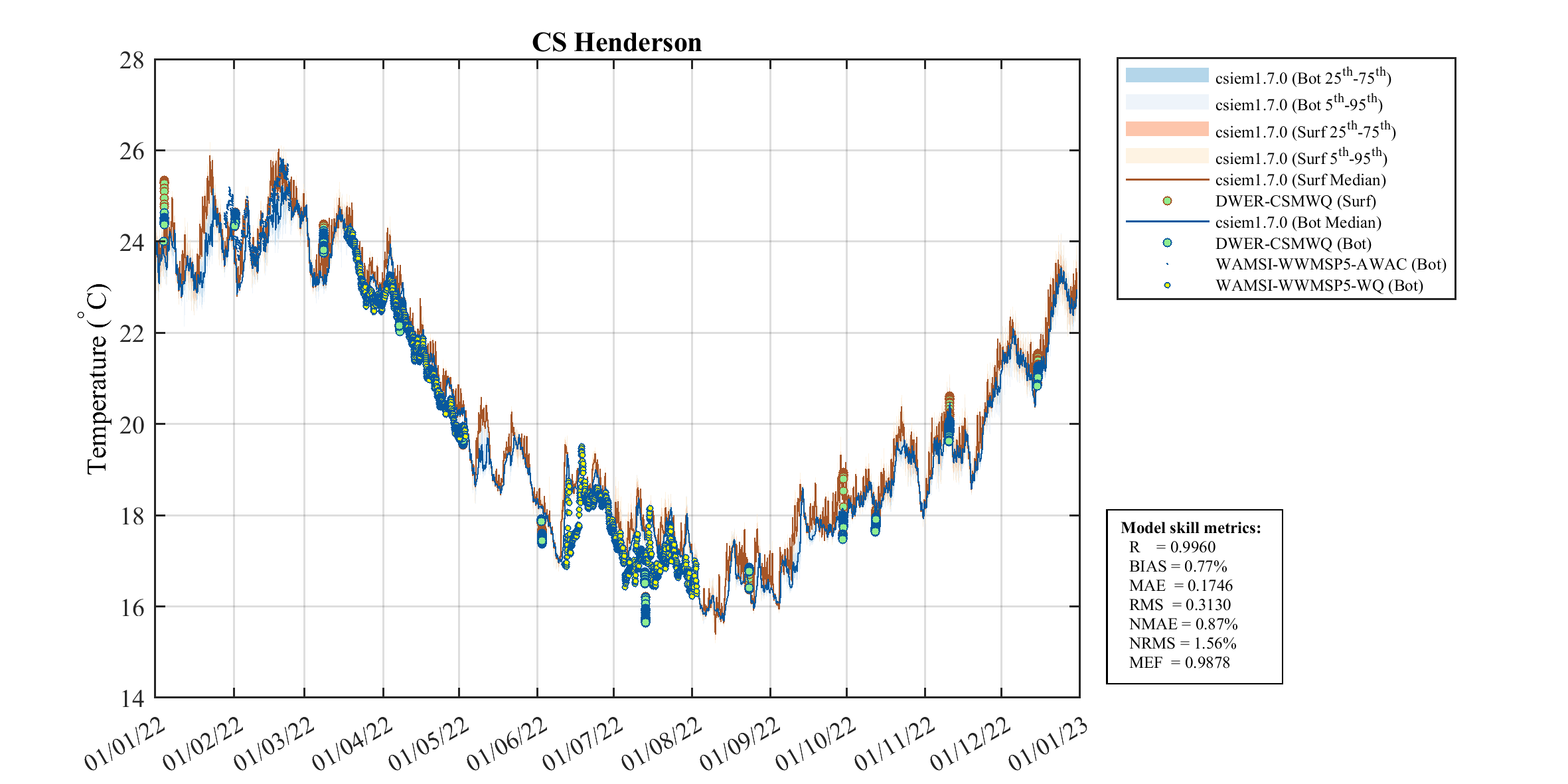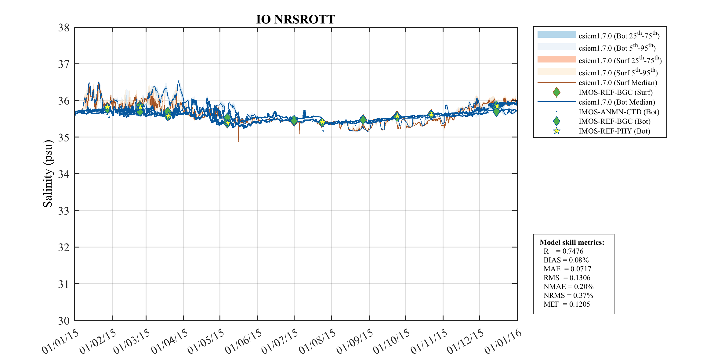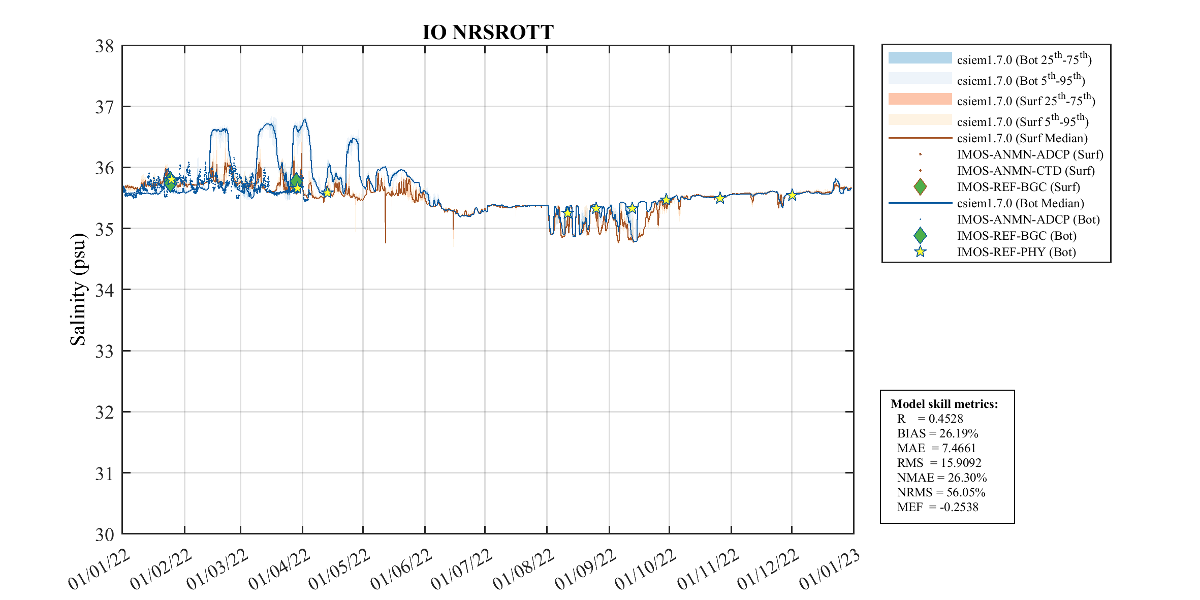 Initial experience with early versions of CSIEM highlighted issues associated with incorrect seasonal trends in salinity and biases in temperature that were refined in later versions. In addition, a wider range of years have since been considered in the model assessment process as the model has progressed. Refinements have included adjustments to the ocean boundary inputs and parameter calibration in the heat balance model.