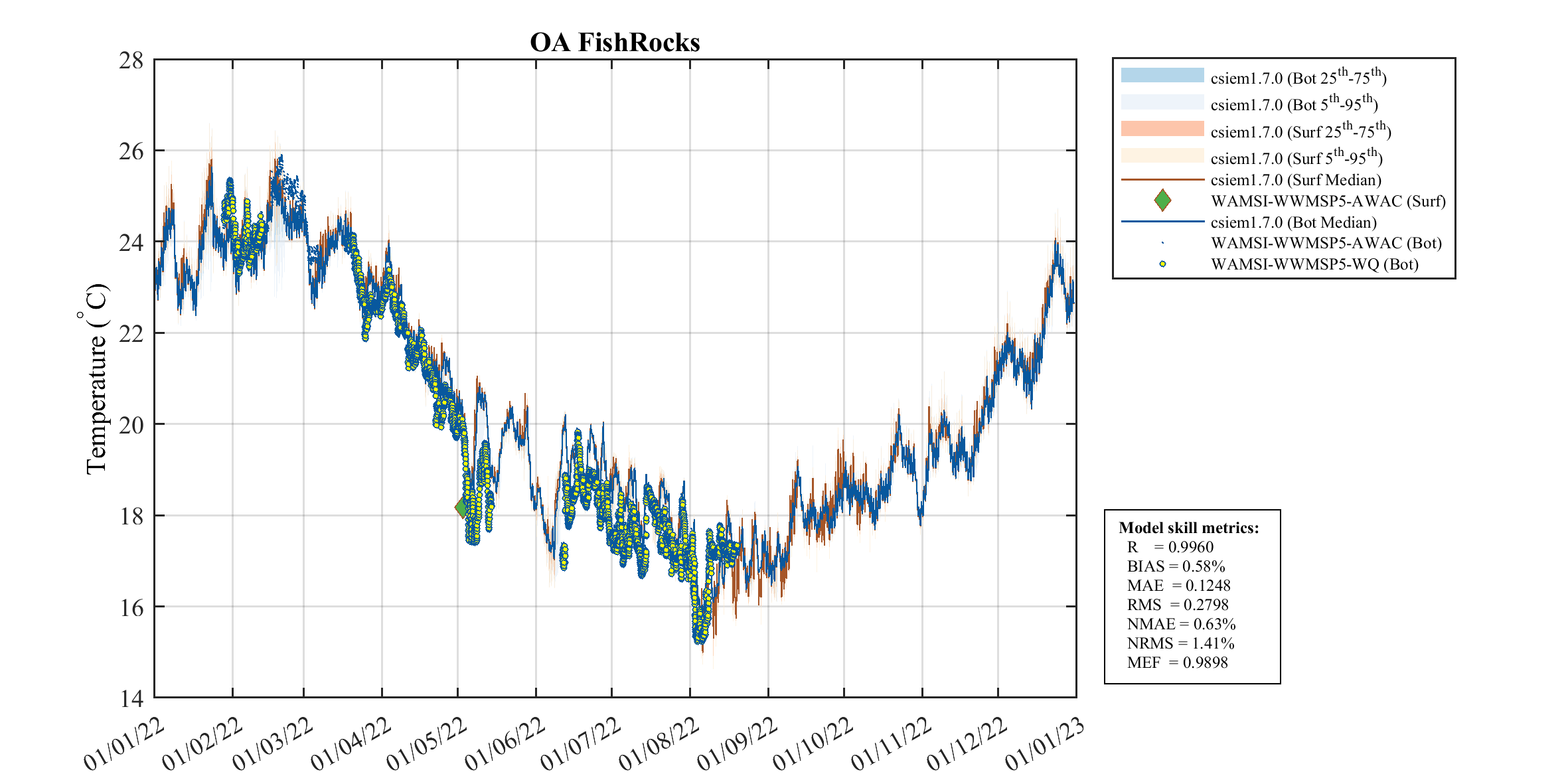 Given the large volume of temperature data along the Perth coast, a detailed spatial and temporal breakdown of temperature model performance across all assessment polygons and validation years has been summarised in the Temperature Validation Report Card. This shows the “traffic-light” summary of model performance across key regions and years, and doesn’t rely on any single data source as the sole point of truth.