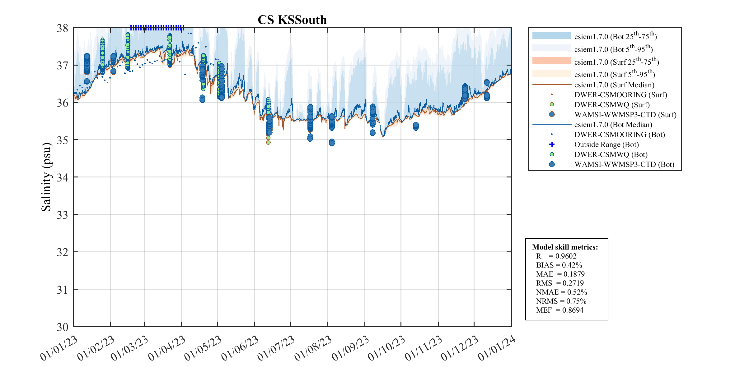 The influence of these discharges on the background water temperature and salinity levels are able to be seen in the “KS-South” assessment polygon spanning the region with the Kwinana discharges in Figure 9.25 (2023 shown, other years visible through (MARVL-VIEWER). This region receives the PSDP brine which is seen to cause the large range of model salinities in this region (as shown in the blue-shading); these high salinity values are not observed elsewhere and match the range seen in the profile data-set.