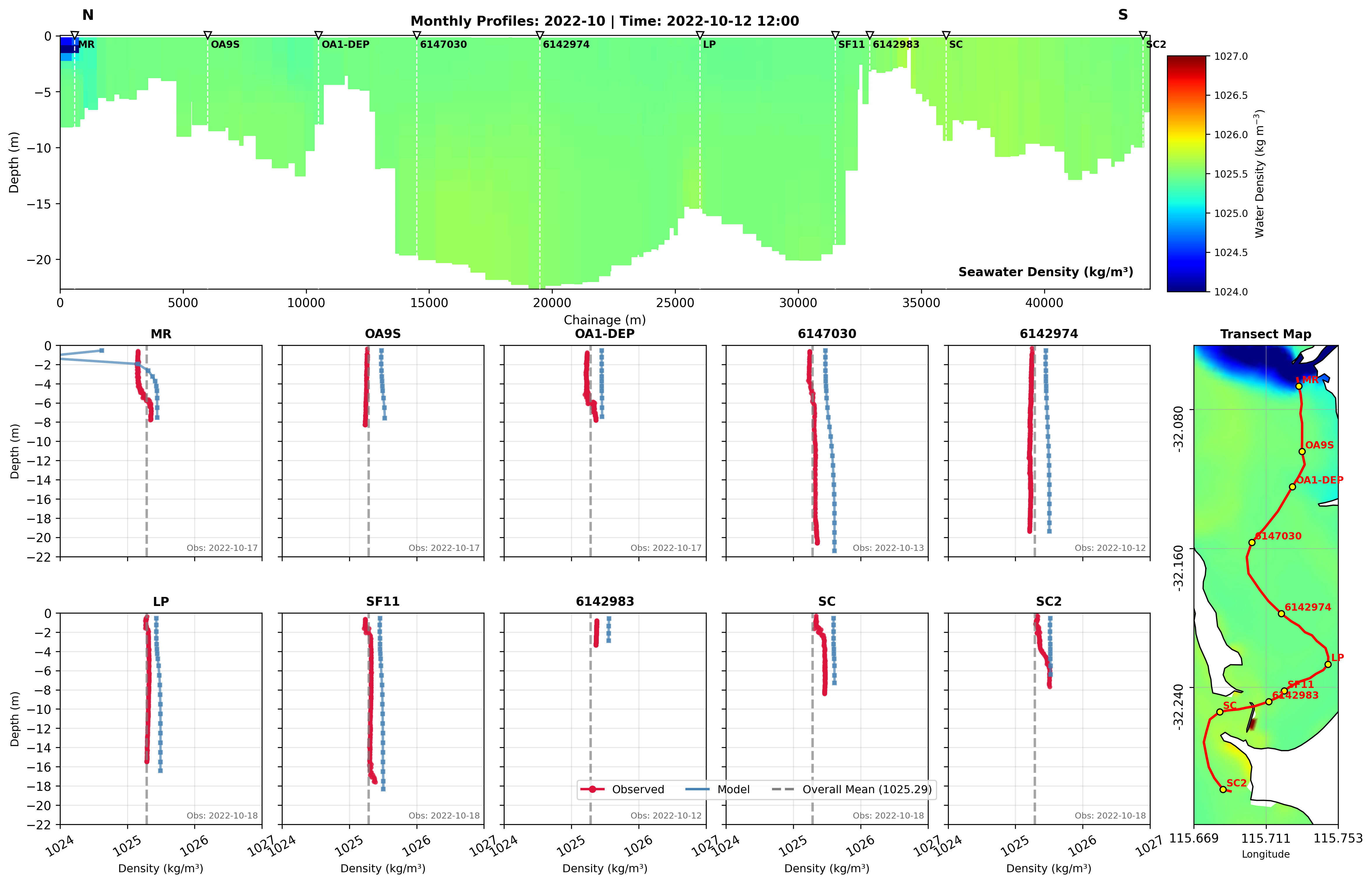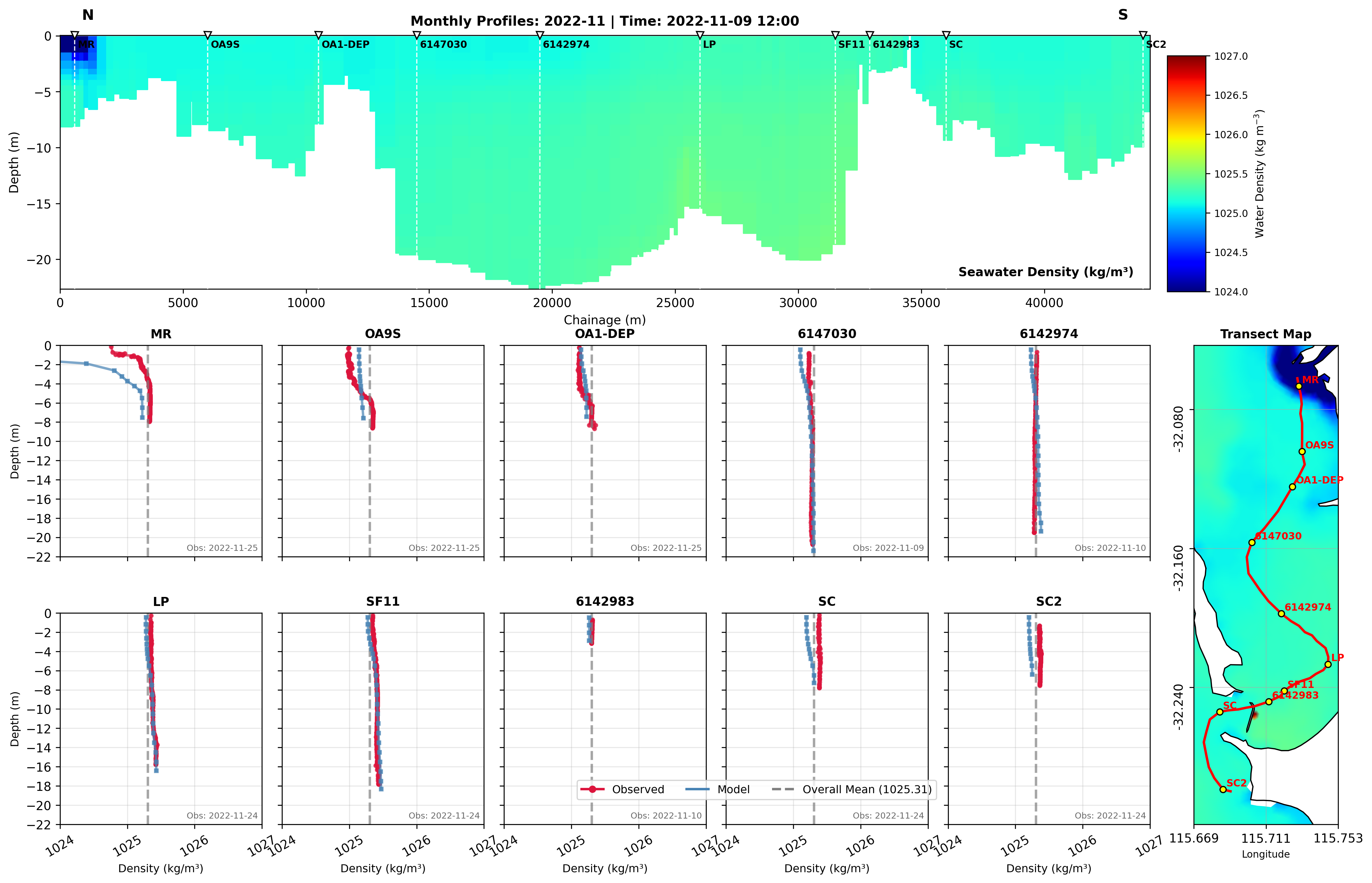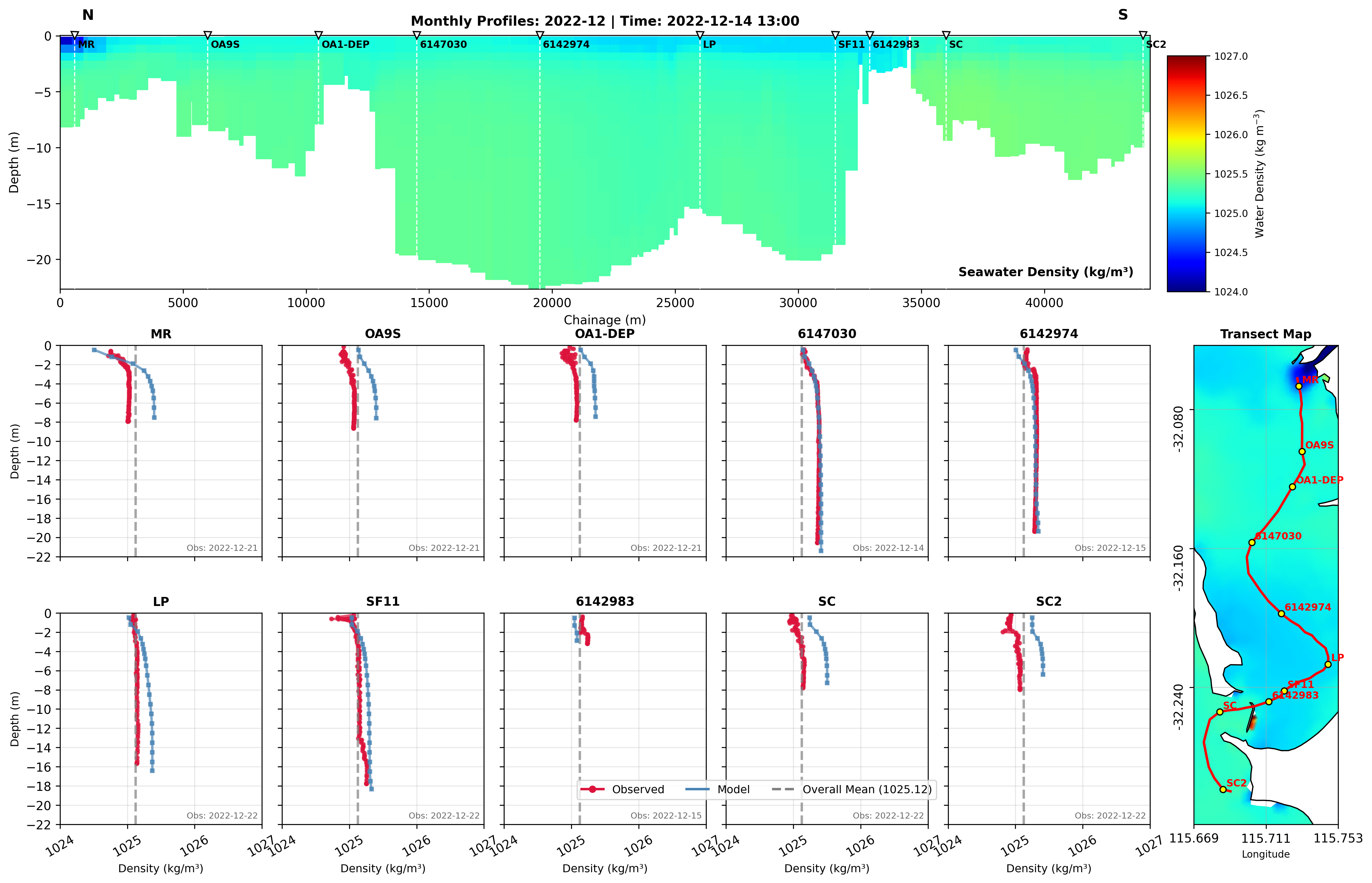 Figure 9.7. Monthly density profiles at a site in the north of the deep basin for the year 2022, comparing model predictions with observed data. Profile data from DWER-CSMWQ.