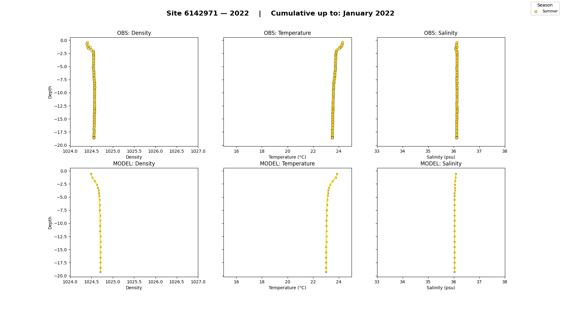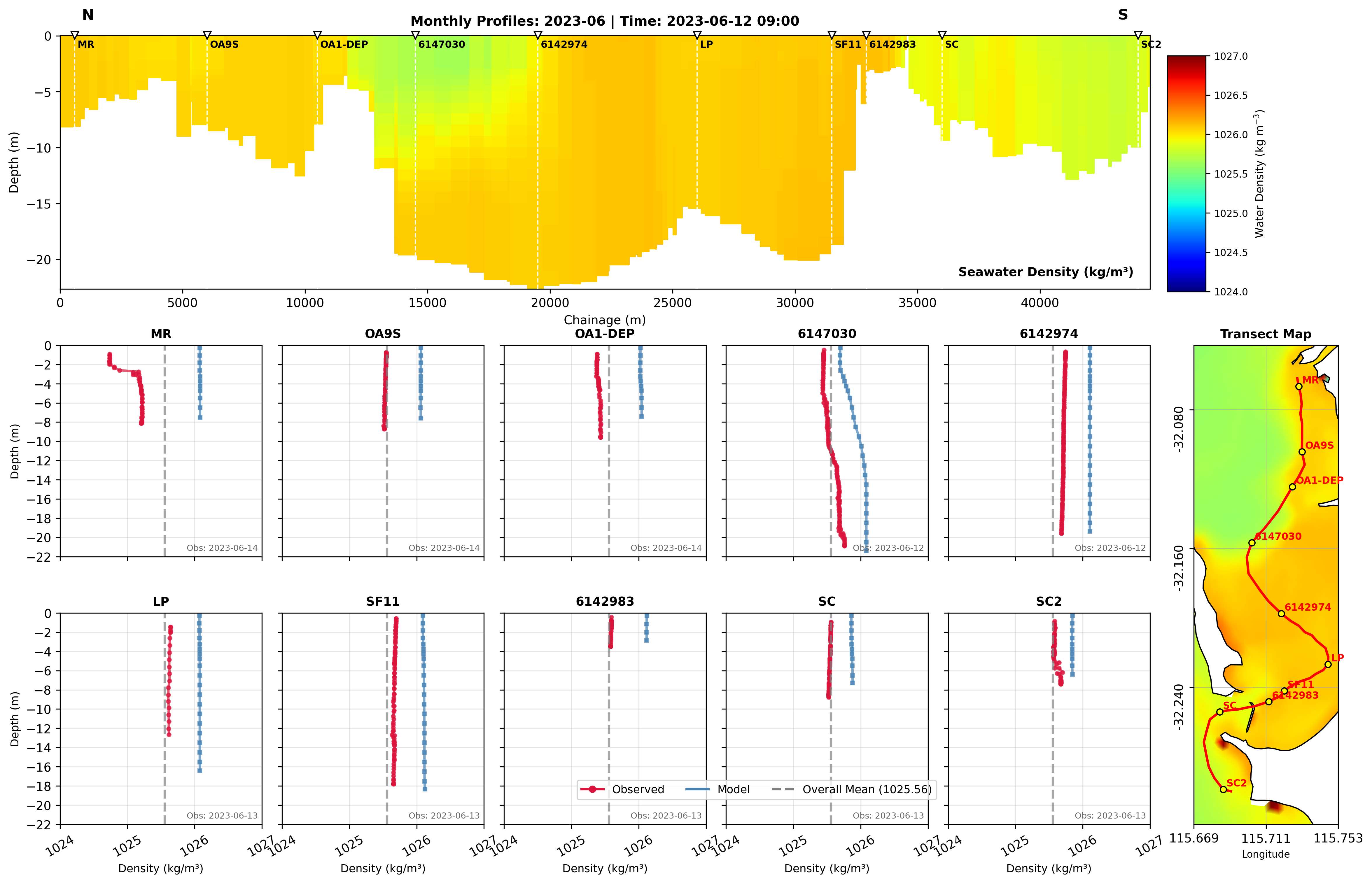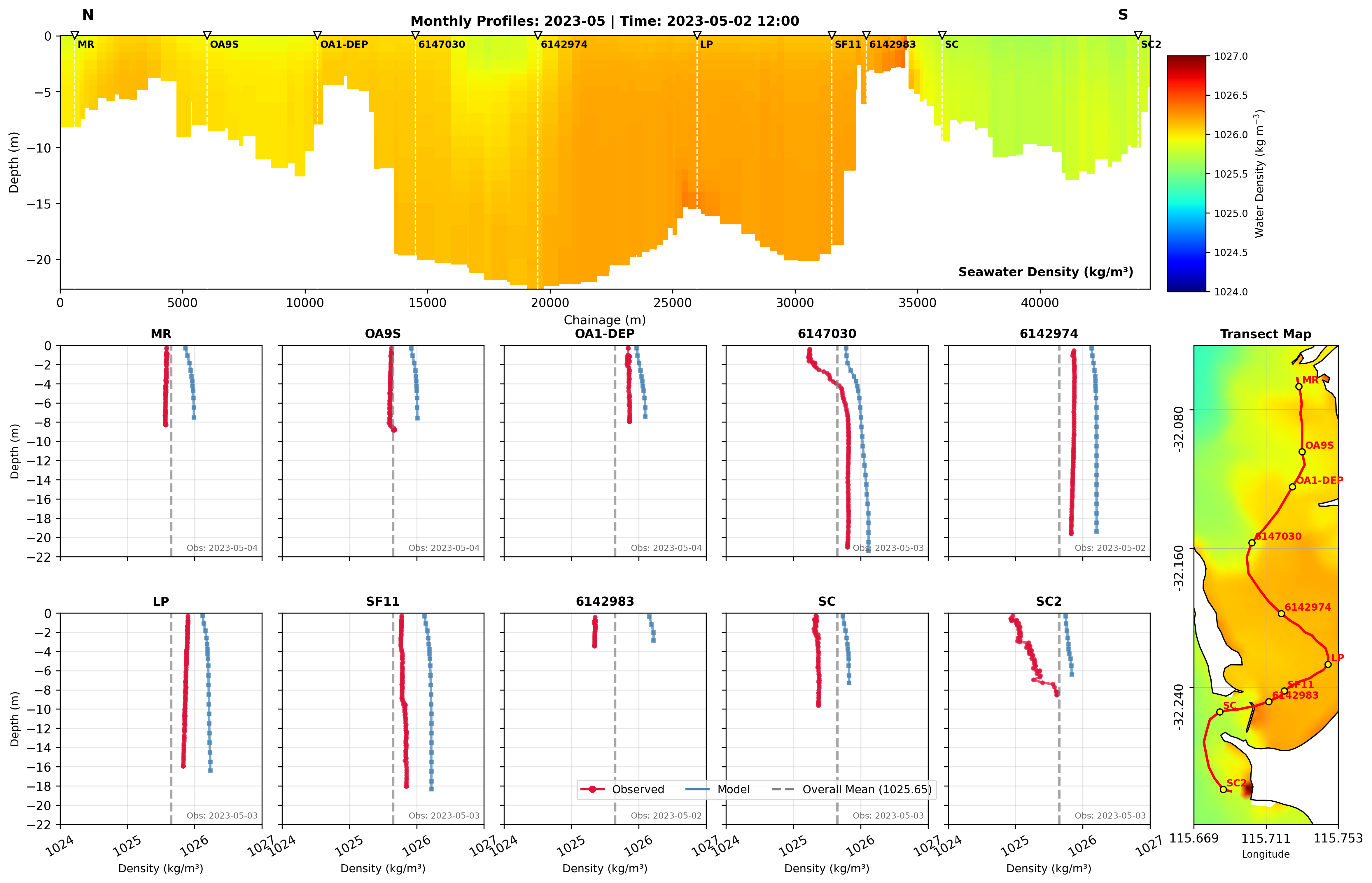 Figure 9.7. Monthly density profiles at a site in the north of the deep basin for the year 2022, comparing model predictions with observed data. Profile data from DWER-CSMWQ.