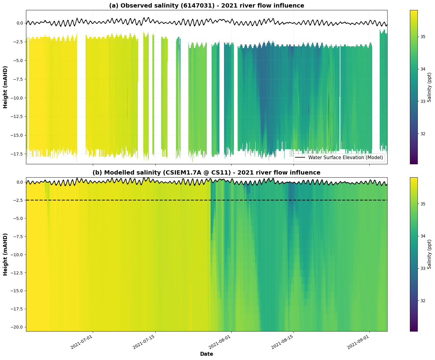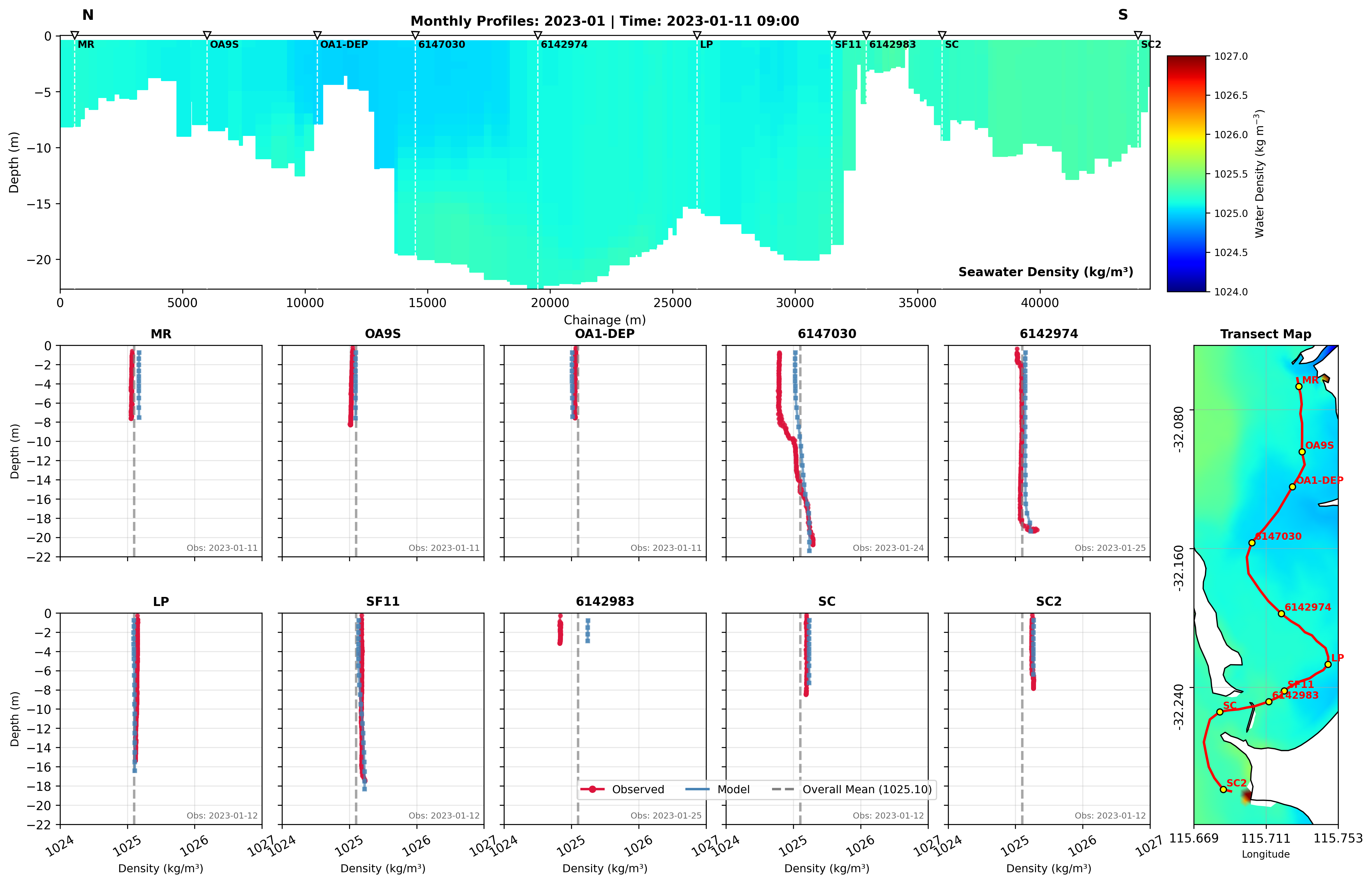 - Sensitivity to Swan River flows: validated against the 2021 winter flood event, capturing plume penetration into the Sound, the timing of salinity dilution at distal moorings, and the progressive deepening and erosion of the brackish surface layer; accurately resolving the different response of 2021 (southward) and 2022 (northward) high-flow events on Cockburn Sound salinity