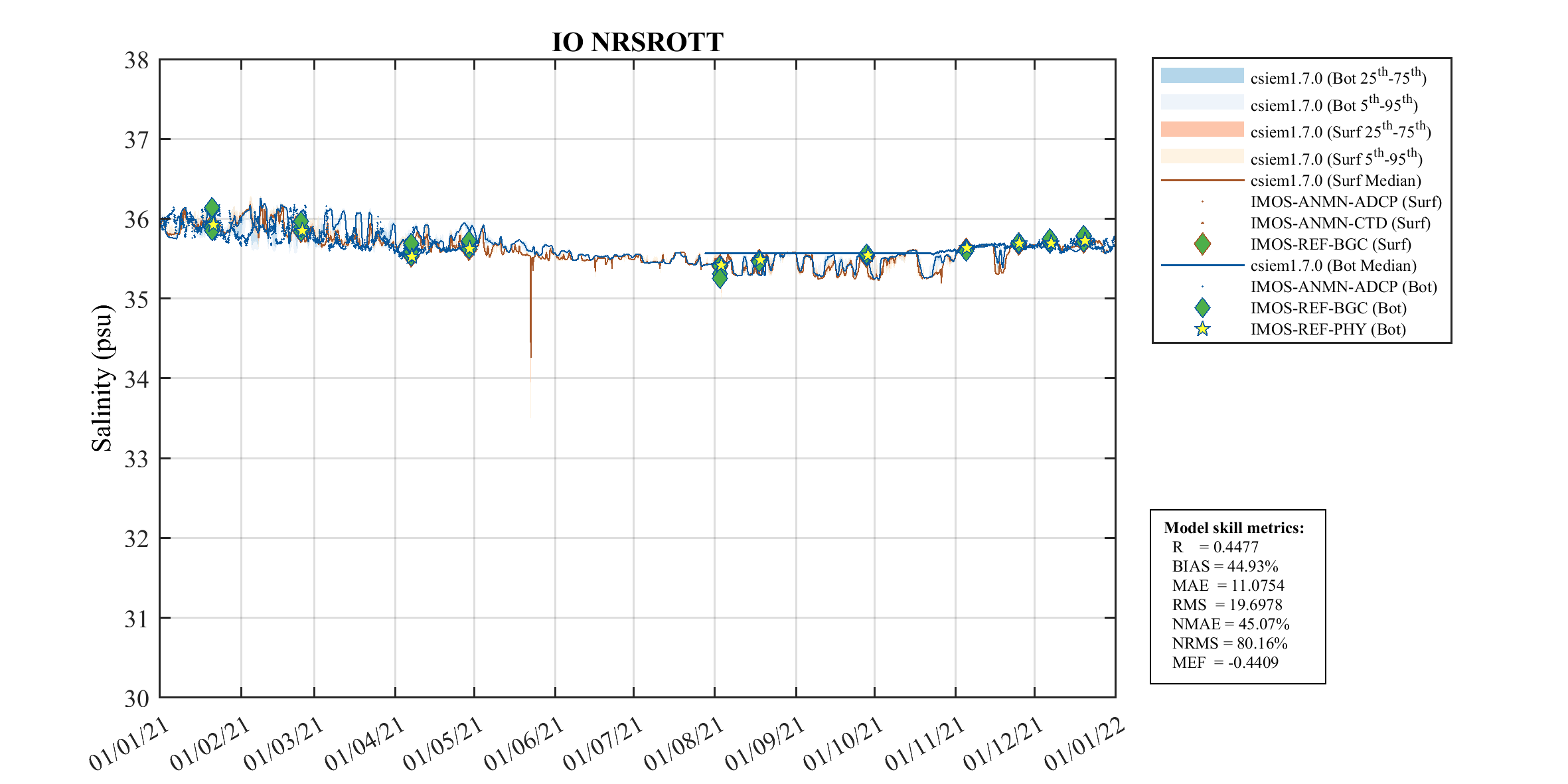 Figure 9.6-iv. Comparison of Cockburn Sound (CS_Region) polygon salinity predictions with all available observations, for the year 2021, showing the seasonal variability within the Sound. Click to enlarge