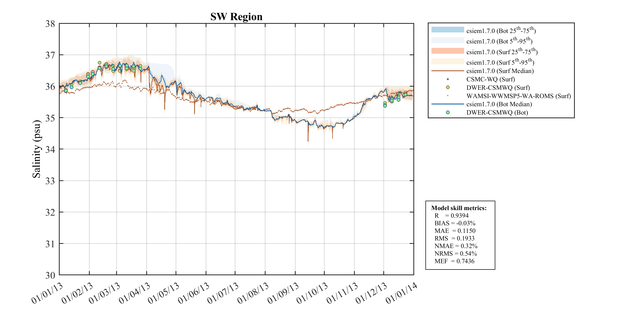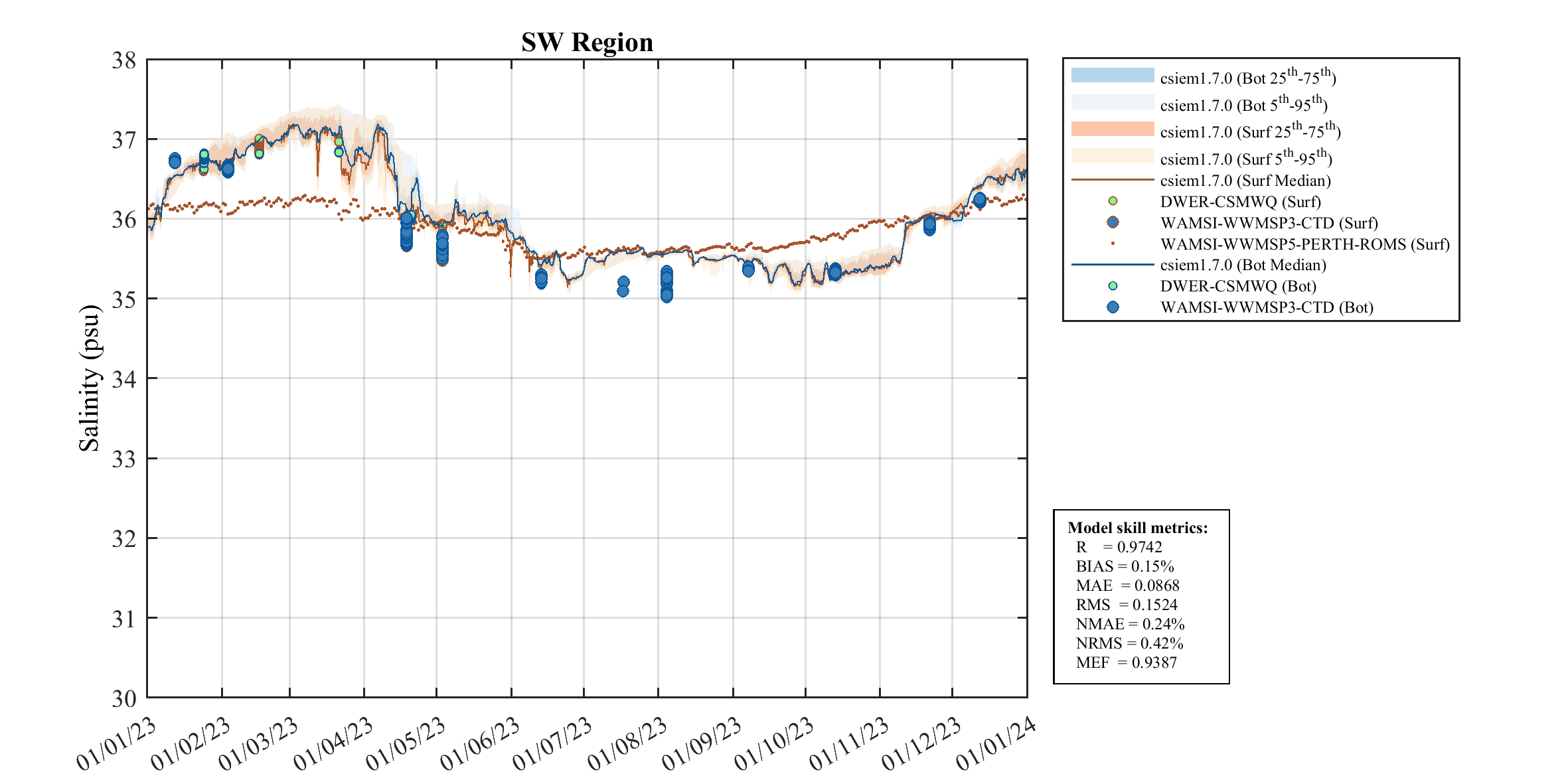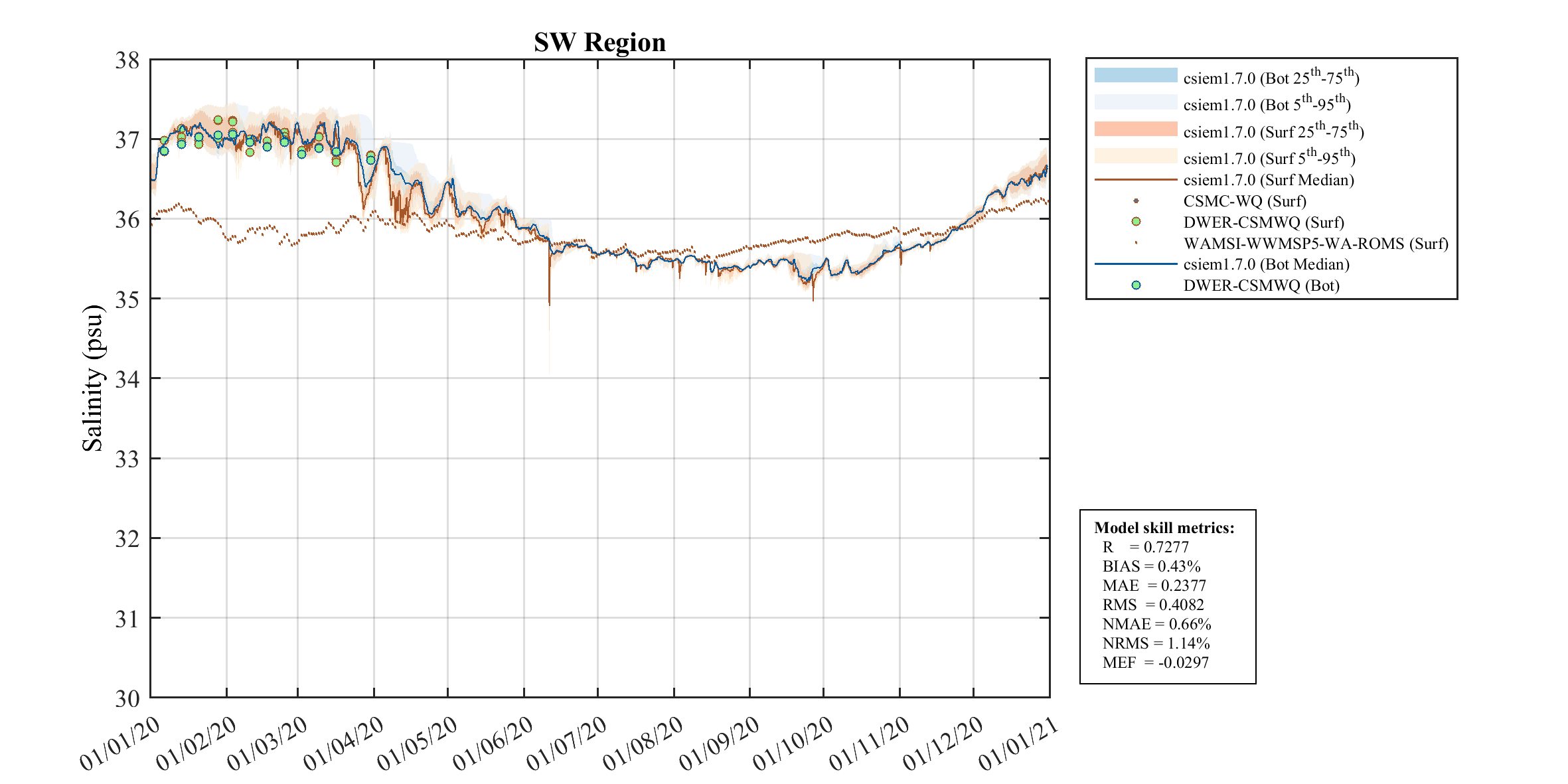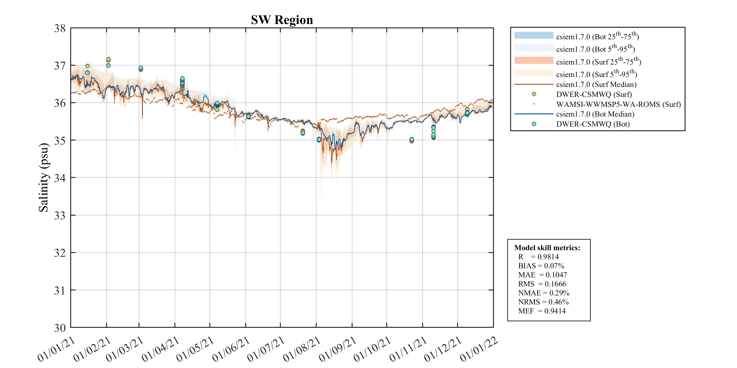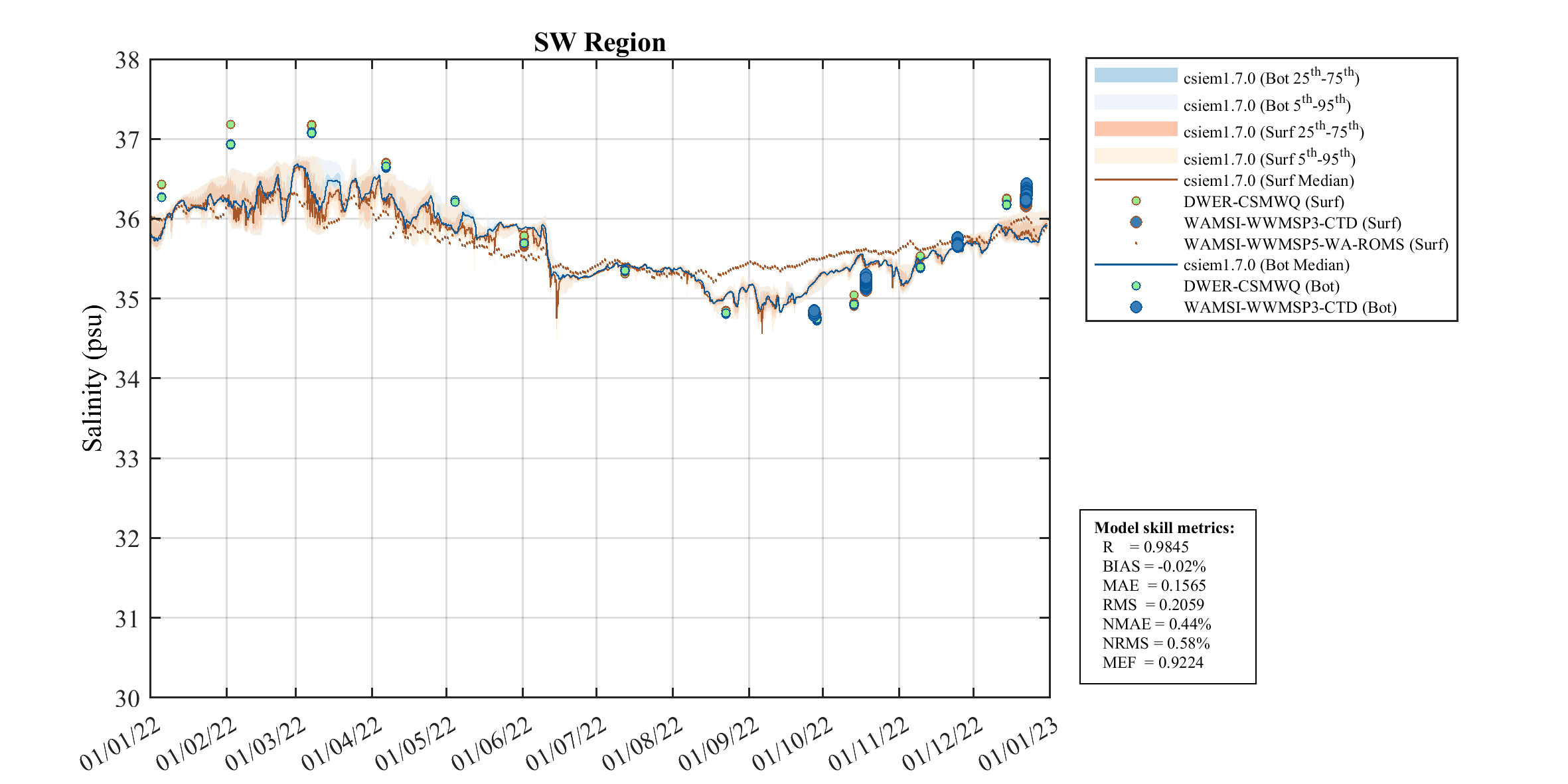 An analysis of the 2km WA-ROMS regional model identified issues associated with the intra-annual variability in salinity (see salinity bias-correction in Chapter 8.3). To demonstrate the significance of this correction on the CSIEM model performance, multiple years of the simulation were compared at a region off Rottnest and a nearshore region south of Cockburn Sound. These results show the bias-corrected salinity forcing used in CSIEM is able to accurately capture the seasonal patterns (or lack thereof) in the observed data outside of the main CSOA region of interest. In the (nearshore) SW region, the comparisons include the ROMS prediction to demonstrate the need for the bias correction in the nearshore boundary polygons in order to prevent inaccuracies entering the domain at the northern and southern edges.