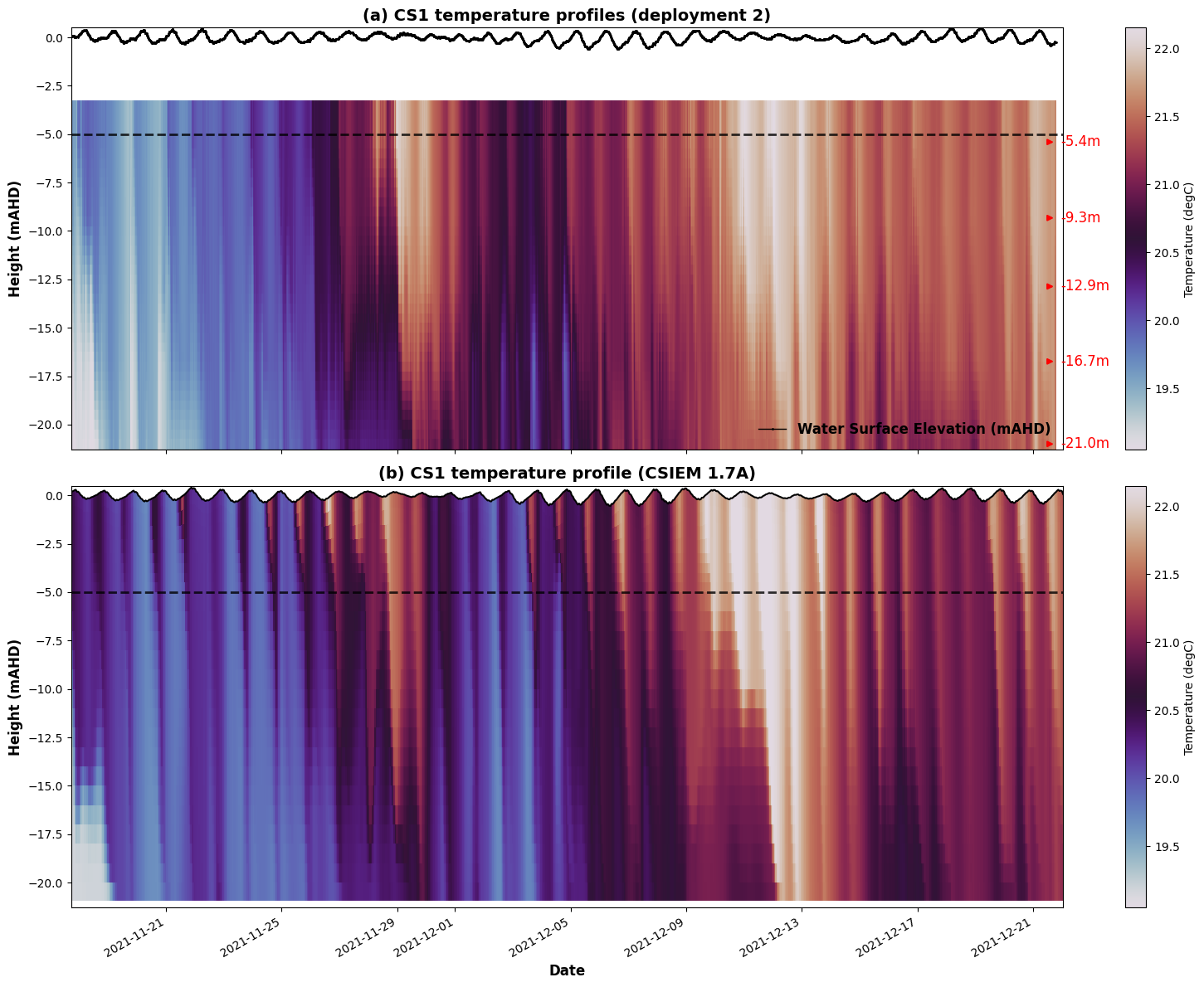 Figure 9.22-i. Comparison of observed (a) vs modelled (b) vertical temperature profiles at site CS1 (north end of the deep basin). The observation depths are indicated by the red markers in panel (a) and were vertically-interpolated to create a 5cm resolution profile for each hour. The horizontal dash-line demarcates the depth below which model vs observed data should be compared.