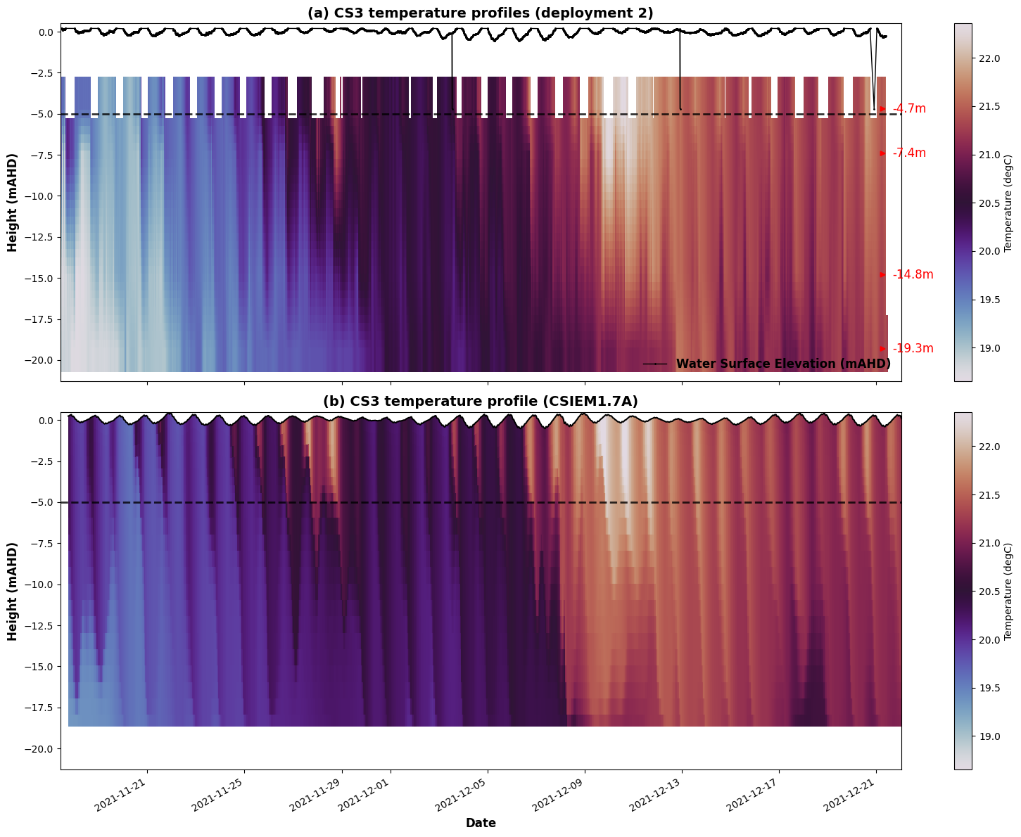 Figure 9.22-ii. Comparison of observed (a) vs modelled (b) vertical temperature profiles at site CS3 (south end of the deep basin). The observation depths are indicated by the red markers in panel (a) and were vertically-interpolated to create a 5cm resolution profile for each hour. The horizontal dash-line demarcates the depth below which model vs observed data should be compared.
