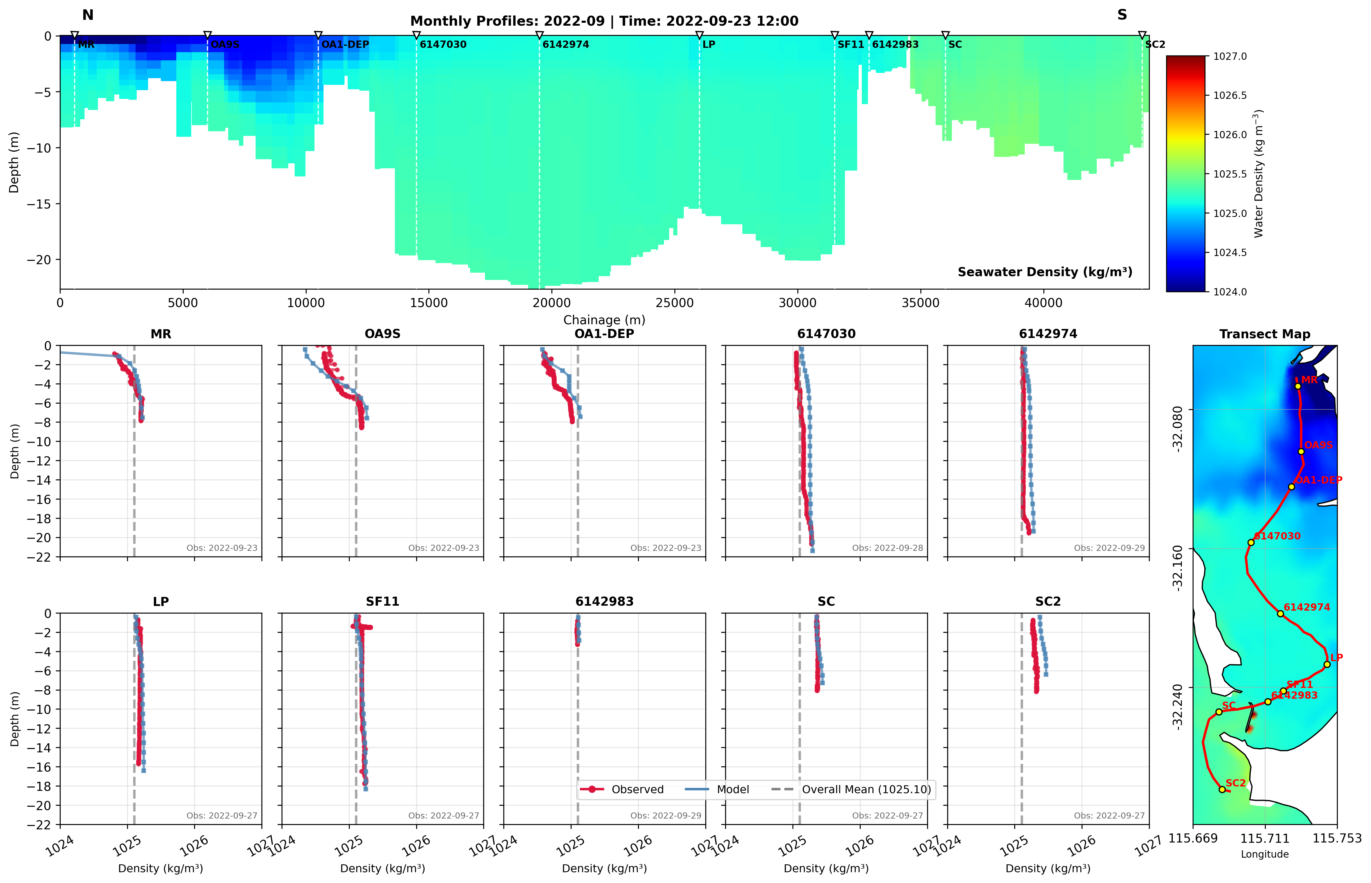 A key feature of Cockburn Sound in summer and autumn is short to medium periods of water column density stratification (Dalseno et al., 2024; Xiao et al., 2024). The model has therefore been explored in terms of its ability to resolve periods of vertical stratification. Figure 9.20 depicts the dynamics of thermal stratification developing in the main basin during an early summer period, and Figure 9.21 shows monthly transect profiles of temperature, salinity and current speed across Cockburn Sound and Owen Anchorage from September 2022 to June 2023.