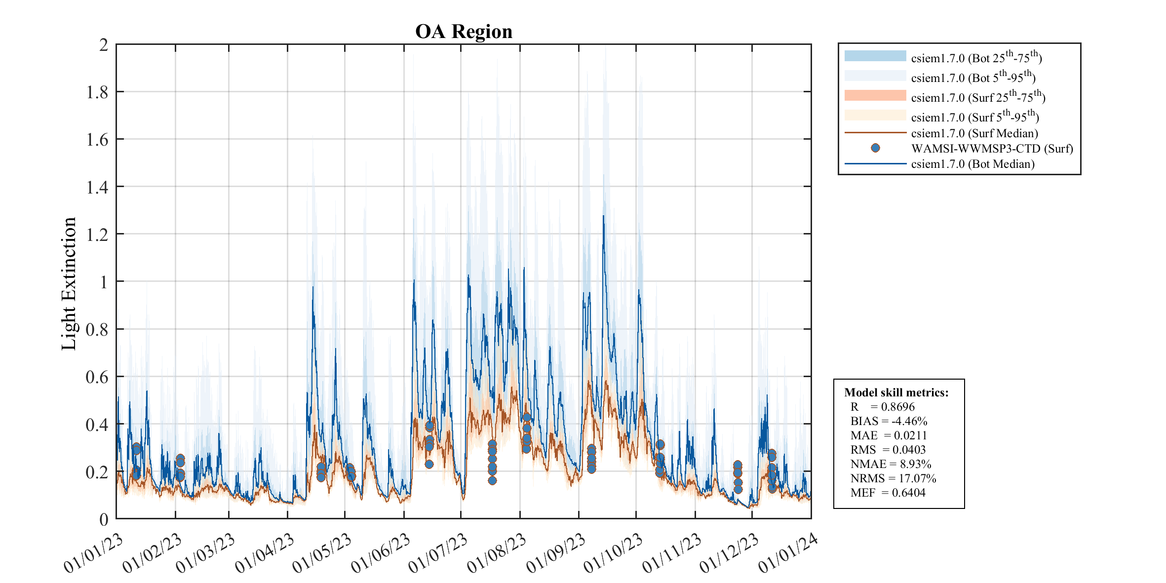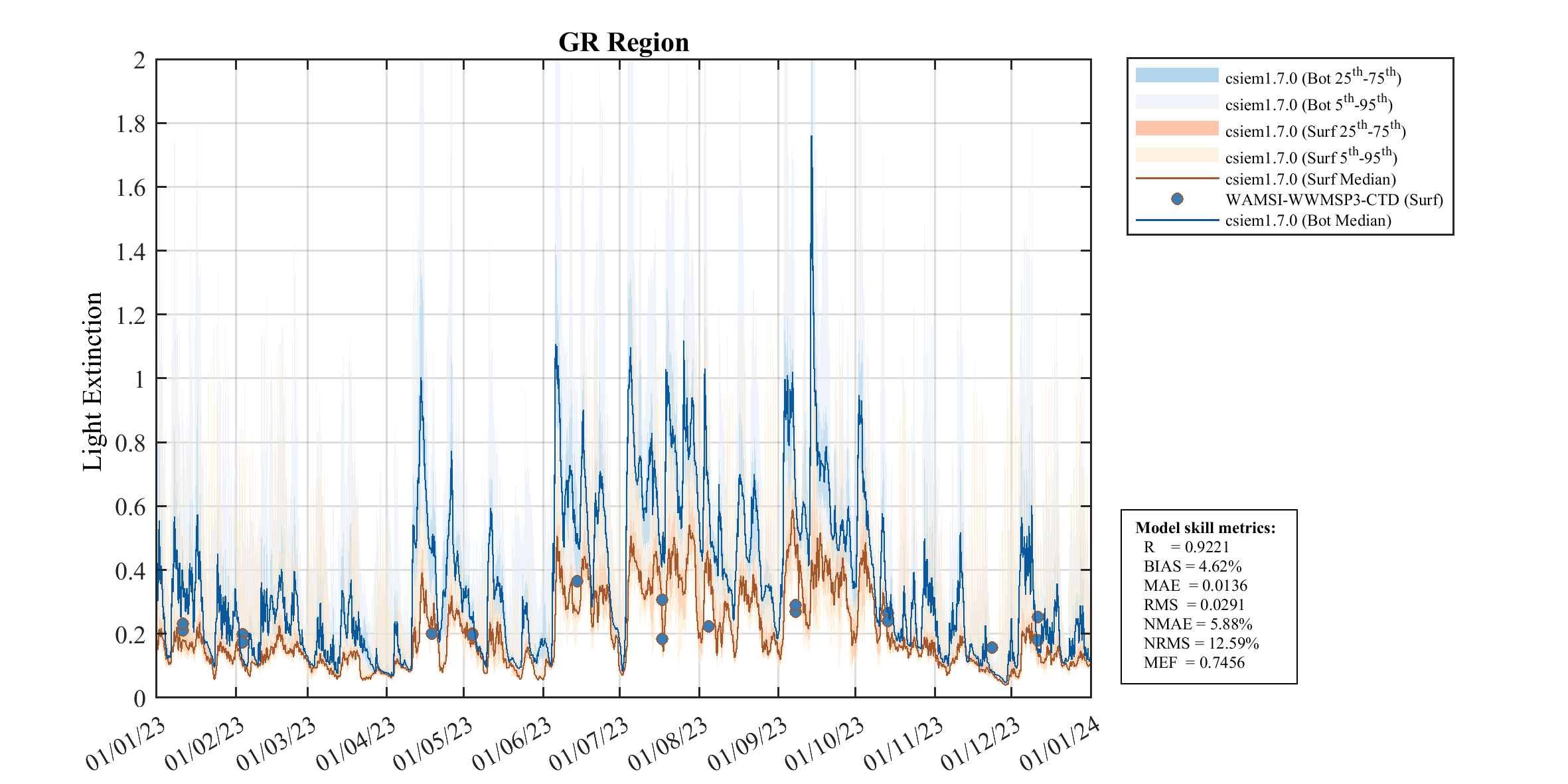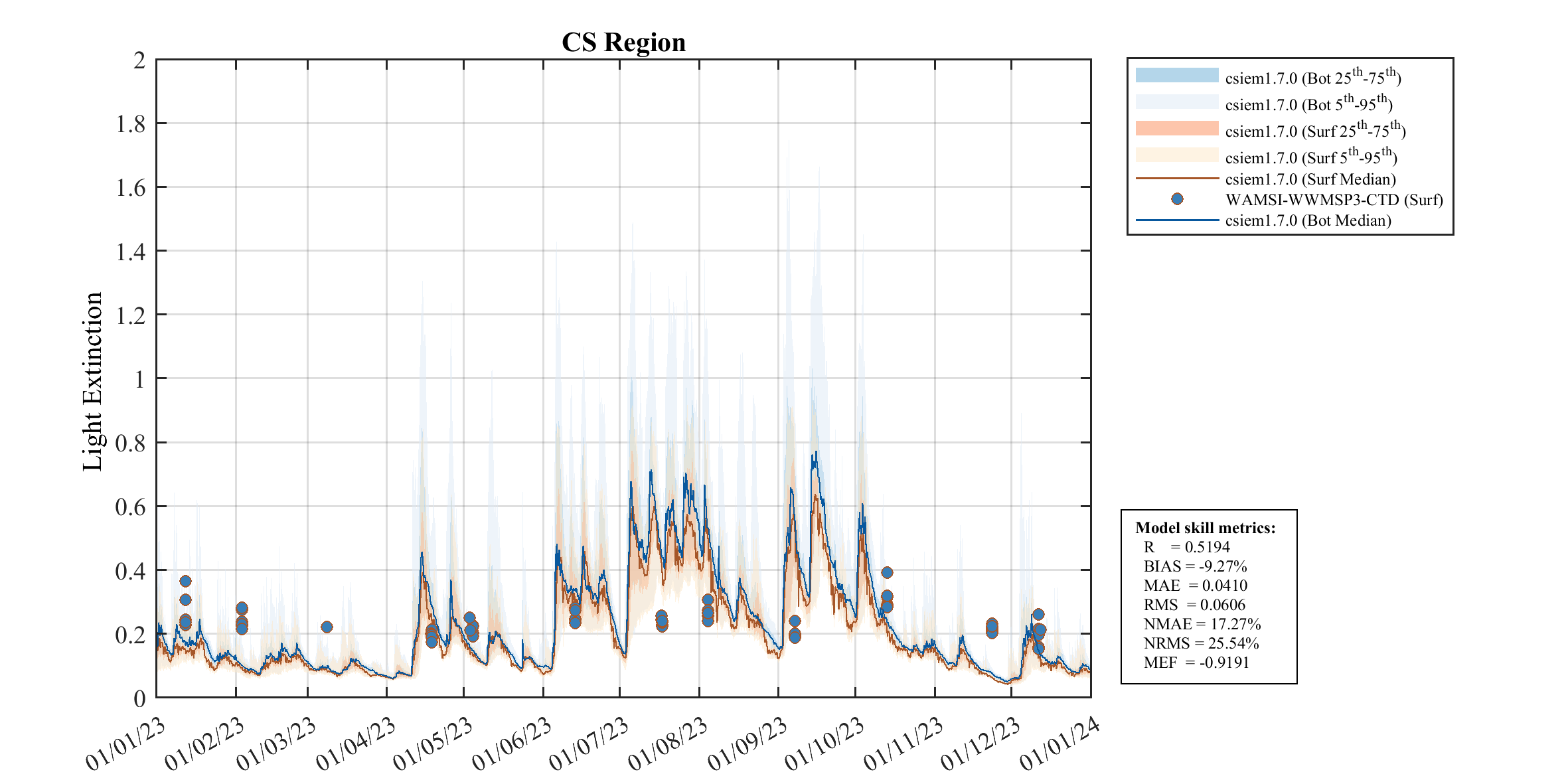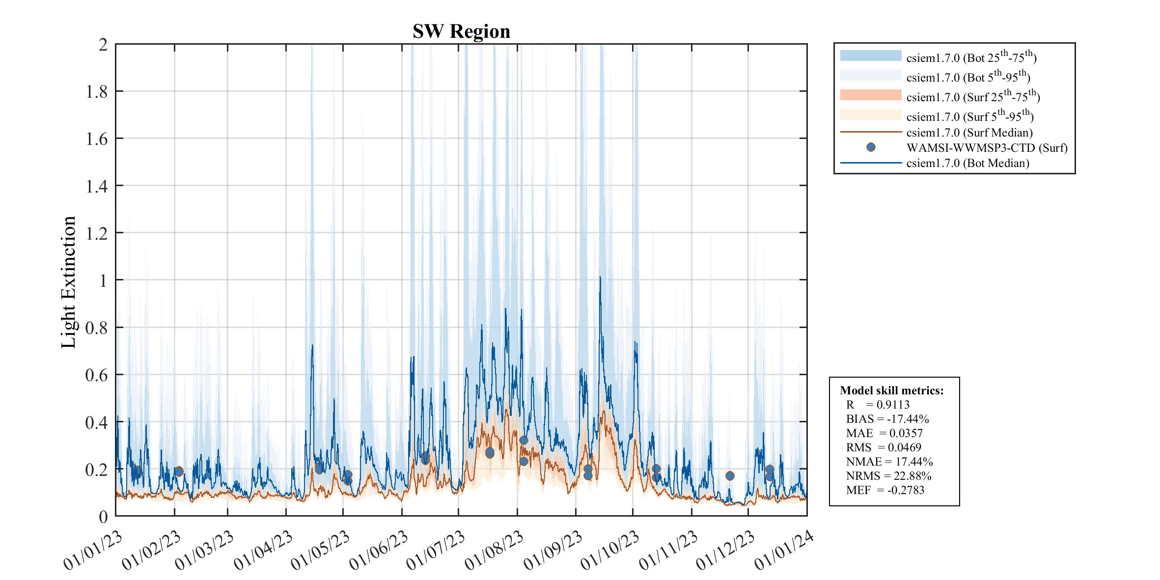 The CSIEM model is well suited to resolving the variability in the underwater light climate. Underwater irradiance is closely related the inherent optical properties of water, such as suspended solids, detrital material, and total chlorophyll-a, and the performance of CSIEM in capturing these is reported in Chapter 12.