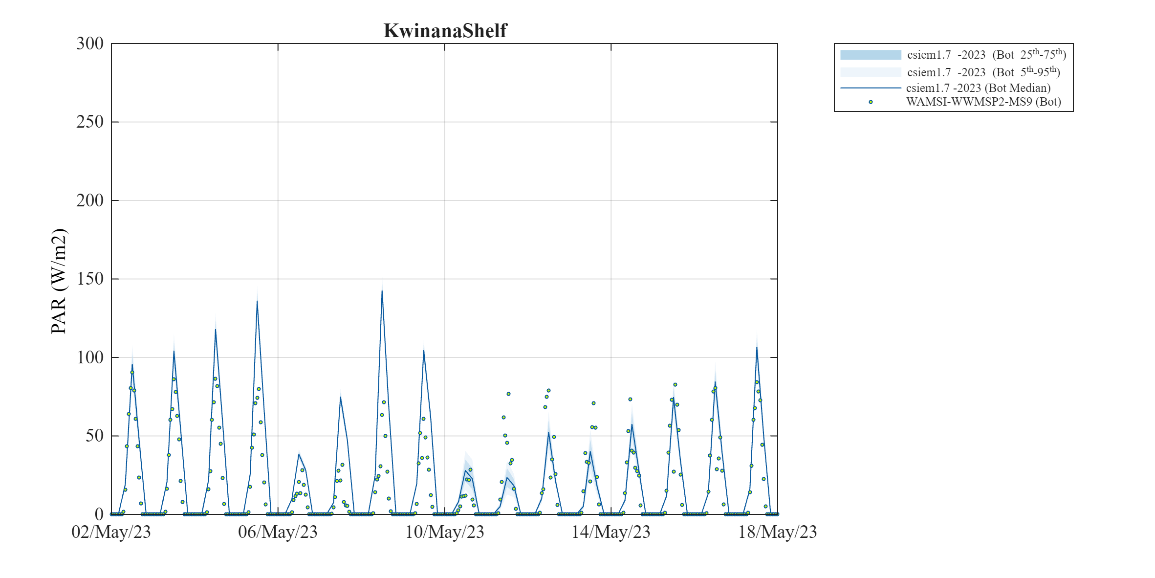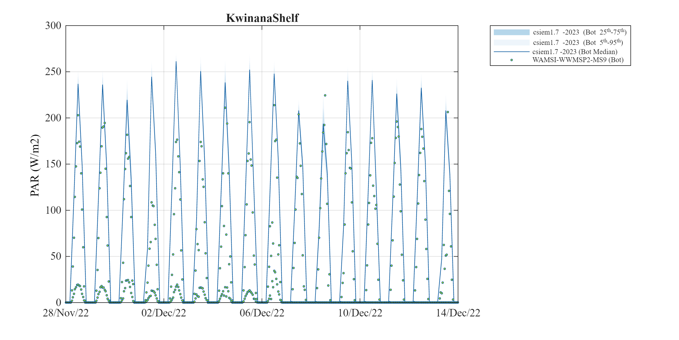 Figure 13.4-i. Comparison of observed and simulated light (\(PAR,\:W/m^2\)) on the Kwinana Shelf in December 2022. [REPLOT TO REMOVE SHADED REPLICATE]