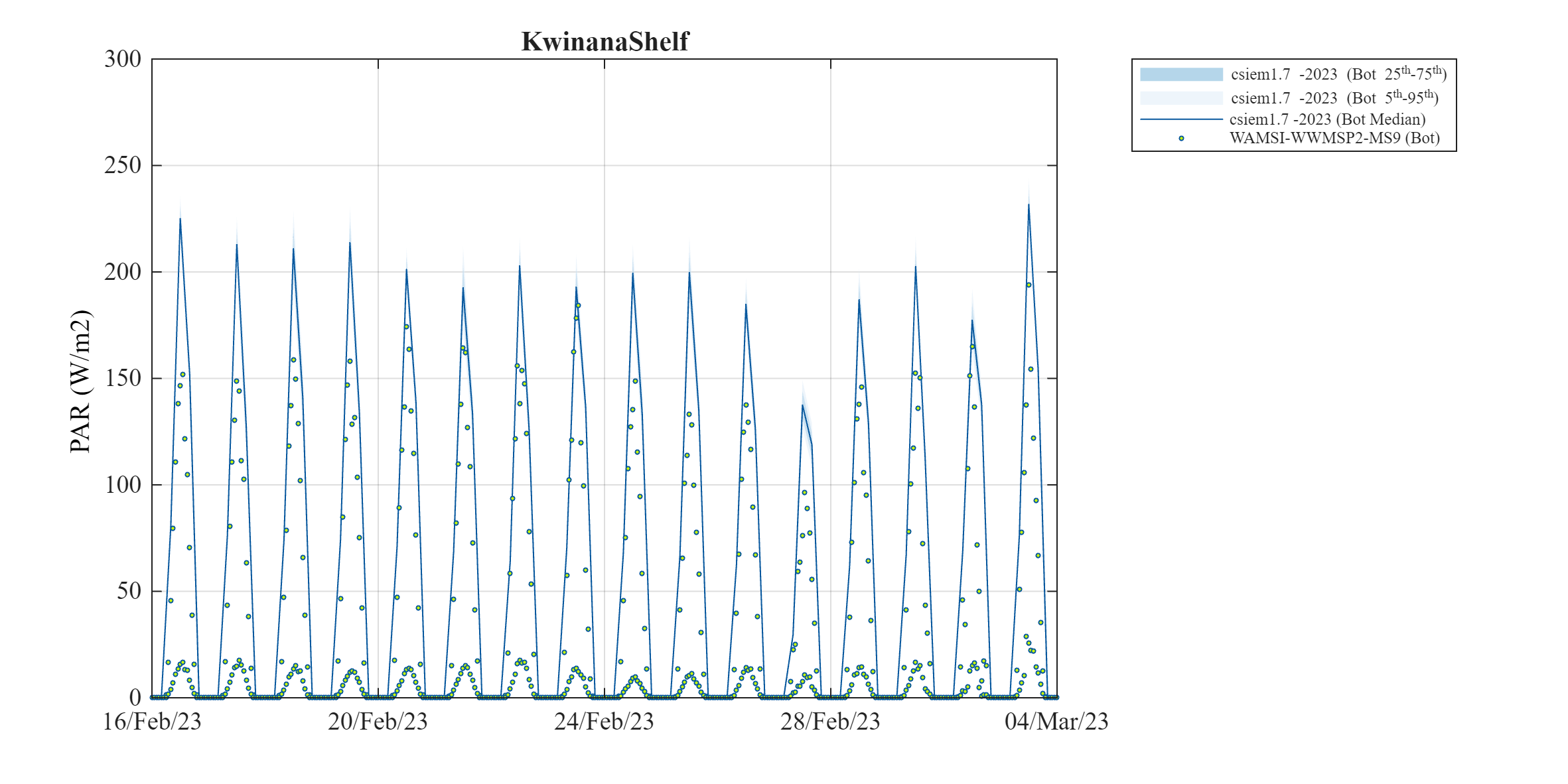 Figure 13.4-iii. Comparison of observed and simulated light (\(PAR,\:W/m^2\)) on the Kwinana Shelf in February 2023. [REPLOT TO REMOVE SHADED REPLICATE]