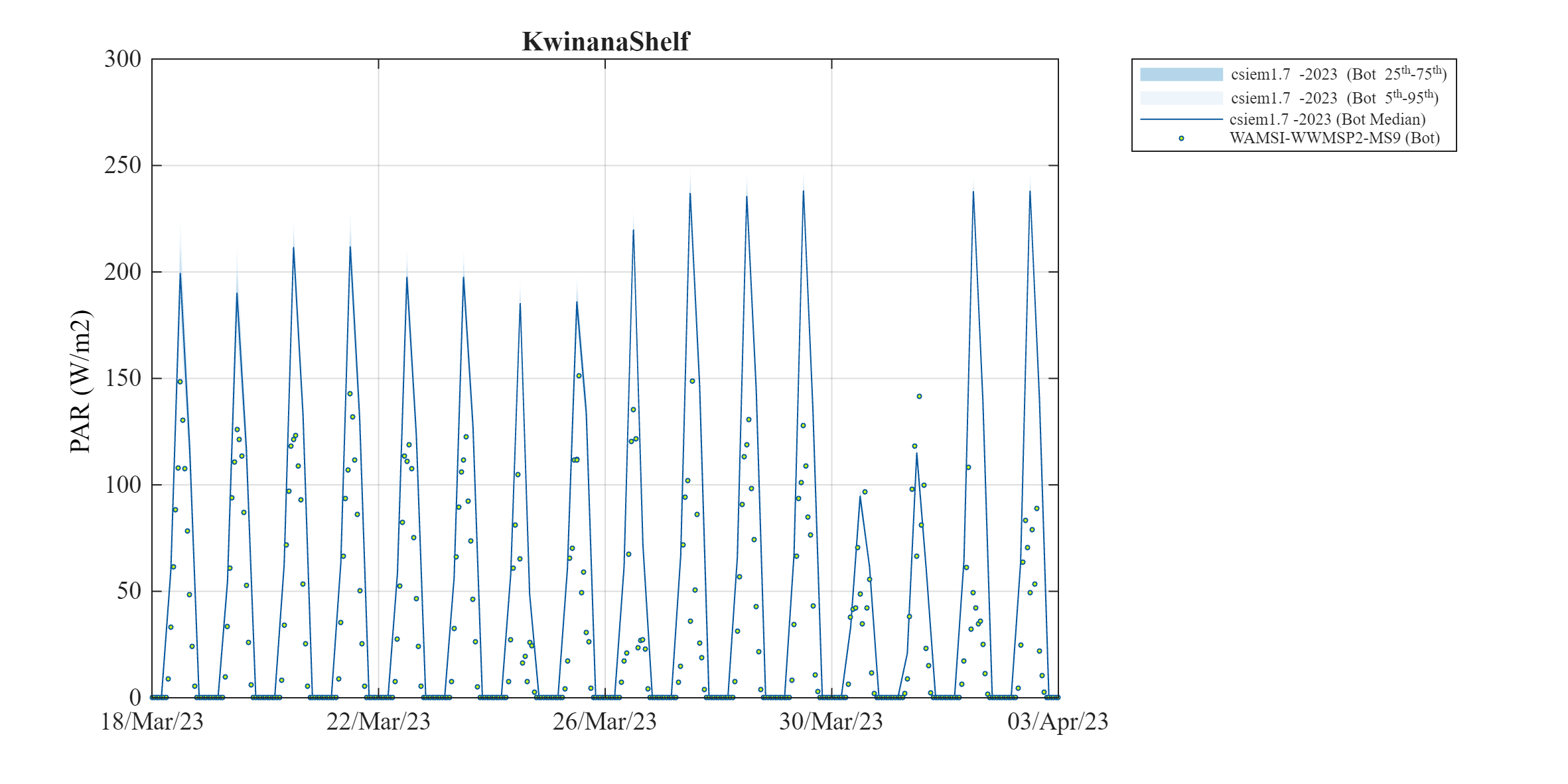 Figure 13.4-iv. Comparison of observed and simulated light (\(PAR,\:W/m^2\)) on the Kwinana Shelf in March 2023.