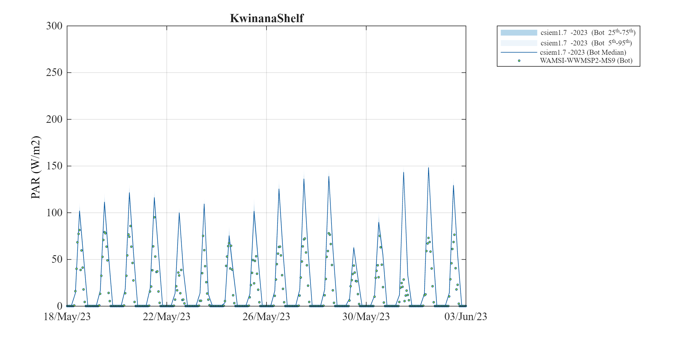 The bulk-PAR light model within AED was assessed using the WWMSP2-MS9 data-set (REF et al., 2024). The data-set sits at a sebed depth of ~8 m on the western edge of Kwinana Shelf, and shows a range of conditions spanning from summer to 2022/2023 through to winter of 2023. Figure 13.XX below shows six 2-3 week periods where conditions were assessed. For this comparison the data was assumed to sit 20 cm above the seabed, and this was compared with the upper face of the bottom-most model layer.