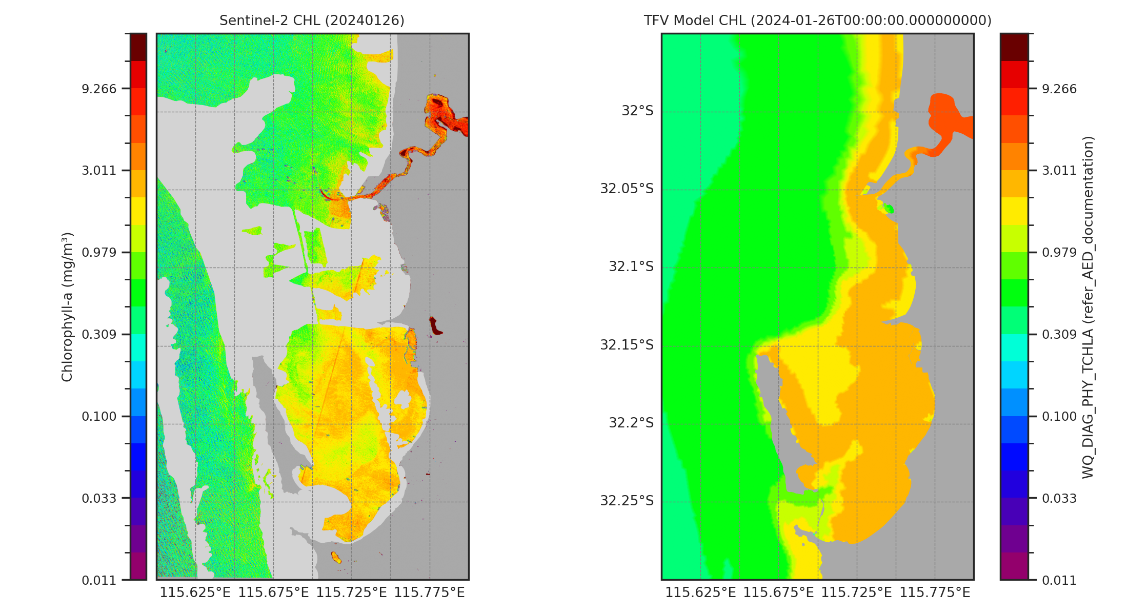 The areas of high and low biomass vary along the coast at different times of year, in repsonse to the prevailing hydrodynamics. There is a general tendency of higher algal biomass being observed in the southern reaches of the Cockburn Sound and areas of reduced exchange along the Kwinana Shelf. For an example, a period of biomass build-up in January 2024 was observed within the 2024-01-26 Sentinel-2 imagery, showing the spatial pattern and in particular the northward tendency of the waters originating from the Sound. The model predicted biomass gradient was compared with this image, and displayed a similar spatial pattern (Figure 12.x). The controls on this event is discussed further below.