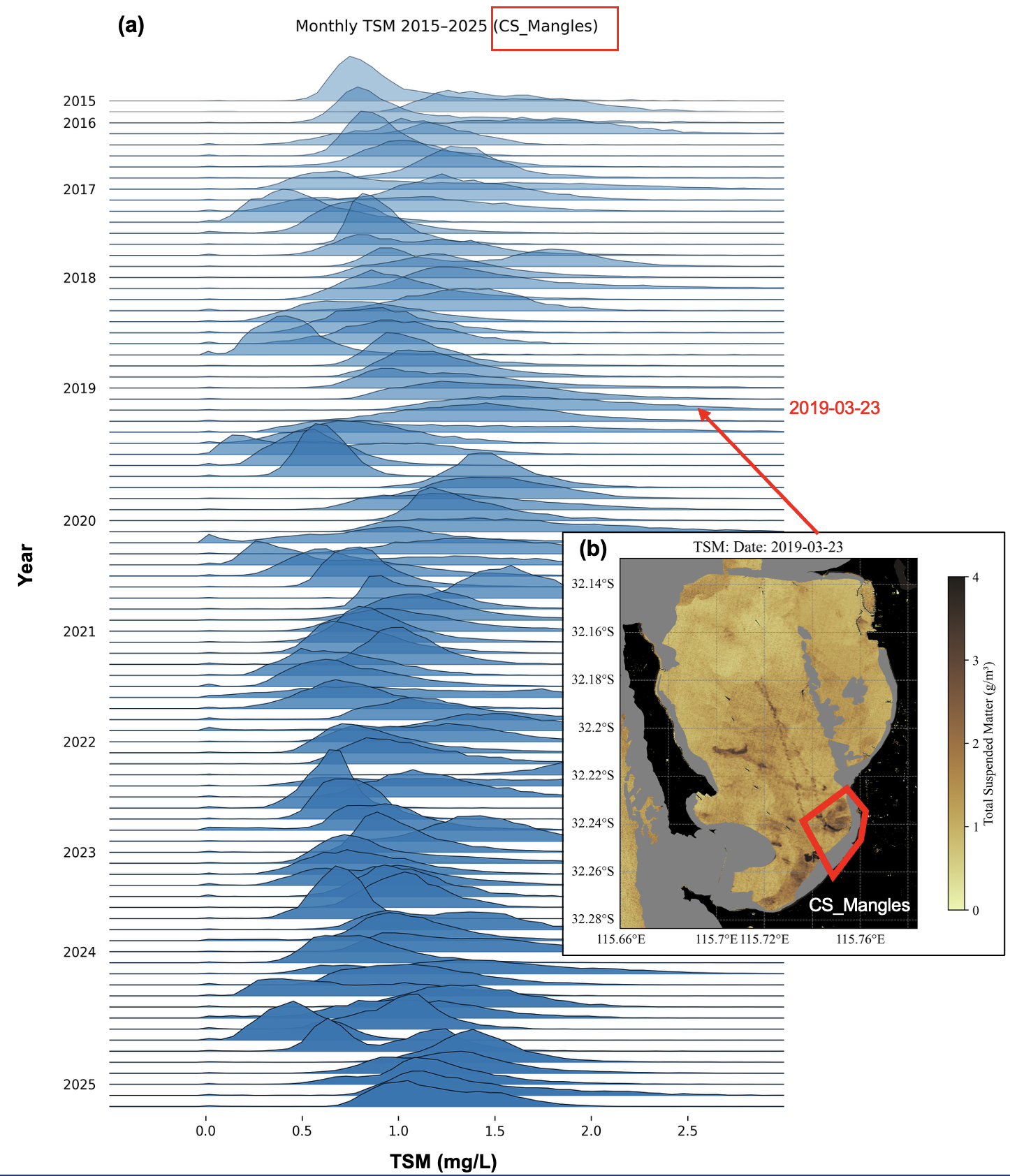 Figure 12.1. Changes in water TSM within the CS_Mangles polygon. (a) ridgeplot showing TSM density in the selected polygon for each of 96 identified Sentinel-2 images (note the height of the ridge is the frequency of that value within the pixels within the selected polygon). (b) selected image from March 2019 showing the observed TSM pattern within the harbour and location of the CS_Mangles polygon used to compute the ridgeplot distributions. Note that the ridgeplot distributions removed the “masked” regions indicated by grey to remove areas confounded by bottom reflectance issues. To view further ridgeplot summaries for other CSIEM assessment polygons, visit the csiem-data repository.