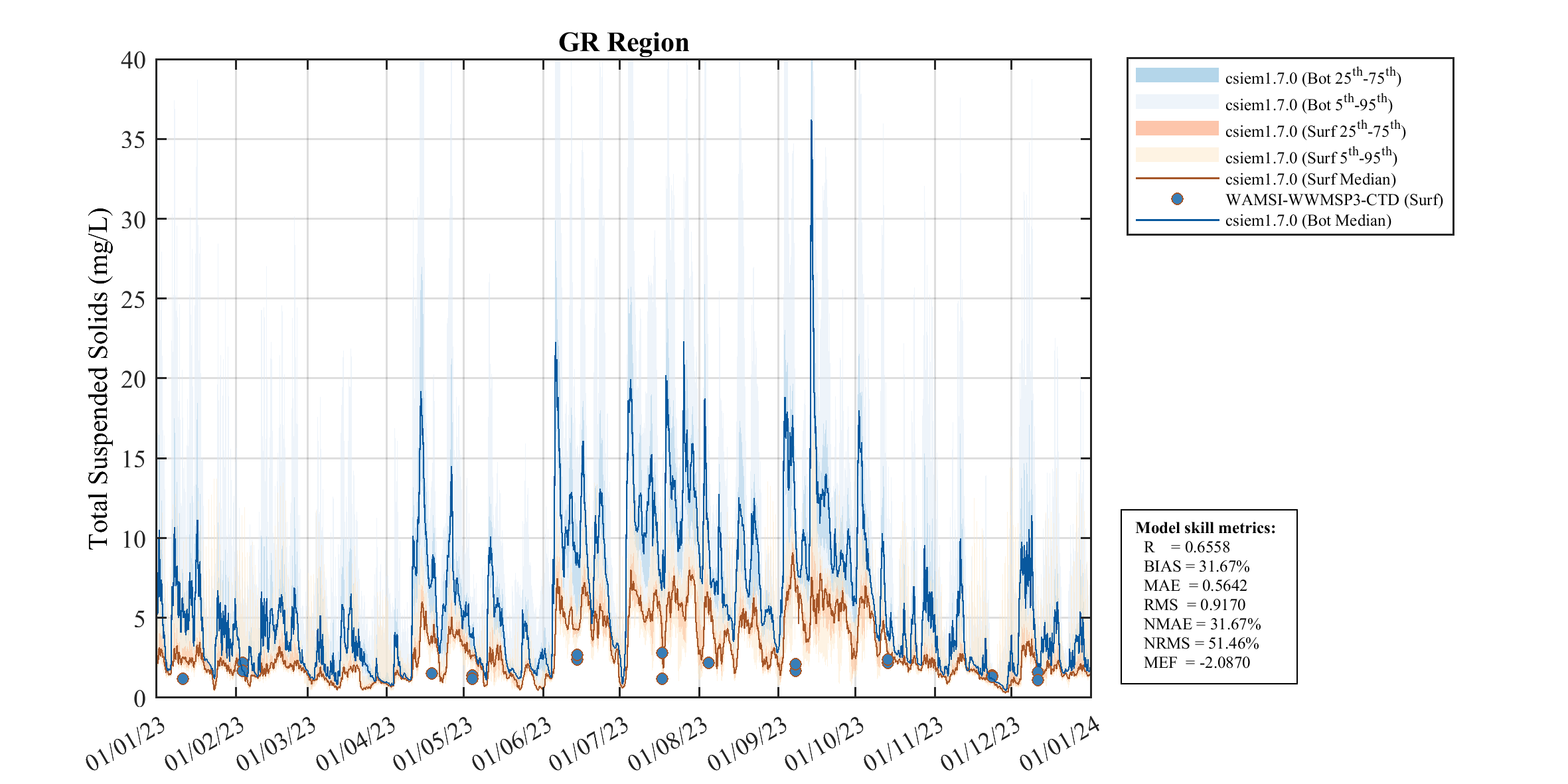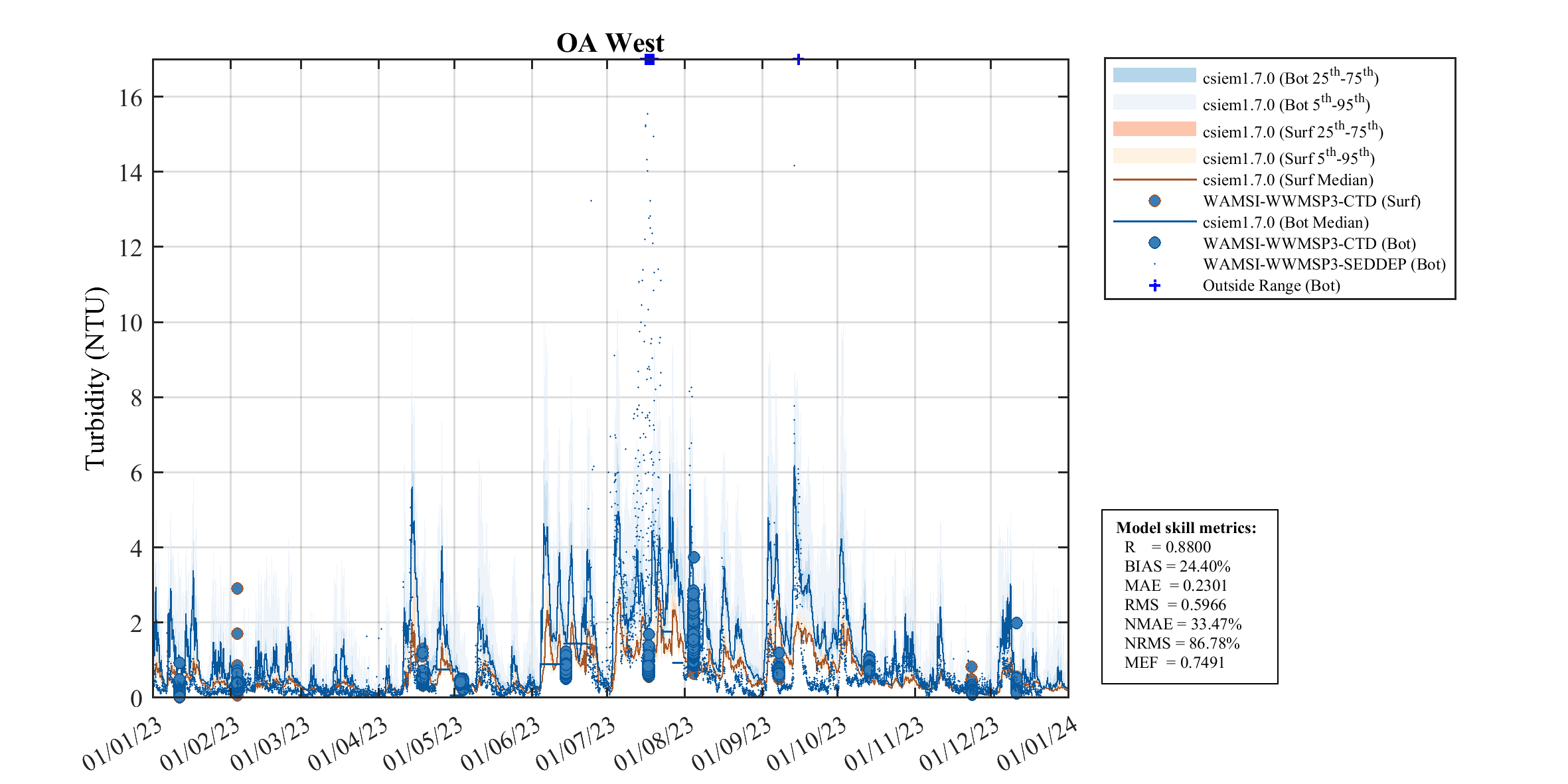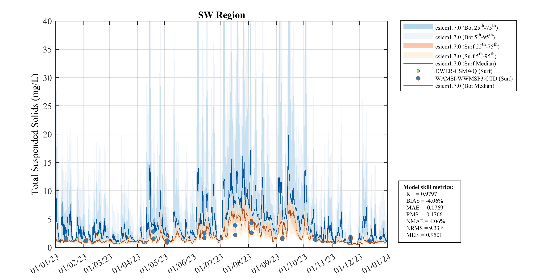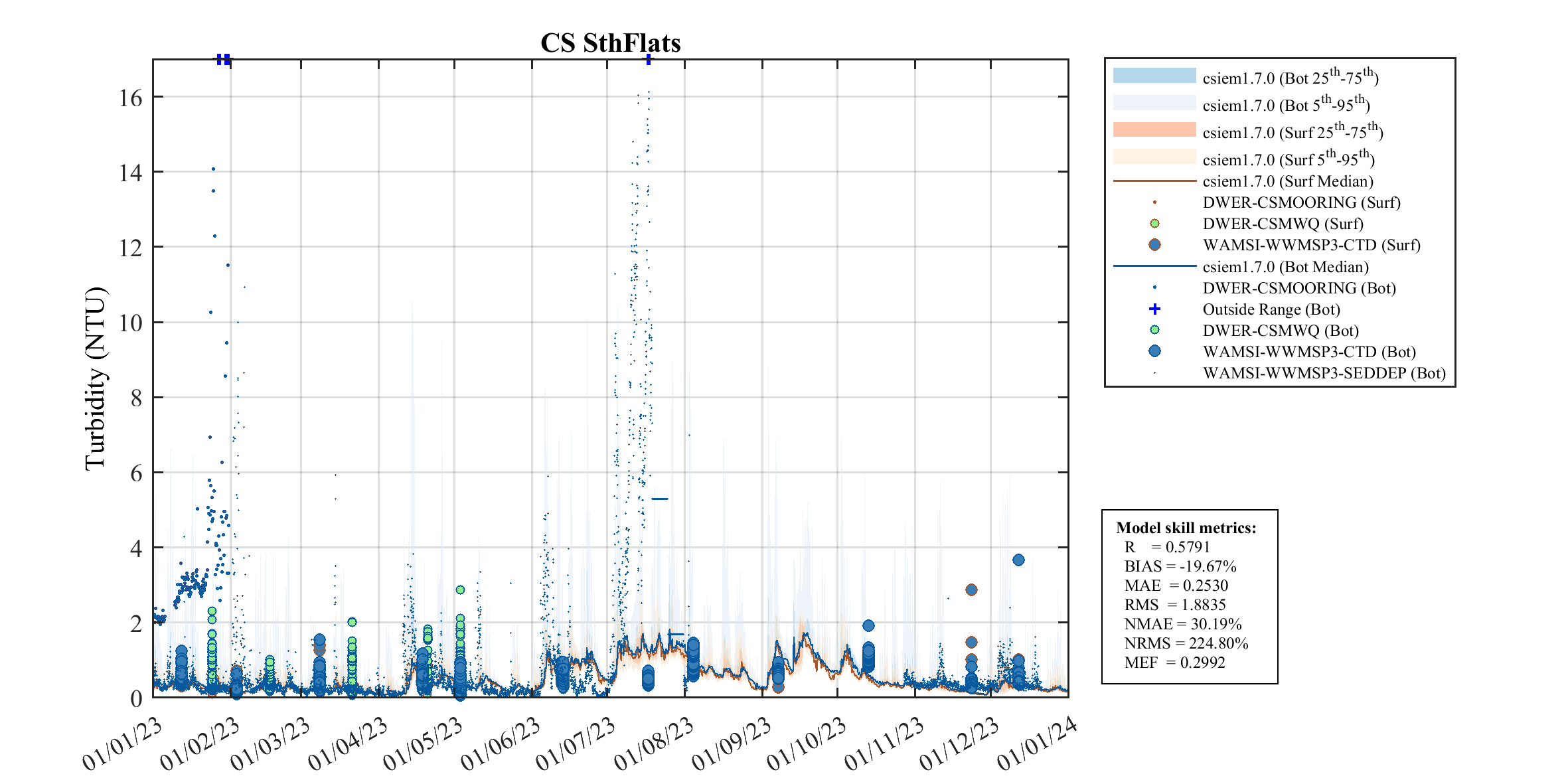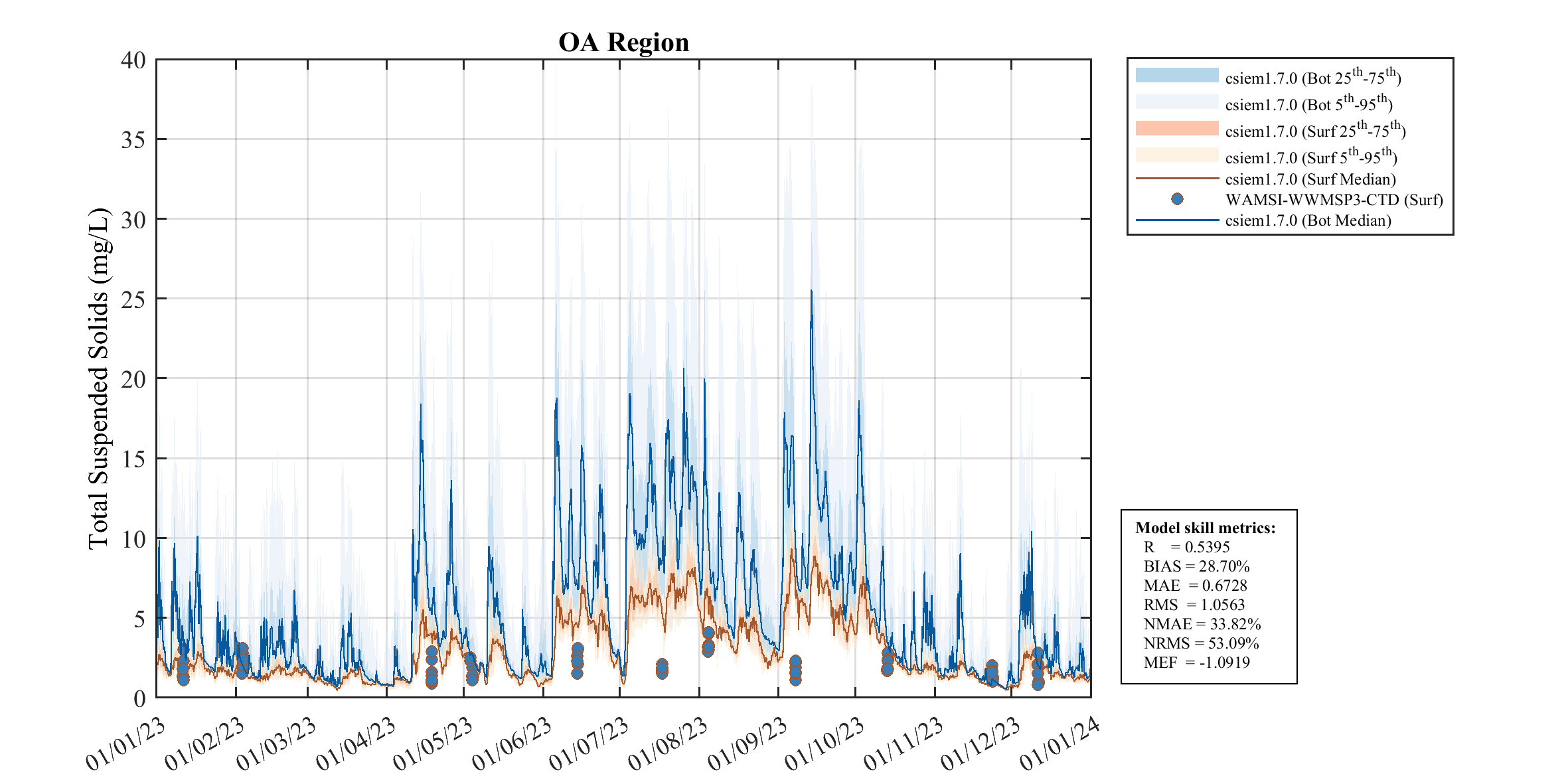A summary of the annual cycle of TSS predicted by the model is shown in Figure 12.4 for the year 2023, when several data-sets were available. This figure shows the different dynamics between the major regions within the model domain (CS, OA, GR, SW), with the highest peaks occurring in the GR and SW regions which are more exposed to extreme wave conditions. The model shows the tendency to over-predict slightly in the months between June - September within the CS and OA regions. The plots also highlight the difference in the regions between the surface and bottom TSS concentrations, with differences occurring due to the spatially variable coarse:fine particle ratio in the different benthic zones. As the grab-sample data is taken from the surface the model calibration focused on comapring the surface time-series with the observations.