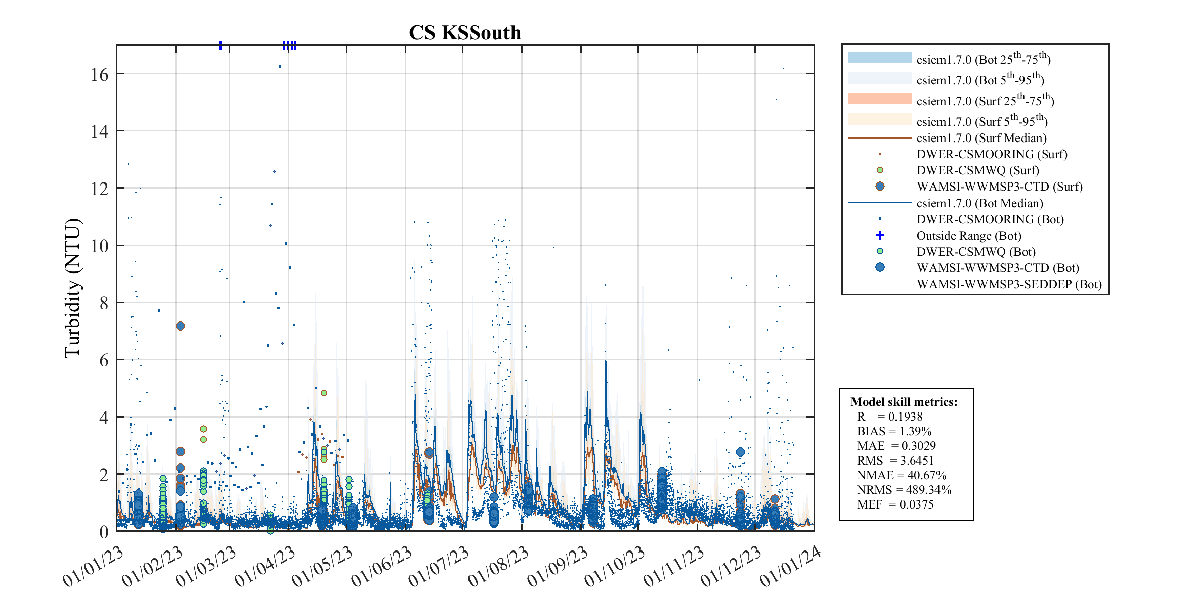 The TSS in the AED model is based on a combination of the two inorganic particles groups, organic detrital material and phytoplankton, with each of these particles groups resolved by a characteristic sedimentation rate and resuspension rate, with later controlled by sediment supply and benthic habitat coverage (see Section 11.3). In this section, we focus on looking at TSS and turbidity data, noting that chl-a and organic matter pools are reported on specifically in subsequent sections.
