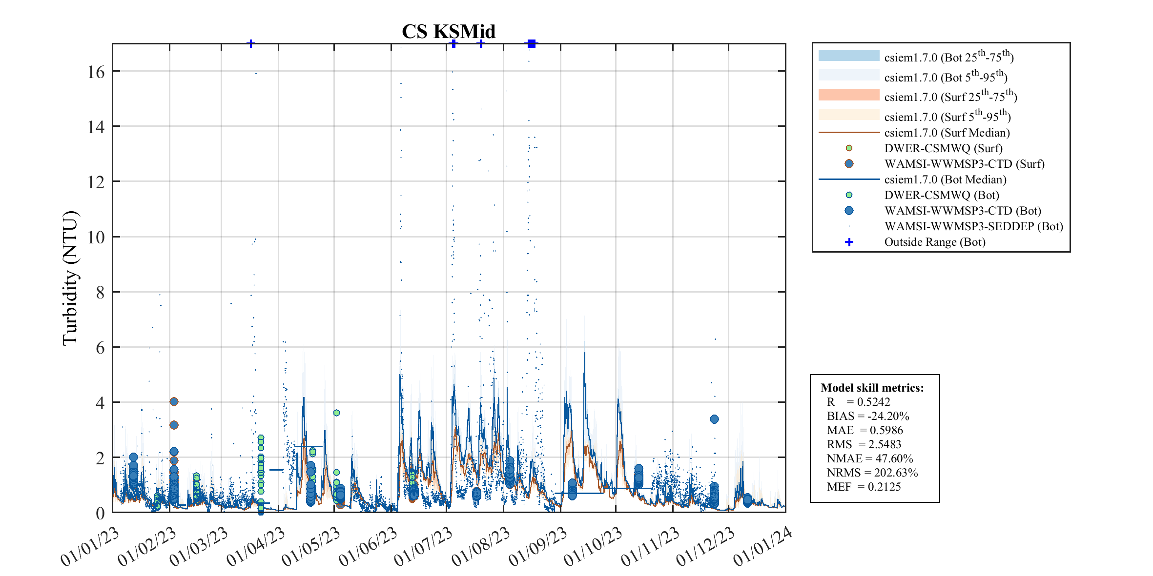 Images of \(TSS\), \(Turbidity\), \(DO\), \(TN\), \(TP\), \(NO_3\), \(NH_4\) and \(PO_4\) across multiple sites and multiple years, comparing both surface and bottom conditions are viewable via the MARVL-VIEWER web-app. The inset of each time-series plot also includes model-fit metrics.