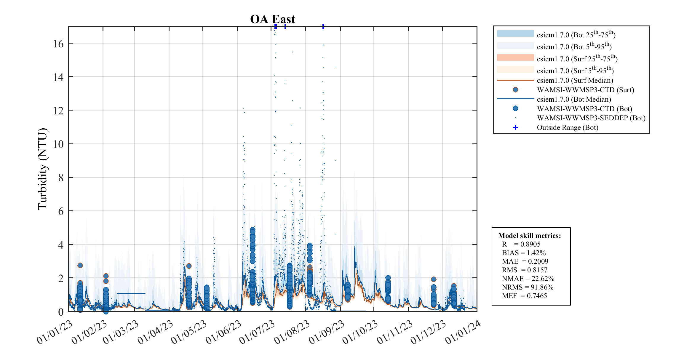 The above analysis shows the model is capturing the the general drivers and variability across the domain, with a balance between particulate inputs to the water column and their subsequent deposition creating a spatiao-temproal pattern that is largely consistent with the observed data-set. The WWMSP3.1 logger deployments in 2023 additionally allow for a more targeted look at sediment resuspension dynamics, based on their high frequency sensor data collected just above the seabed in areas exposed to different wave conditions.