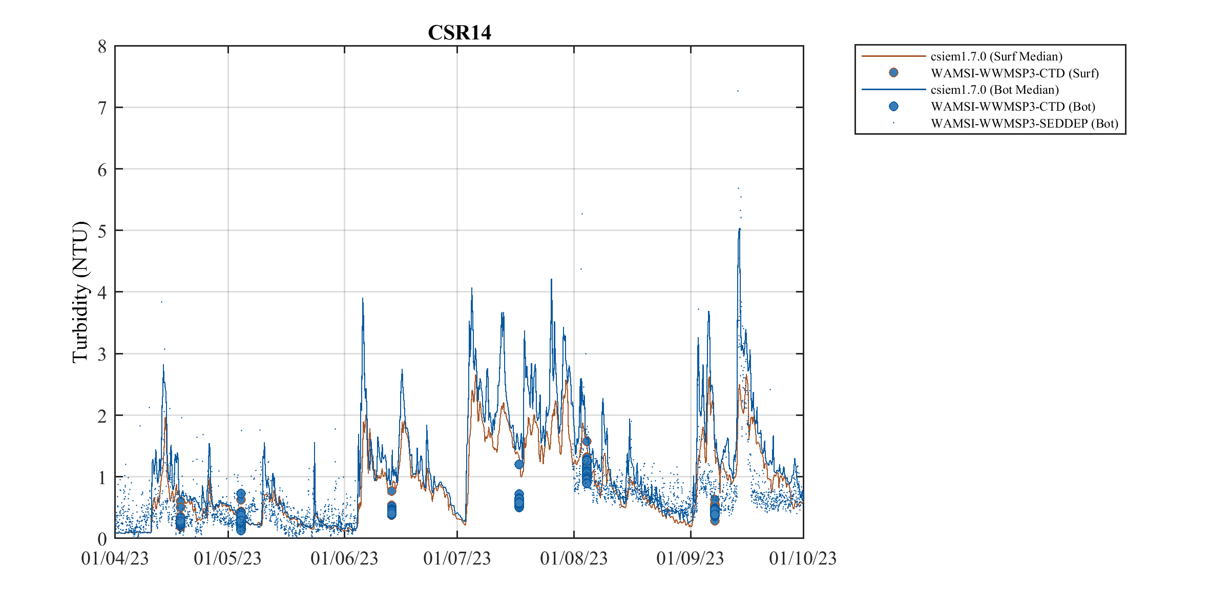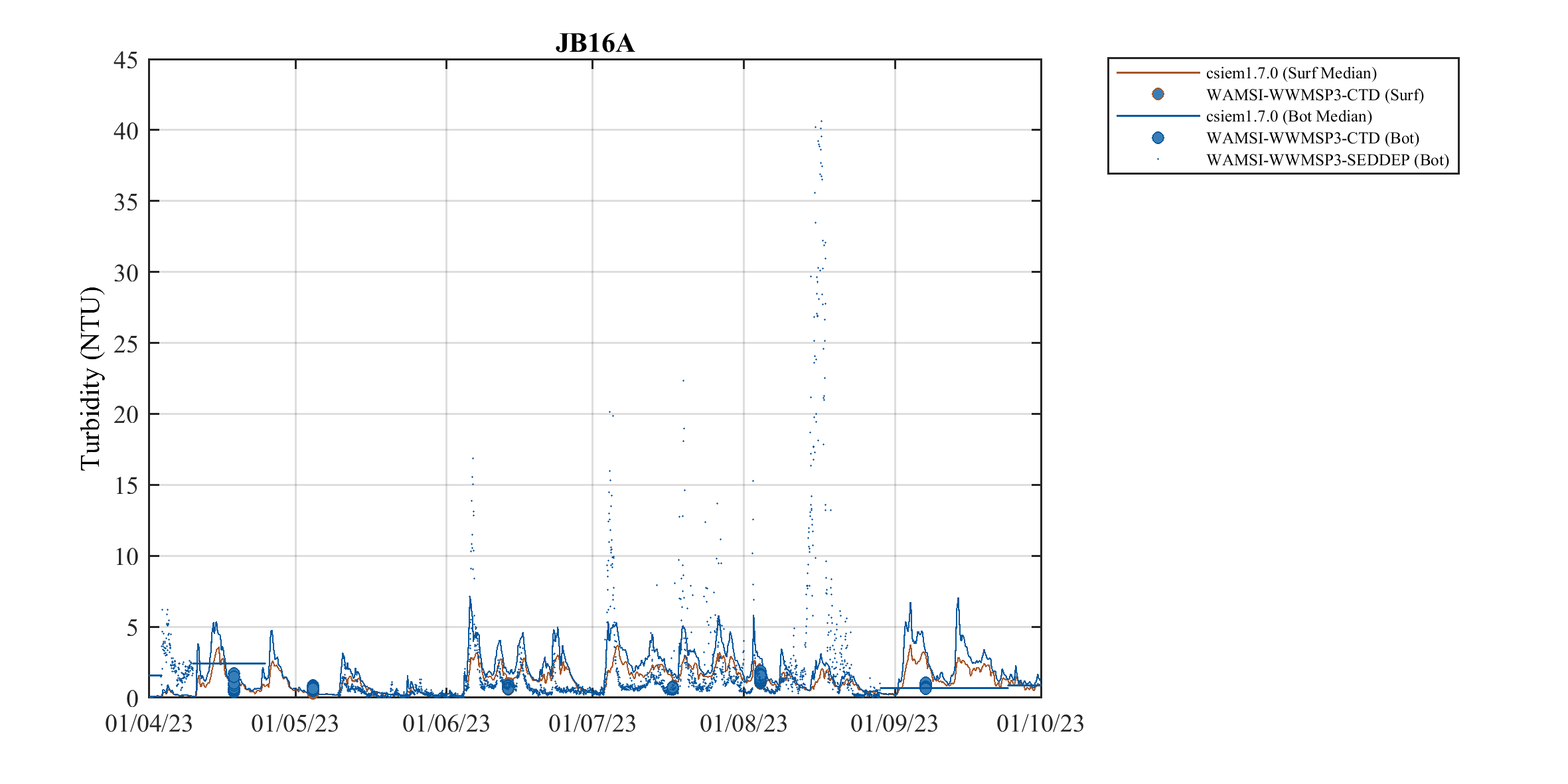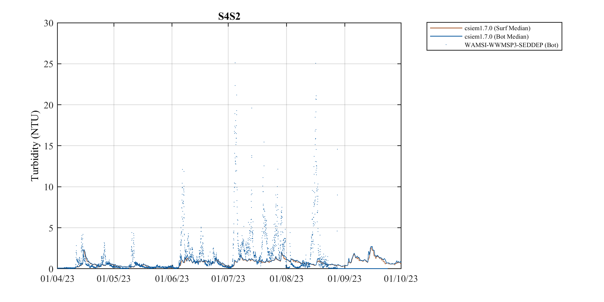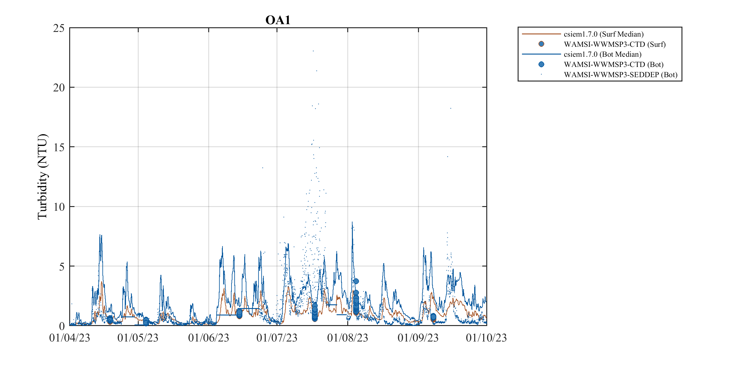The above analysis shows the model is capturing the general drivers and variability across the domain, with a balance between particulate inputs to the water column and their subsequent deposition creating a spatio-temporal pattern that is largely consistent with the observed data-set. The WWMSP3.1 logger deployments in 2023 additionally allow for a more targeted look at sediment resuspension dynamics, based on their high frequency sensor data collected just above the seabed in areas exposed to different wave conditions.