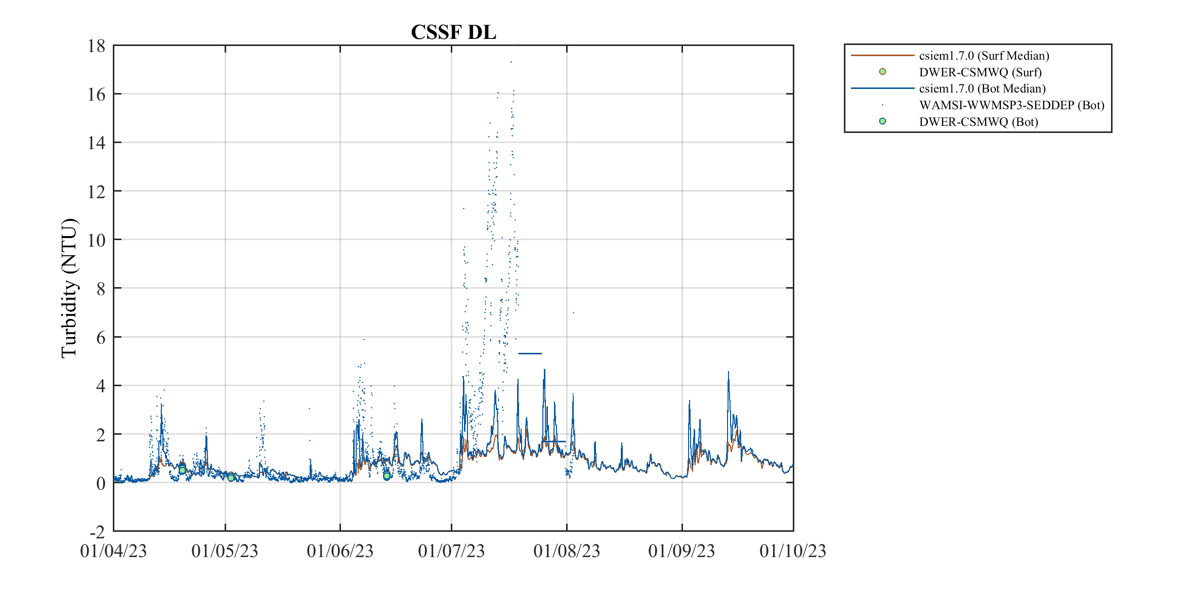 In Figure 15.5 the model is compared against this high-frequency turbidity data-set for a focus period in 2023 where there was a period of high wind events causing several notable turbidity pulses, in addition to nearby independent turbidity measurements from the routine monitoring program. The results show the simulated turbidity responding to the high wind-wave conditions, which generally shows alignment with the logger and monthly profile data.