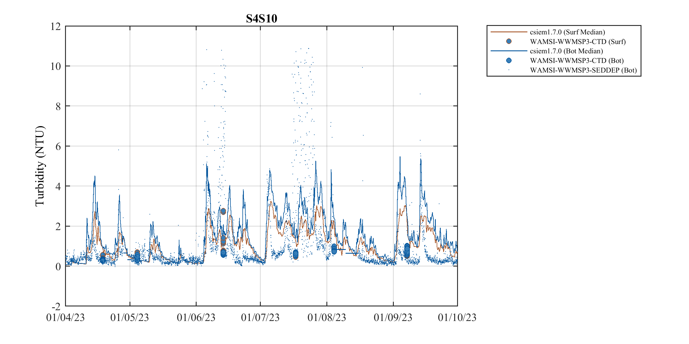 - Storm-driven resuspension events: reproducing the timing and relative magnitude of individual turbidity pulses validated against WWMSP3.1 high-frequency seabed loggers, with the dominant wave–current shear mechanism correctly represented across different exposure regimes