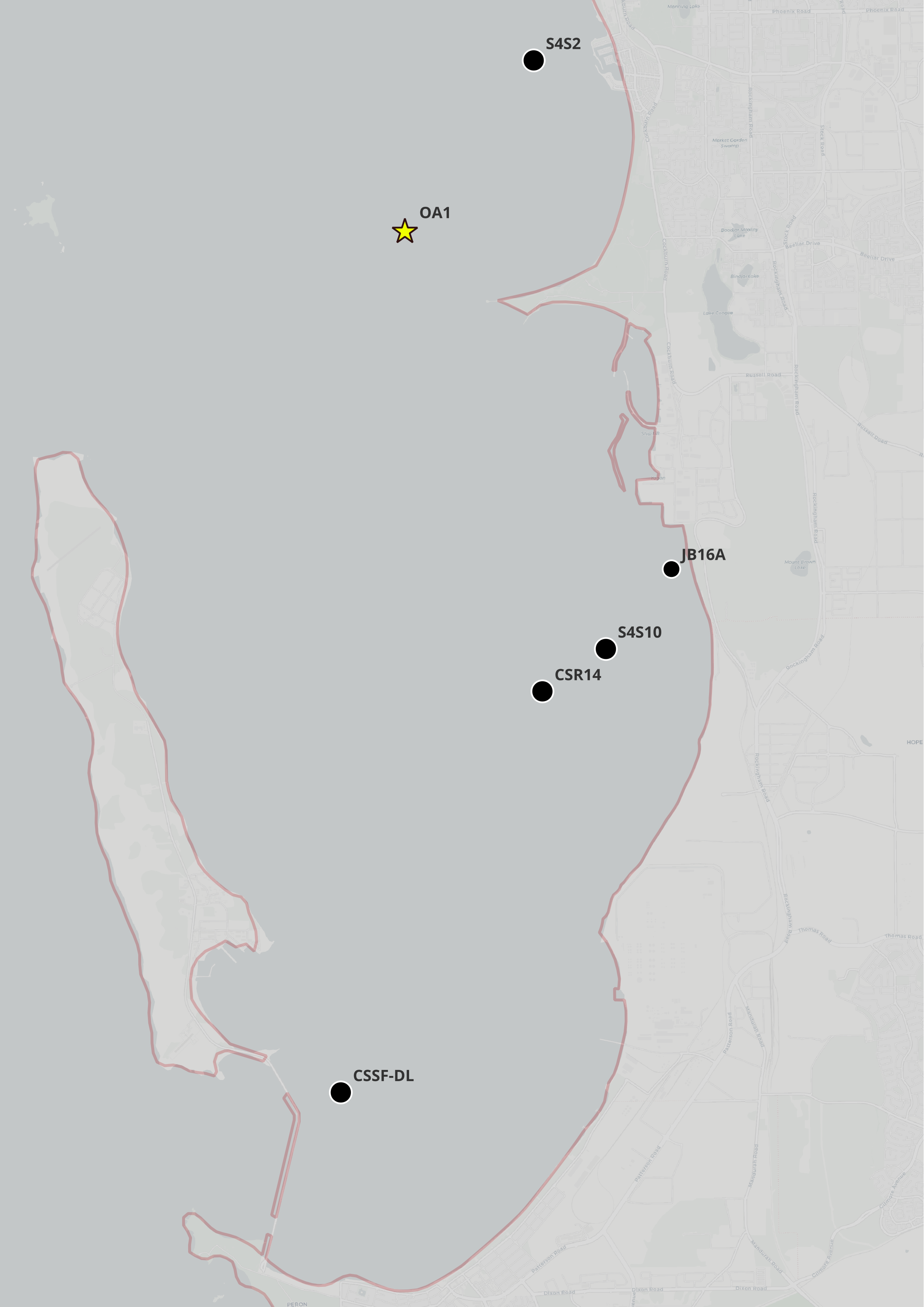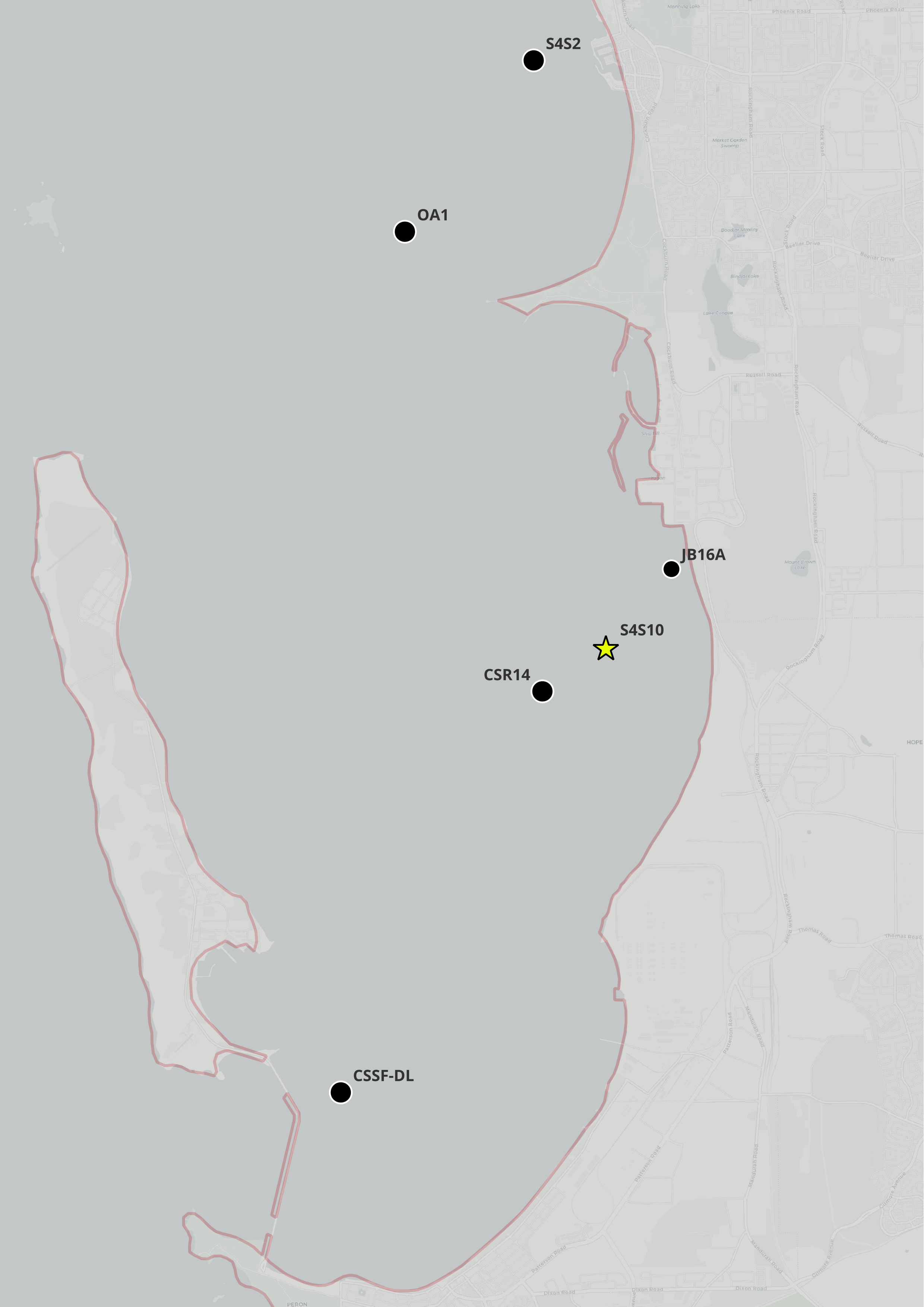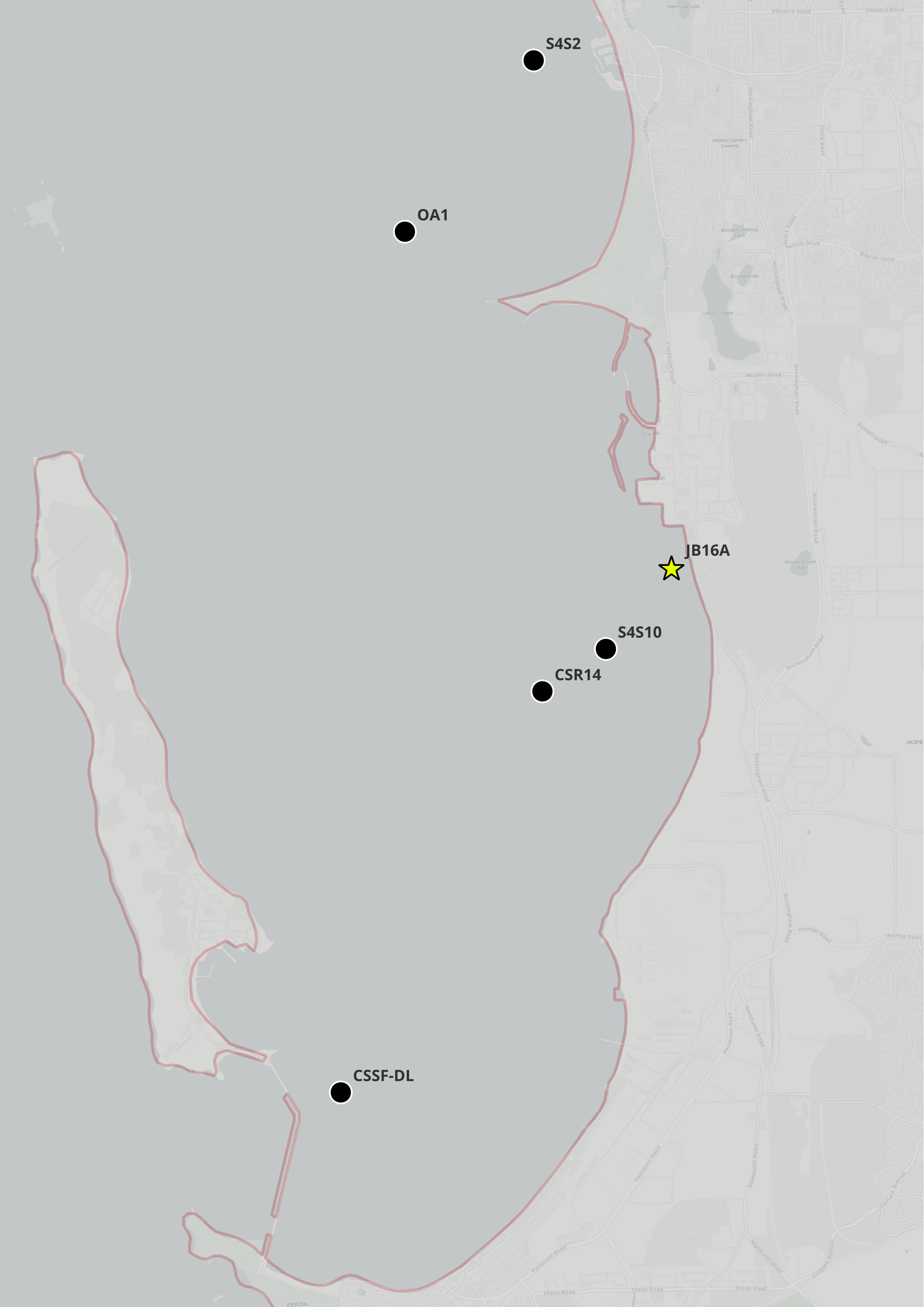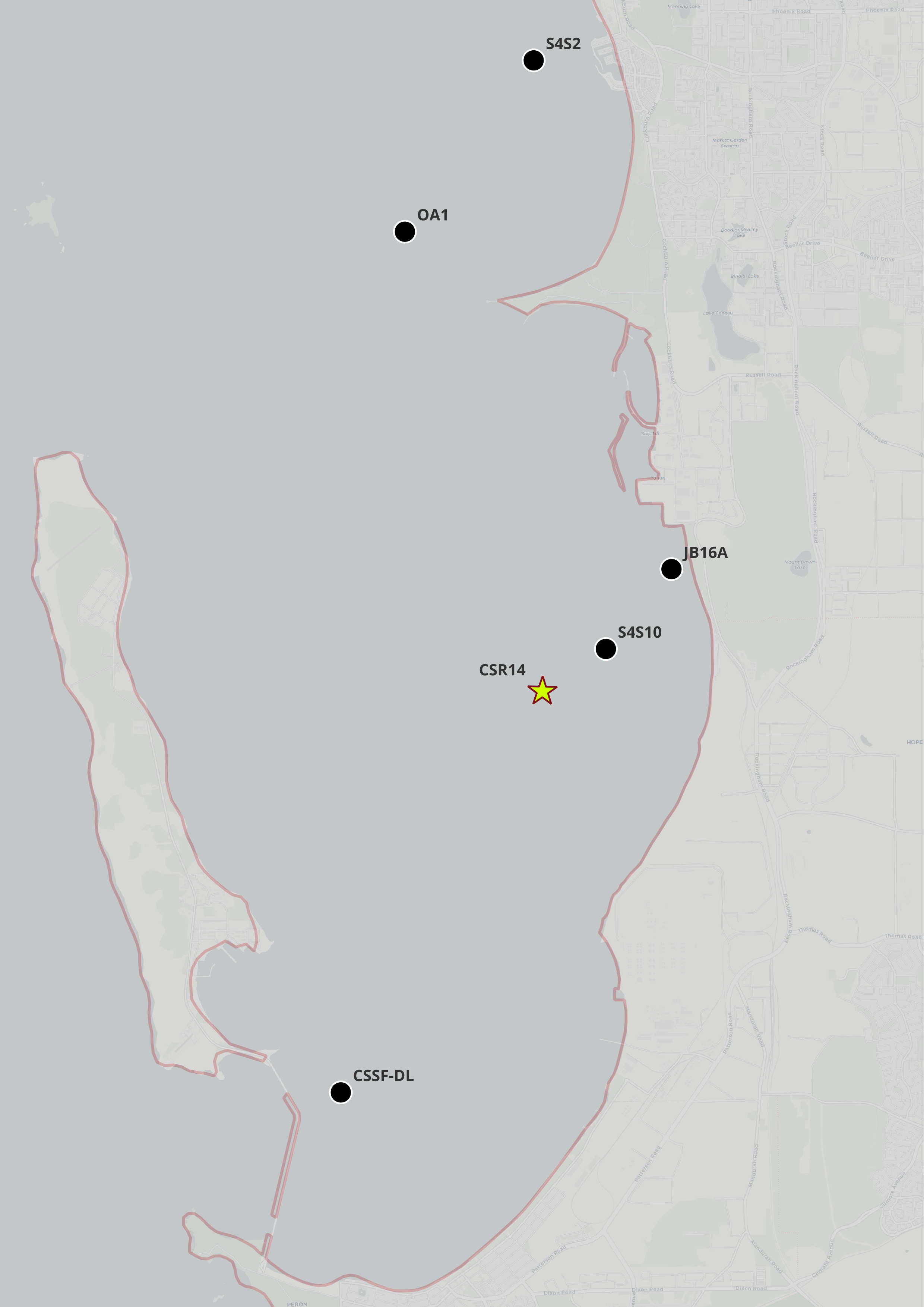 Turbidity within Cockburn Sound and Owen Anchorage is a combination of inorganic and organic particulate matter, with the balance between these two components shifting significantly depending on the underlying environmental conditions. During storms, which predominantly move through in winter, high wave-induced orbital velocities in conjunction with elevated water currents lead to high seabed shear stresses (exceeding \(1\: N/m^2\)). This drives substantial resuspension of even coarse sediments and creates spikes of turbidity (WWMSP3.1 report). In contrast, in calmer conditions, higher rates of phytoplankton productivity increase particulate algal matter and detritus in the water which can dominate the water optical conditions and persist for longer periods (O2M, 2025). Across the different environments along the coast, and throughout the year, there exists a continuum of conditions reflecting the interplay of these two processes. This is further complicated by dredging and wash-plant activity near Woodman Point, and the diversity of plumes associated with shipping and berthing along the coast of Cockburn Sound.