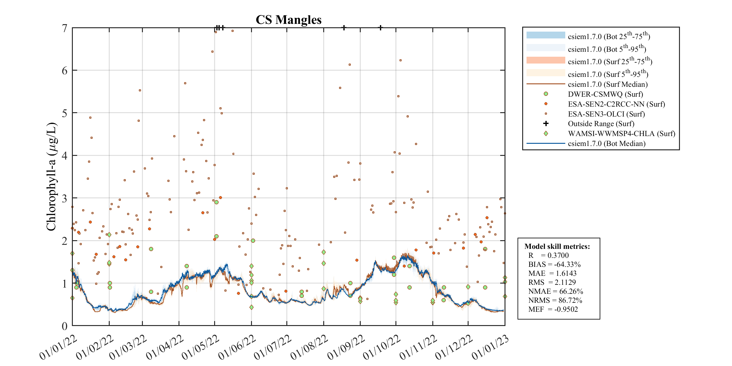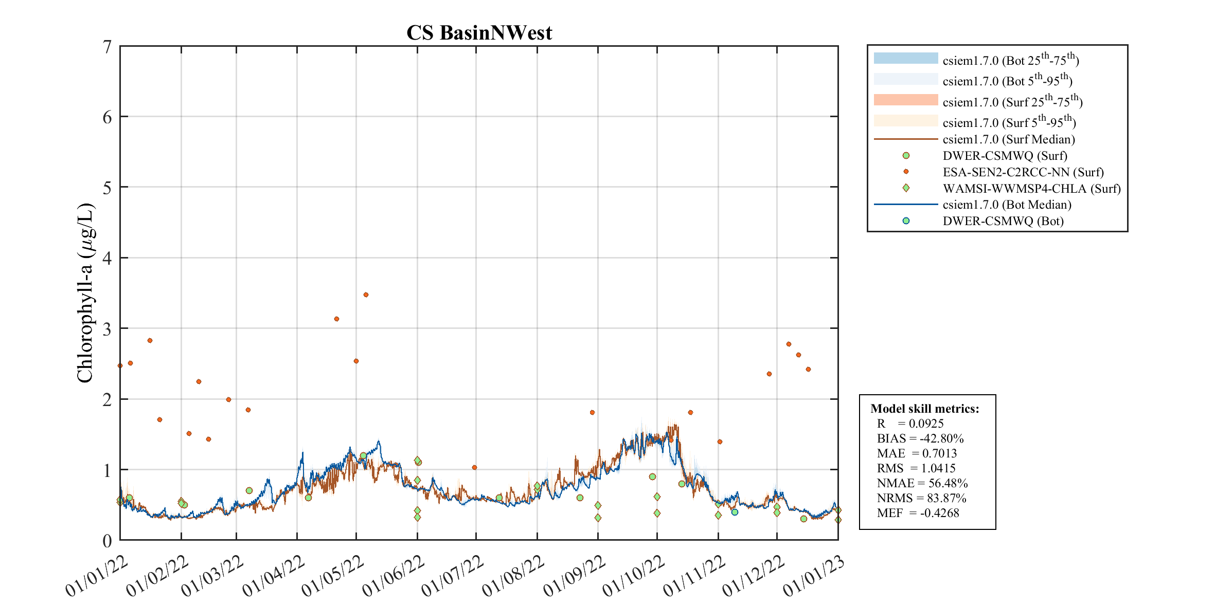 Figure 12.X-v. Simulated versus observed chl-a concentrations, comparing two satellite data-sets, two grab sample programs and the CSIEM predictions. Note the “ESA-SEN3-OLCI” imagery is not calibrated to Cockburn Sound conditions and shows a consistent bias which dominates the error in the model skill metrics.