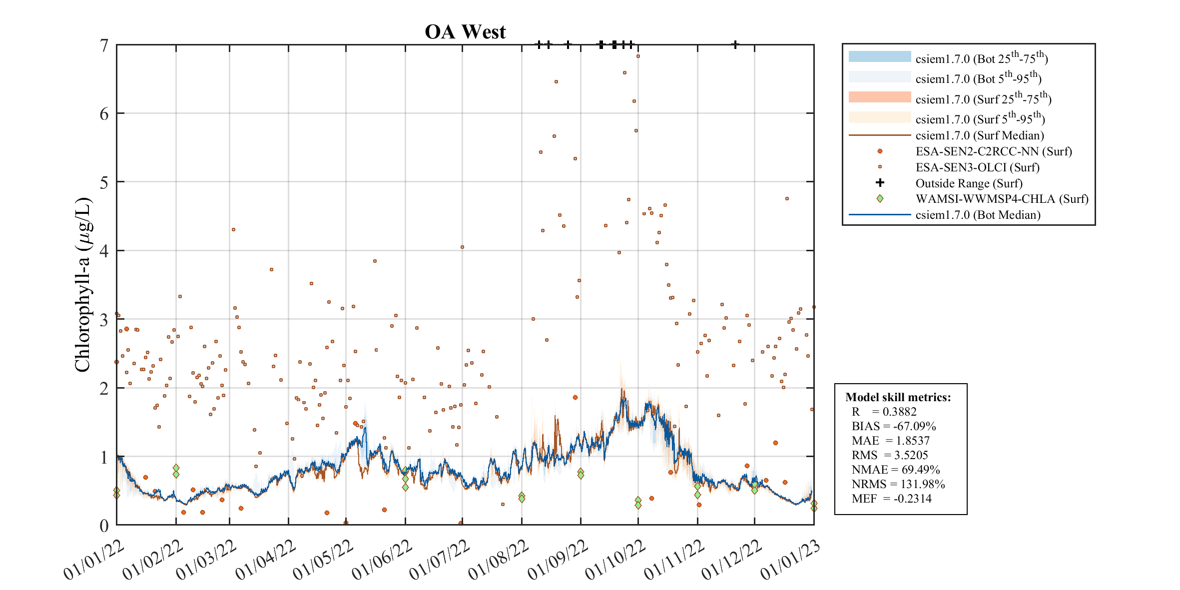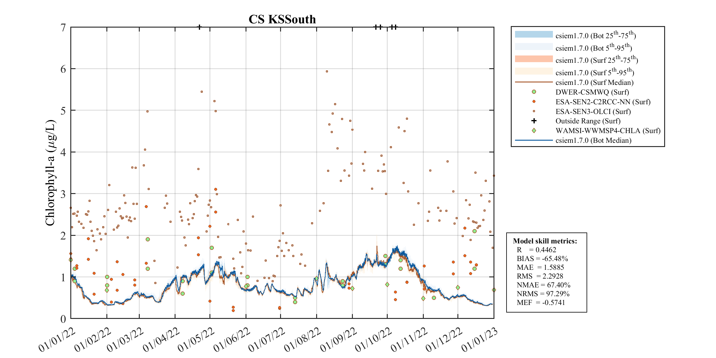 In addition, the CSIEM data platform has also archived Sentinel 2 and Sentinel 3 imagery for the period from 2015 - 2024. These images have applied pre-existing algorithm for chl-a estimation and are not yet accurately calibrated to local conditions, however, they have been analysed to assess spatio-temporal patterns in chlorophyll-a, and used to support model validation where possible.