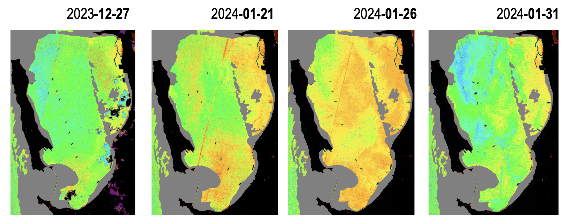 To explore this dynamic, a period of “mild” bloom conditions not associated with inflows was identified and examined in the CSIEM simulations. The period of January 2024, described above associated with stratification and hypoxia, was chosen as a series of consecutive satellite images were identified showing a bloom progression sequence (Figure 12.XX), which shows the emergence of the bloom from the beginning of Janurary to the 26th, and then its rapid dissipation.