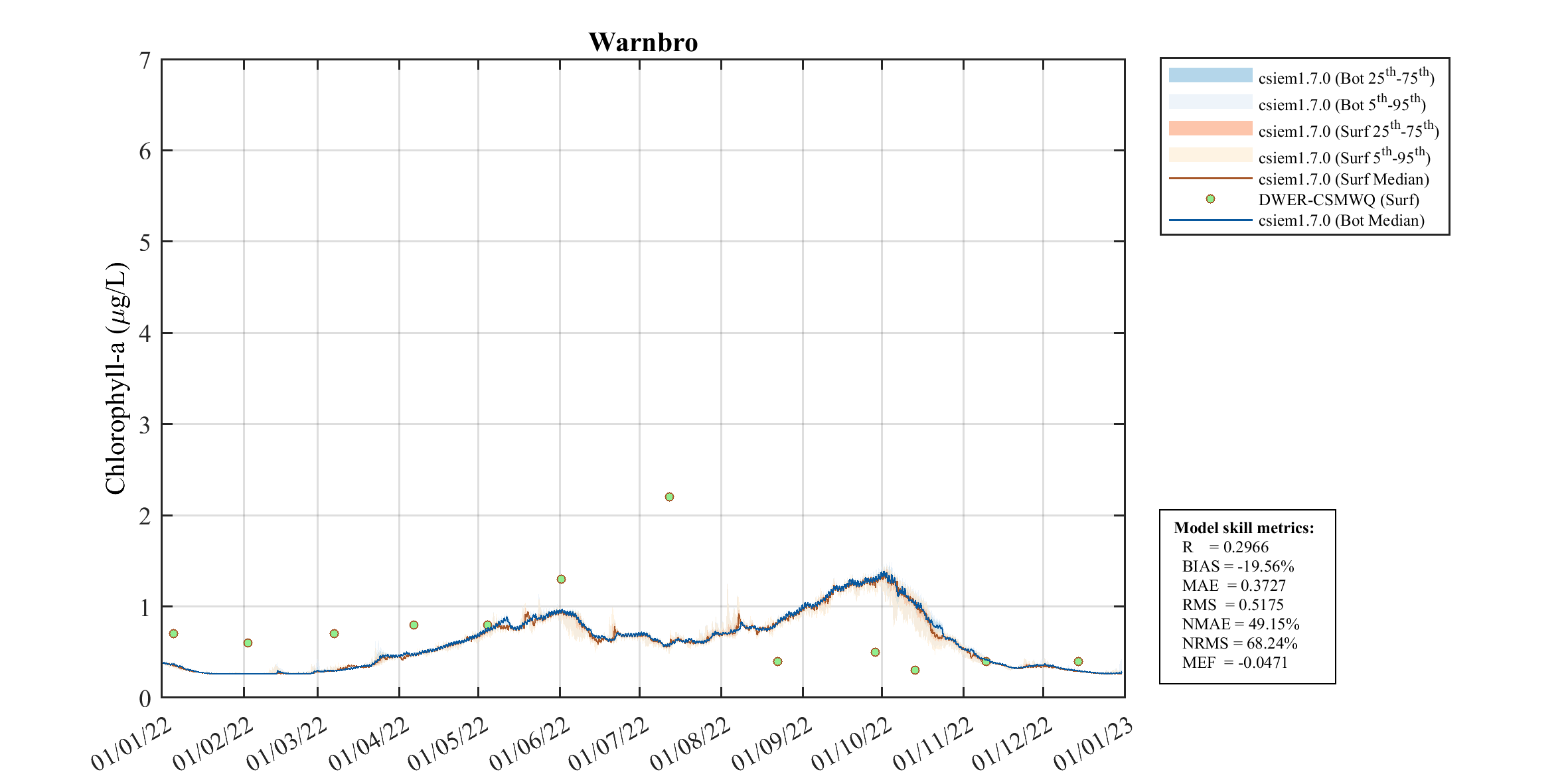 Figure 12.X-i. Simulated versus observed chl-a concentrations, comparing the CSMC grab sample programs and the CSIEM predictions.