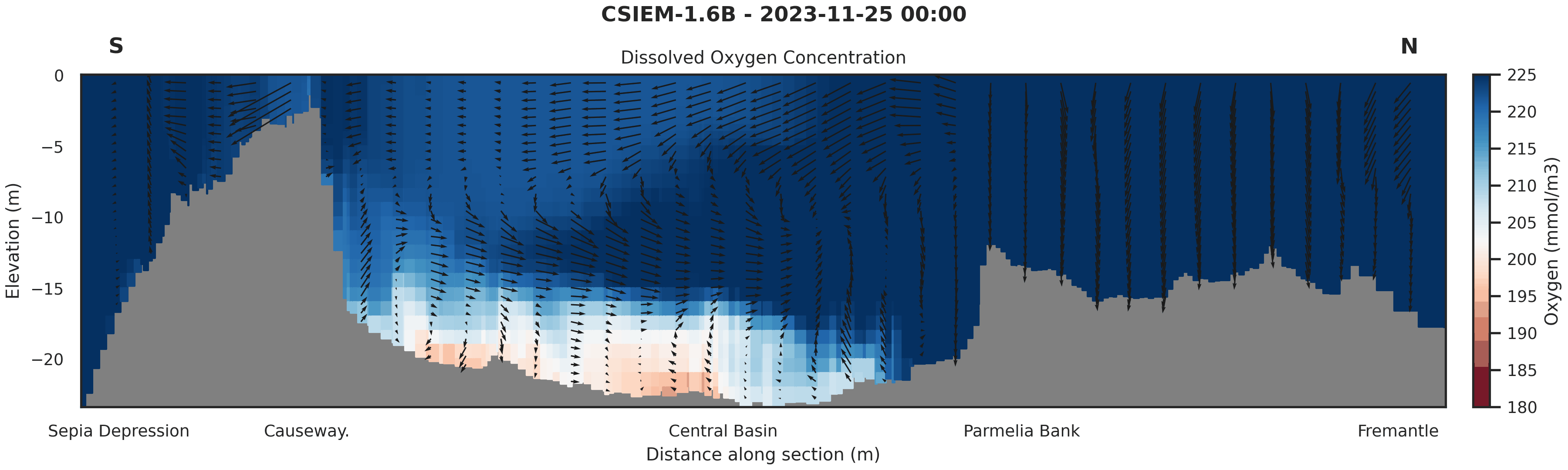 Figure 12.6 Transect animation of CSIEM dissolved oxygen (\(OXY\_oxy\)) variable and vertical current vectors, highlighting variability in water flow direction, “hypoxic dome” behaviour. Note the two-layer exchange between CS and OA causing periodic “ventilation” of bottom waters.