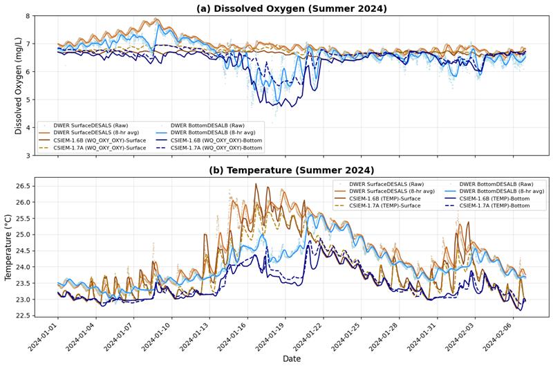 Figure 12.9 Surface and bottom time-series of (a) dissolved oxygen and (b) temperature, comparing the model predictions and observations at the DWER “DESAL” mooring.