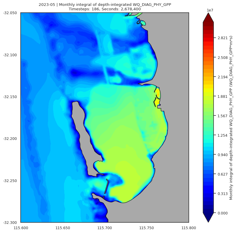 Water-column productivity in Cockburn Sound is driven by nutrient supply and light availability, and moderated by patterns of stratification and rates of horizontal exchange and mixing. Nutrient inputs arise predominately from (winter) catchment inputs, groundwater discharge and (summer) sediment recycling, with nitrogen generally considered to limit phytoplankton growth. The animation from the model highlights the interplay of these factors (Figure 12.X).